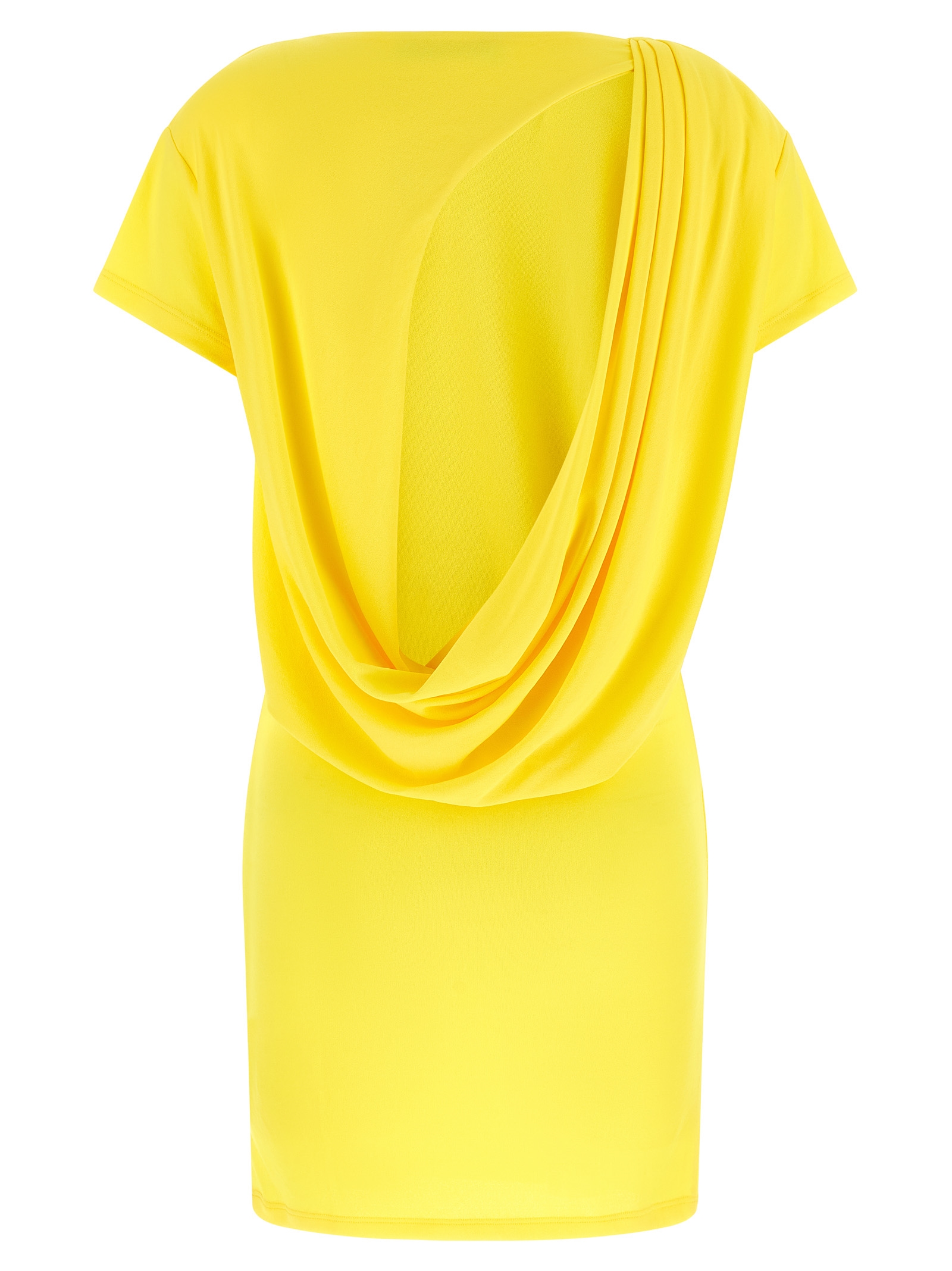 ‘La Robe Mistral’ minidress in fluid viscose jersey with tone-on-tone logo embroidery on the front, boat neck, wide cut-out and back draping, and short sleeves.