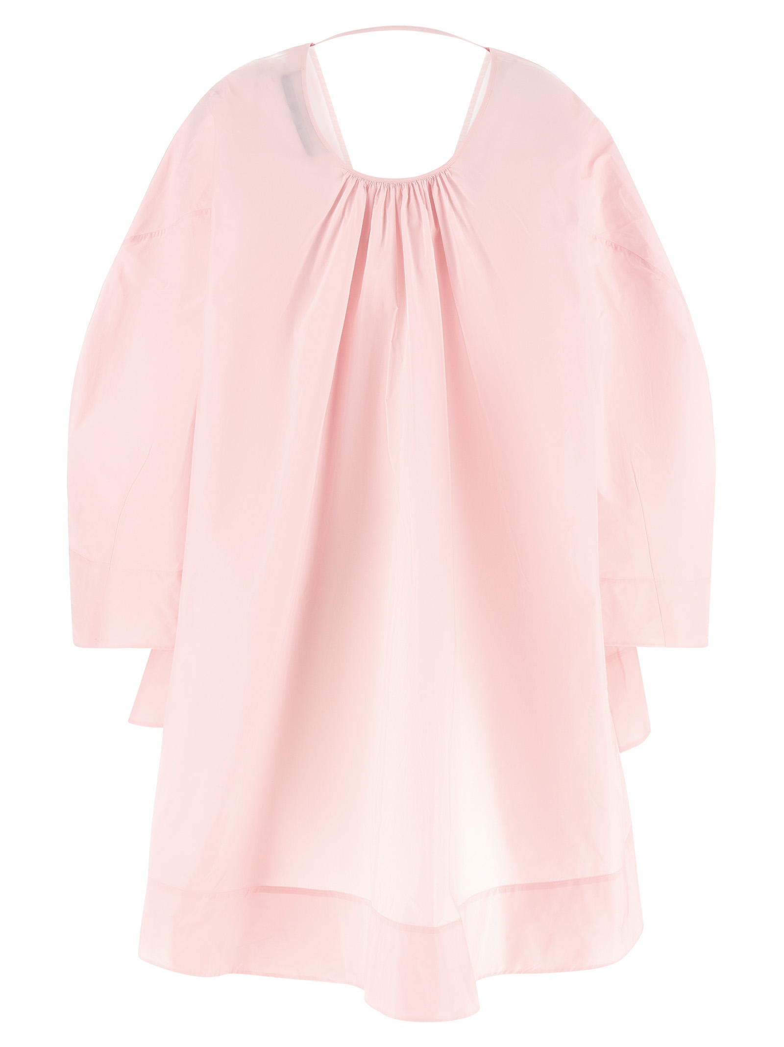 ‘La Robe Paysan’ mini dress in textured transparent cotton poplin with tunic style, flared silhouette, wide front V-neck, wide and curved long sleeves, round back neckline with fixing strap, rounded and asymmetrical hem.
