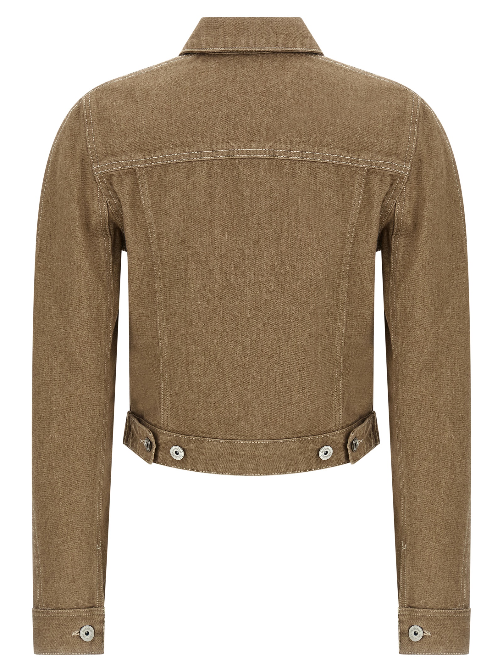 Workwear ‘la veste ovalo cargo’ cotton denim jacket with oval cut, pointed collar, front closure with hidden buttons, patch pocket with ‘J’ stitching detail, adjustable side tabs with buttons, long sleeves with cuffs and buttons.