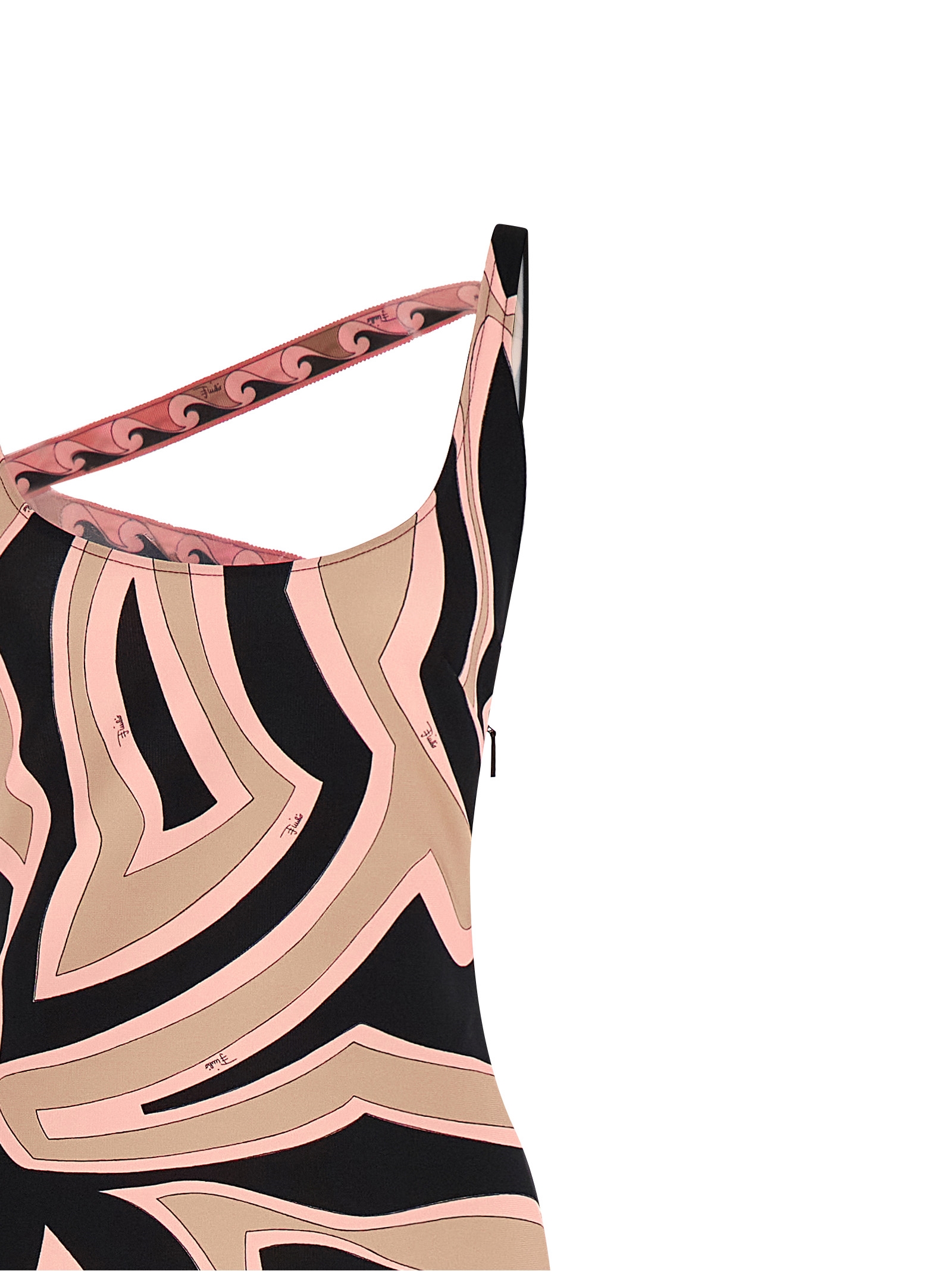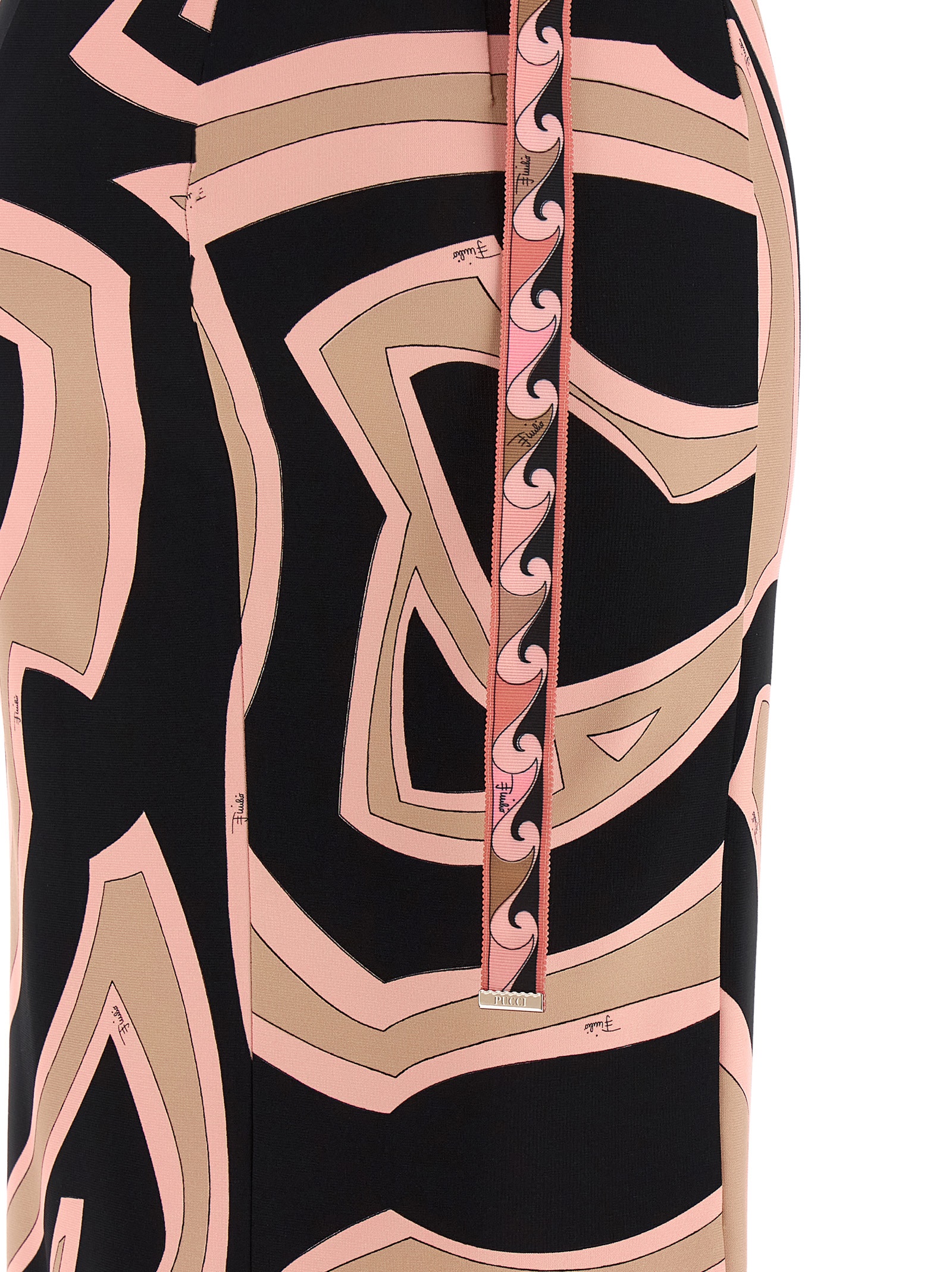Long ‘compact jersey’ dress with all-over ‘Labirinto’ print, straight design, side zip closure, deep back neckline with adjustable printed grosgrain tape with buckle.