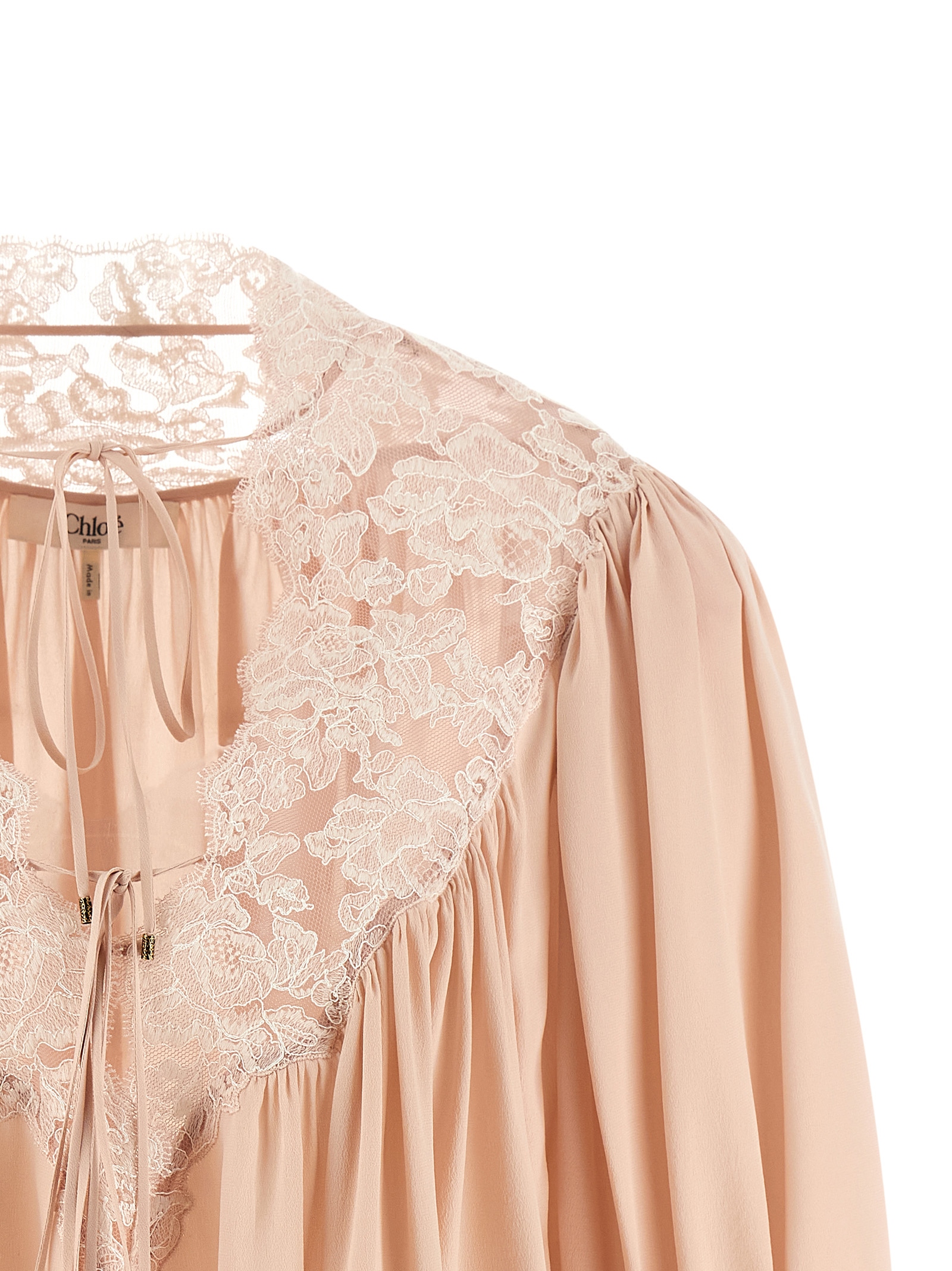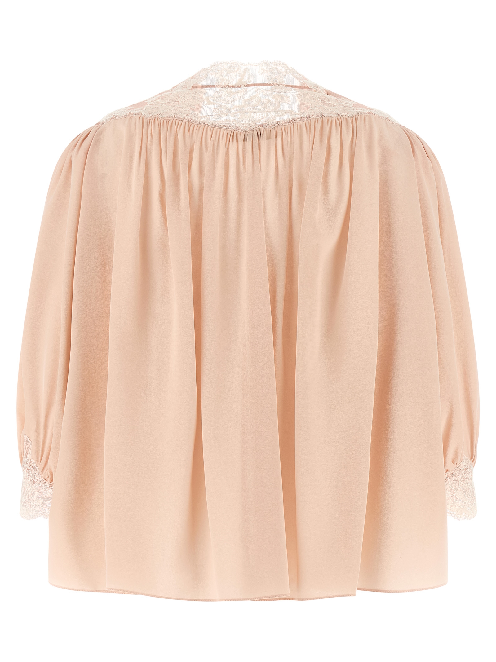 Silk crêpe blouse, loose fit with curls, neckline with lace inserts and knotted laces, 3/4 wide sleeves with lace cuffs on the bottom and buttons.