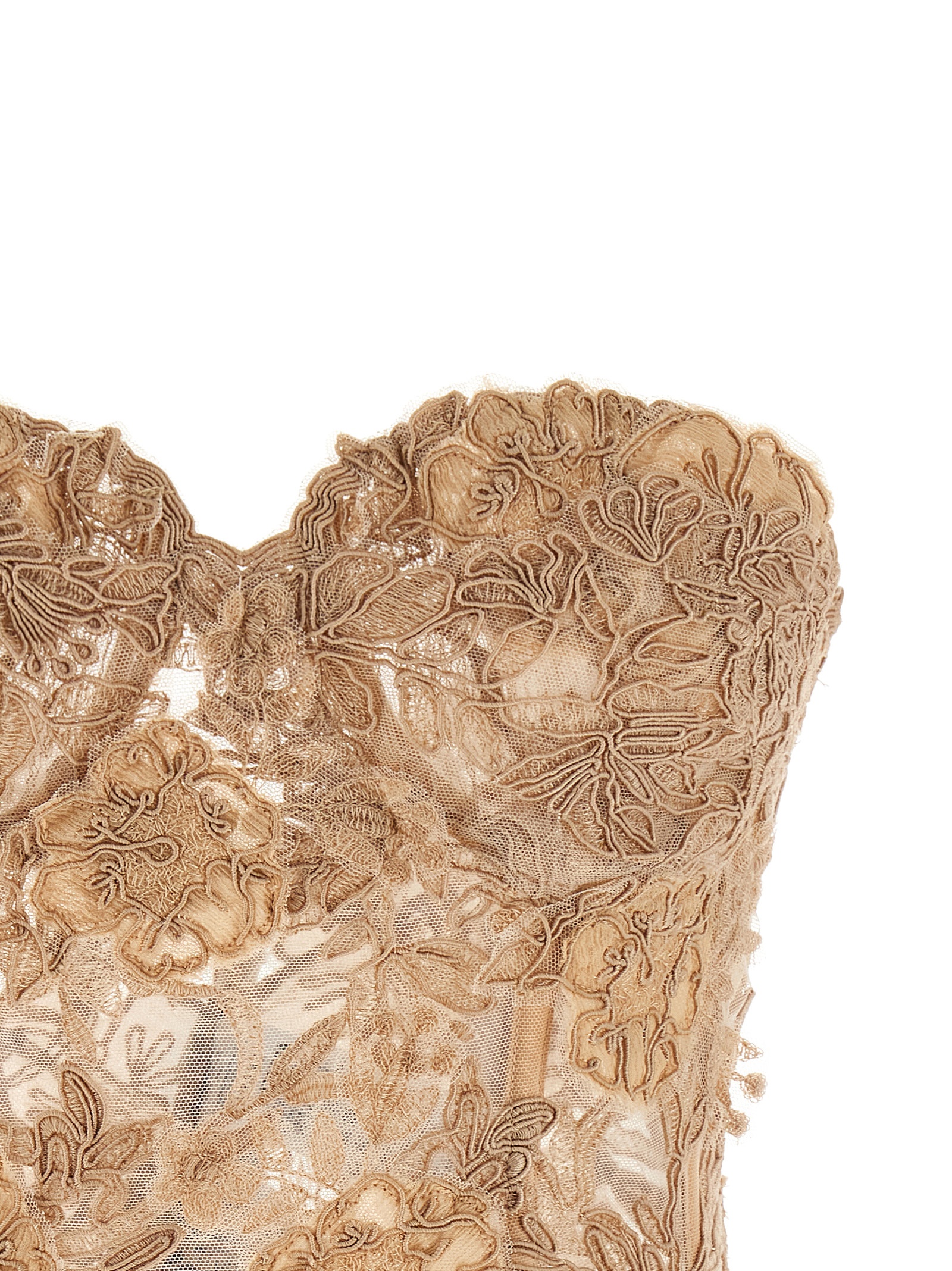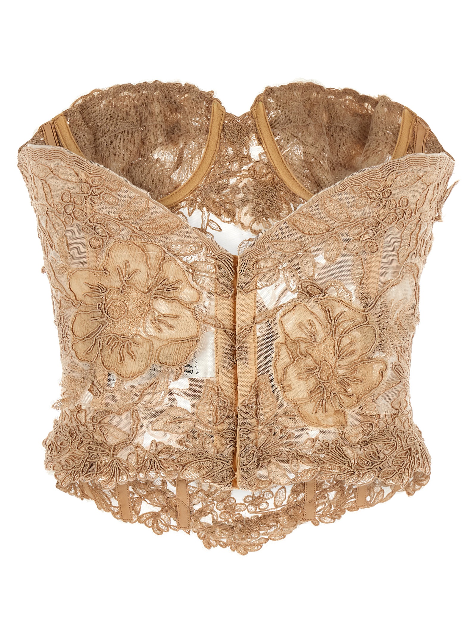 Rebrodè lace top placed with I don’t see effect details, crop bustier model, slatted structure, sweetheart neckline, back zip closure, asymmetrical hem.
