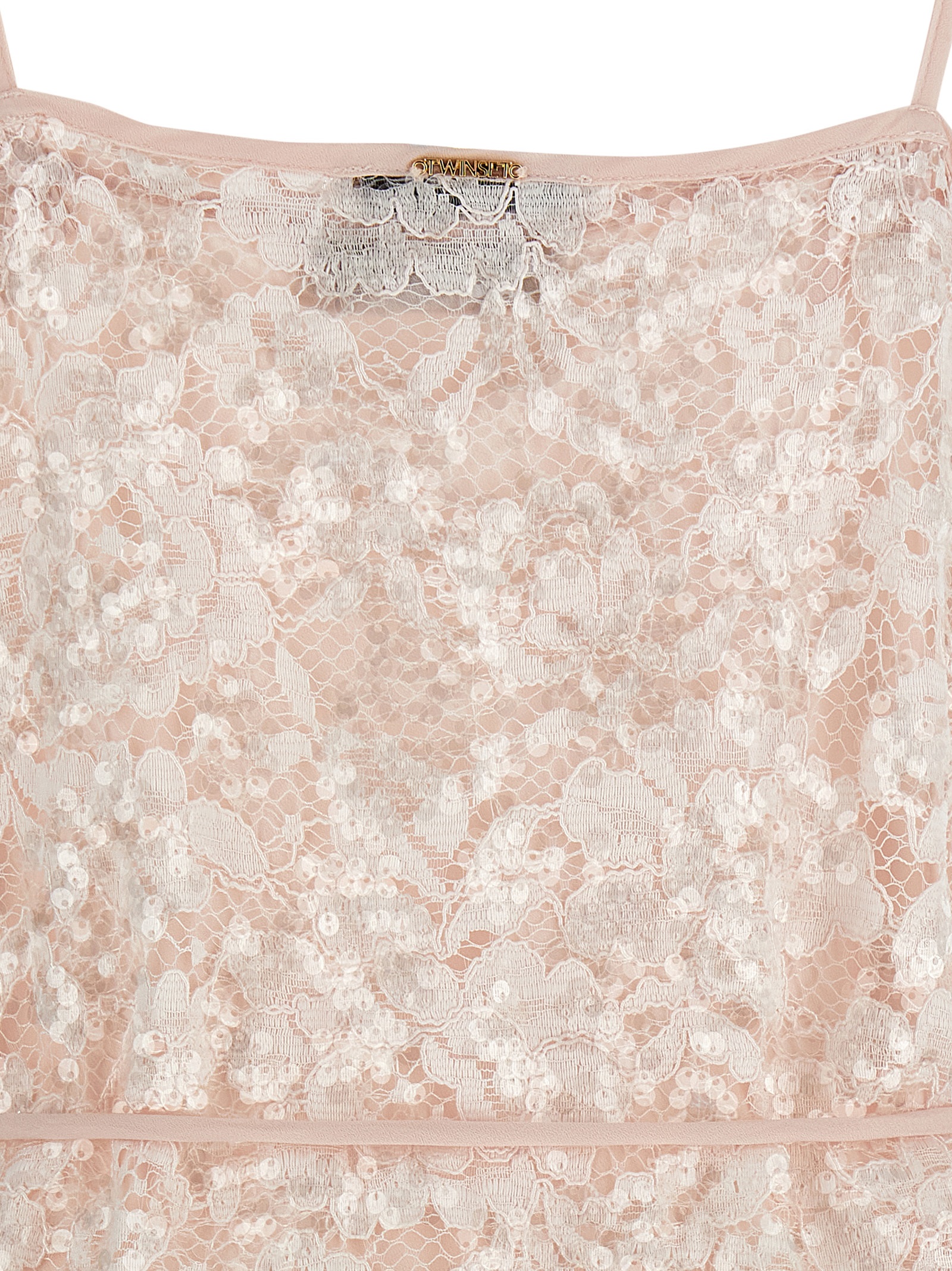 Semi-transparent lace midi dress with all-over tone-on-tone sequin appliqué, longuette model, V-neck, thin straps, sleeveless, side zip closure, removable belt, removable crepe de Chine petticoat.