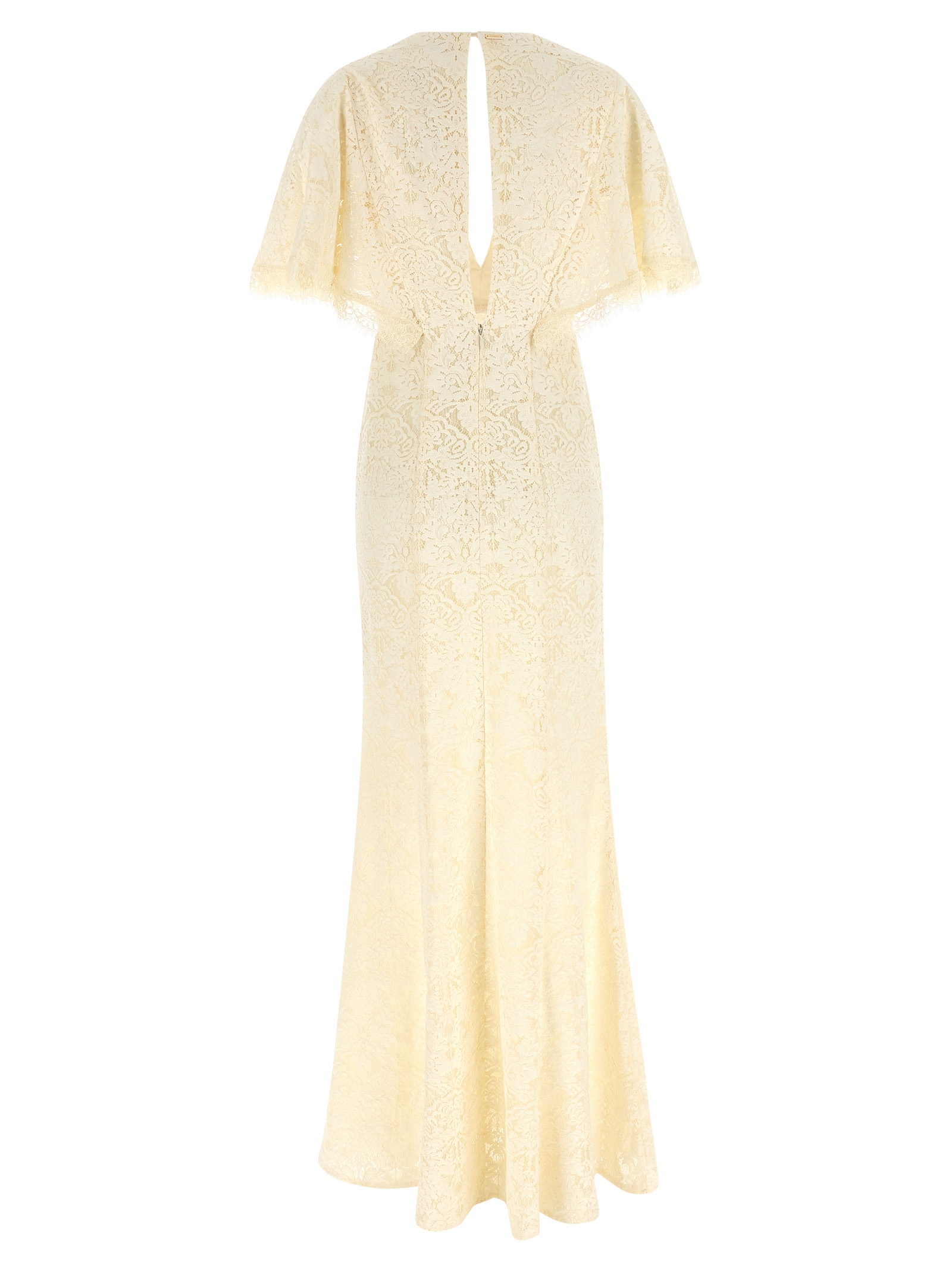 Long lace dress, plunge V-neck, tight silhouette with mermaid hem, ruffle sleeves with scallops at the bottom, teardrop back opening with button, zip closure on the side.