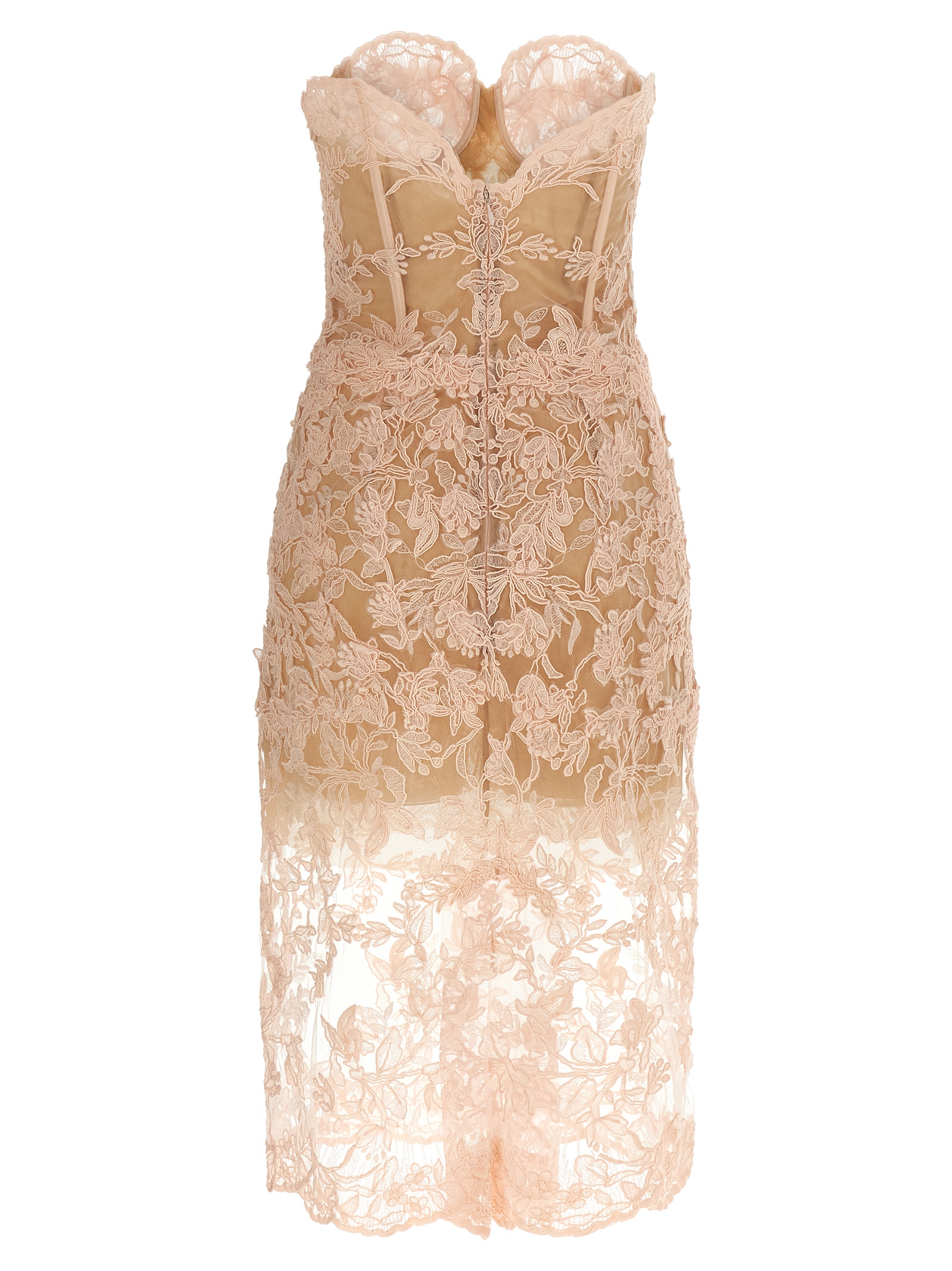 Off-the-shoulder tulle and lace midi dress with corset top, inner cues, front heart-shaped neckline, lining, wide V-neck, zip closure and back split.