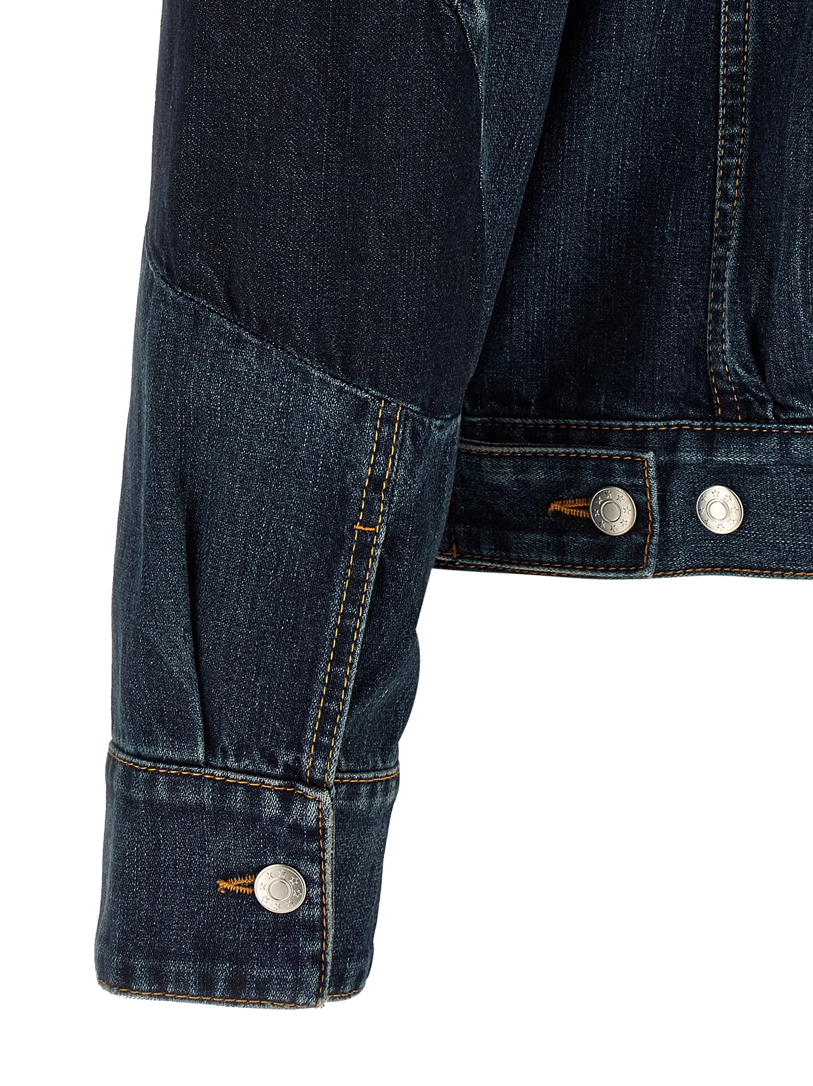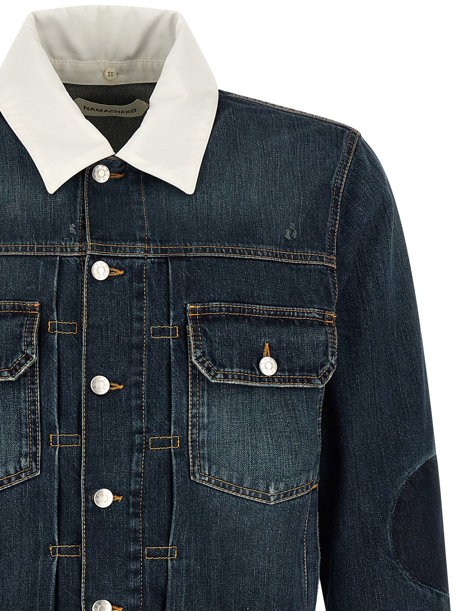 ‘Laguna’ jacket in cotton denim aged by brushing over the entire surface and washed with stones, contrast stitching, double shirt collar, one of which in