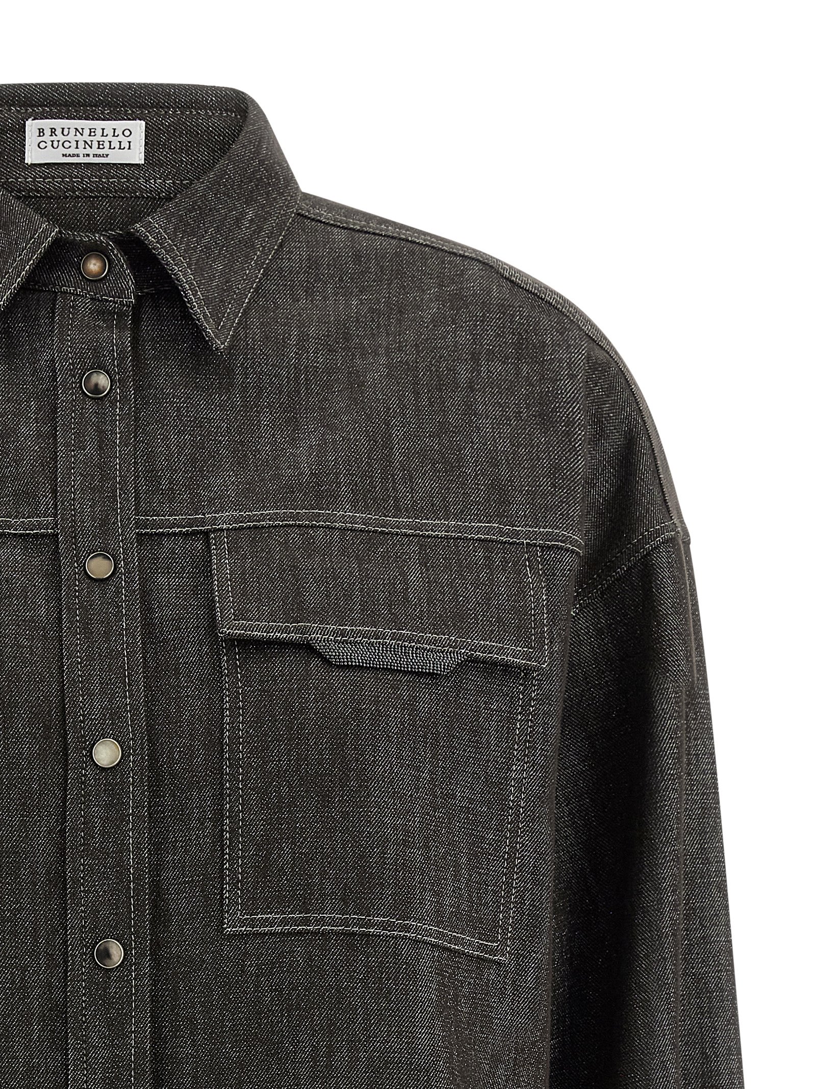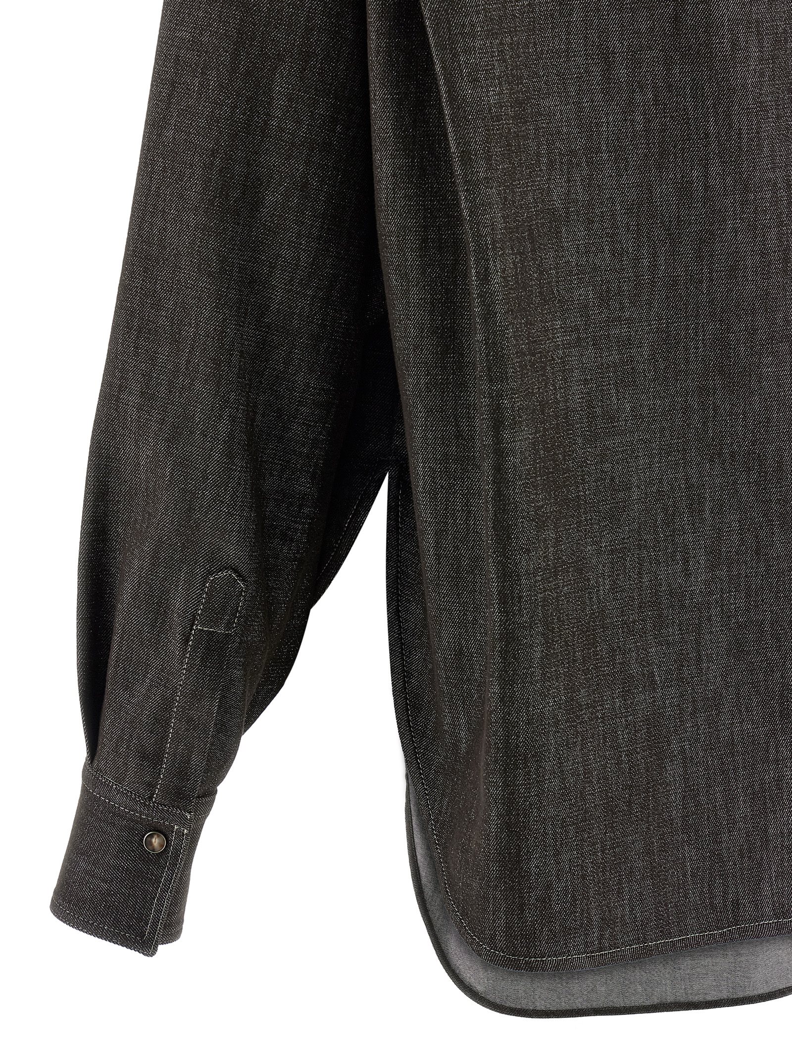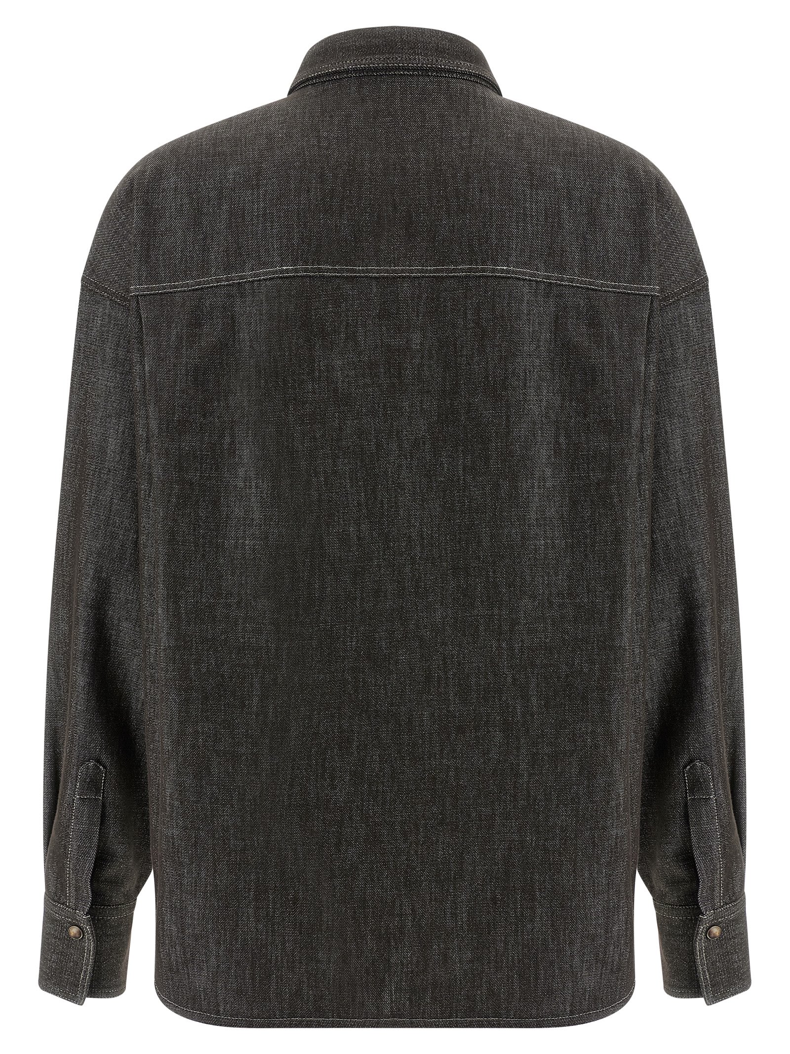 Sparkling no fade denim shirt in cotton and viscose blend with lamé thread, contrast stitching, front snap button closure, breast pocket with Monile ‘Shiny Flap Detail’, long sleeves with cuffs and dropped shoulders, side slits, and asymmetric hem.