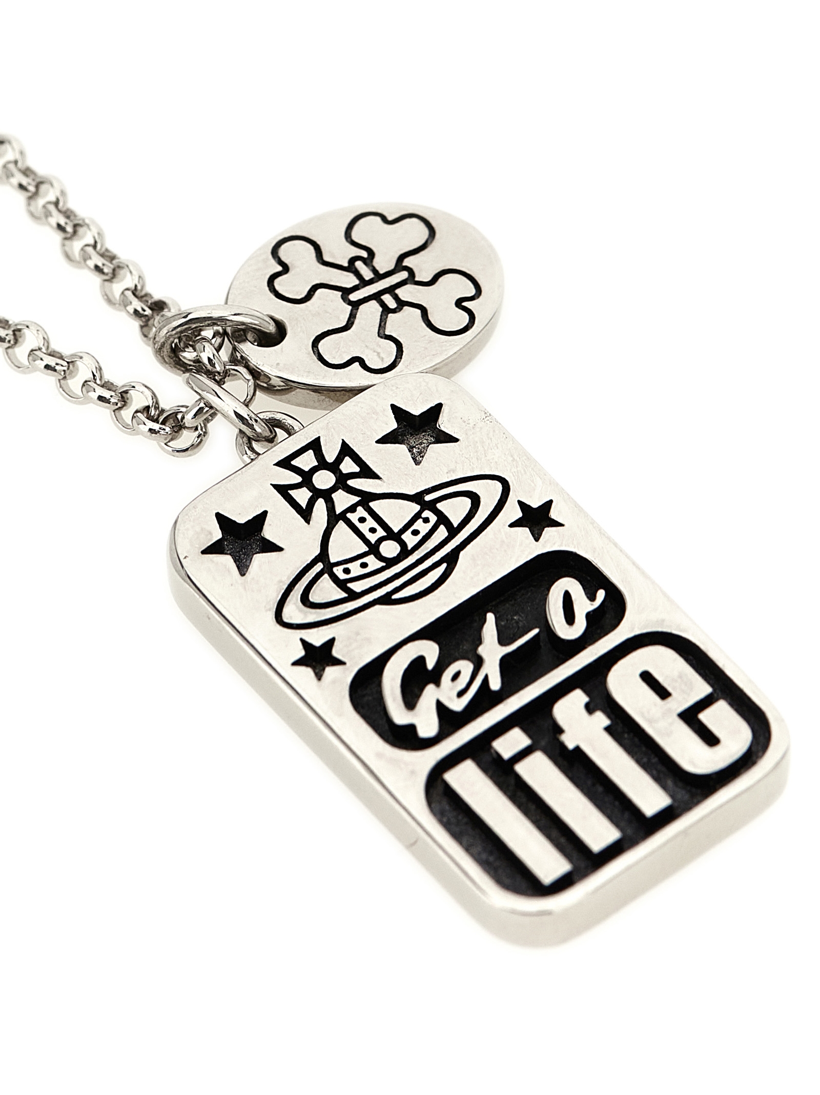 ‘Lancelot Pendant’ necklace in silver chain with circular links, logo lettering tags and logo.