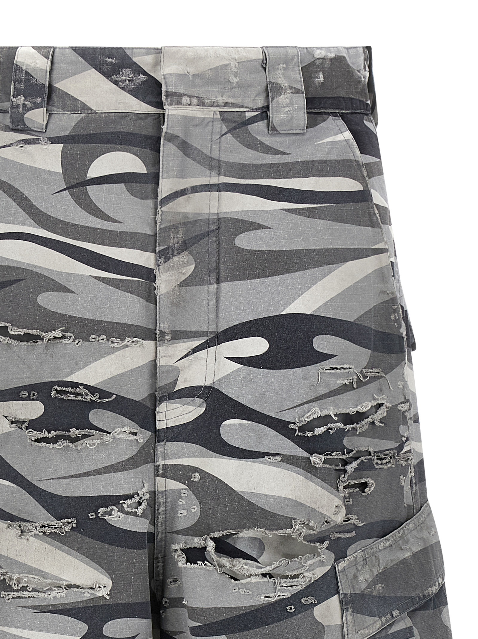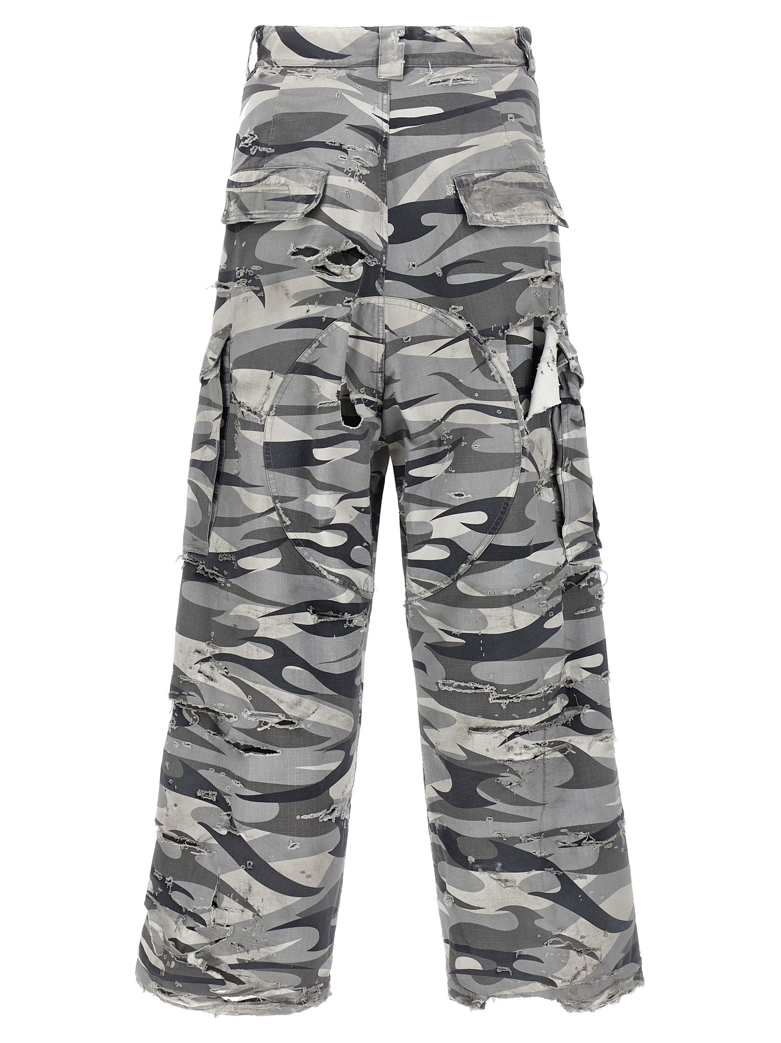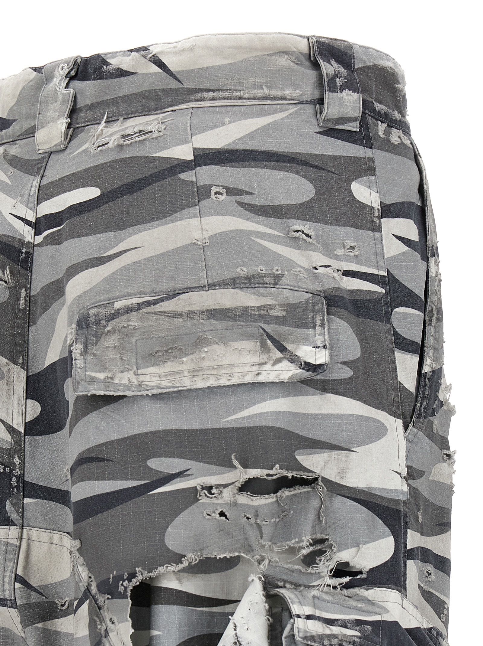 ‘Large Cargo’ double layer camouflage print cotton pants with broken and torn top, cargo pockets, wide and straight leg, zip and snap button closure, low crotch, pockets.