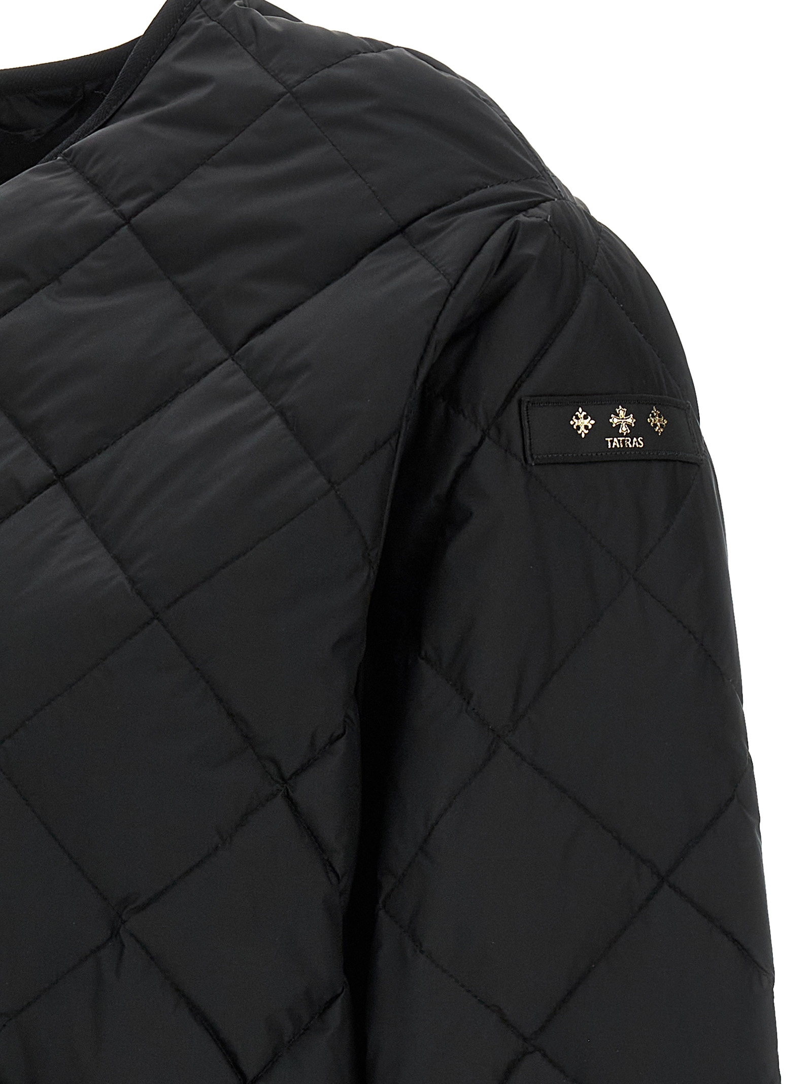 ‘Larissa’ slightly glossy taffeta down jacket with diamond quilting, light V-neck, front snap button closure, long sleeves with dropped shoulders and logo patch appliqué, rounded and asymmetrical hem.