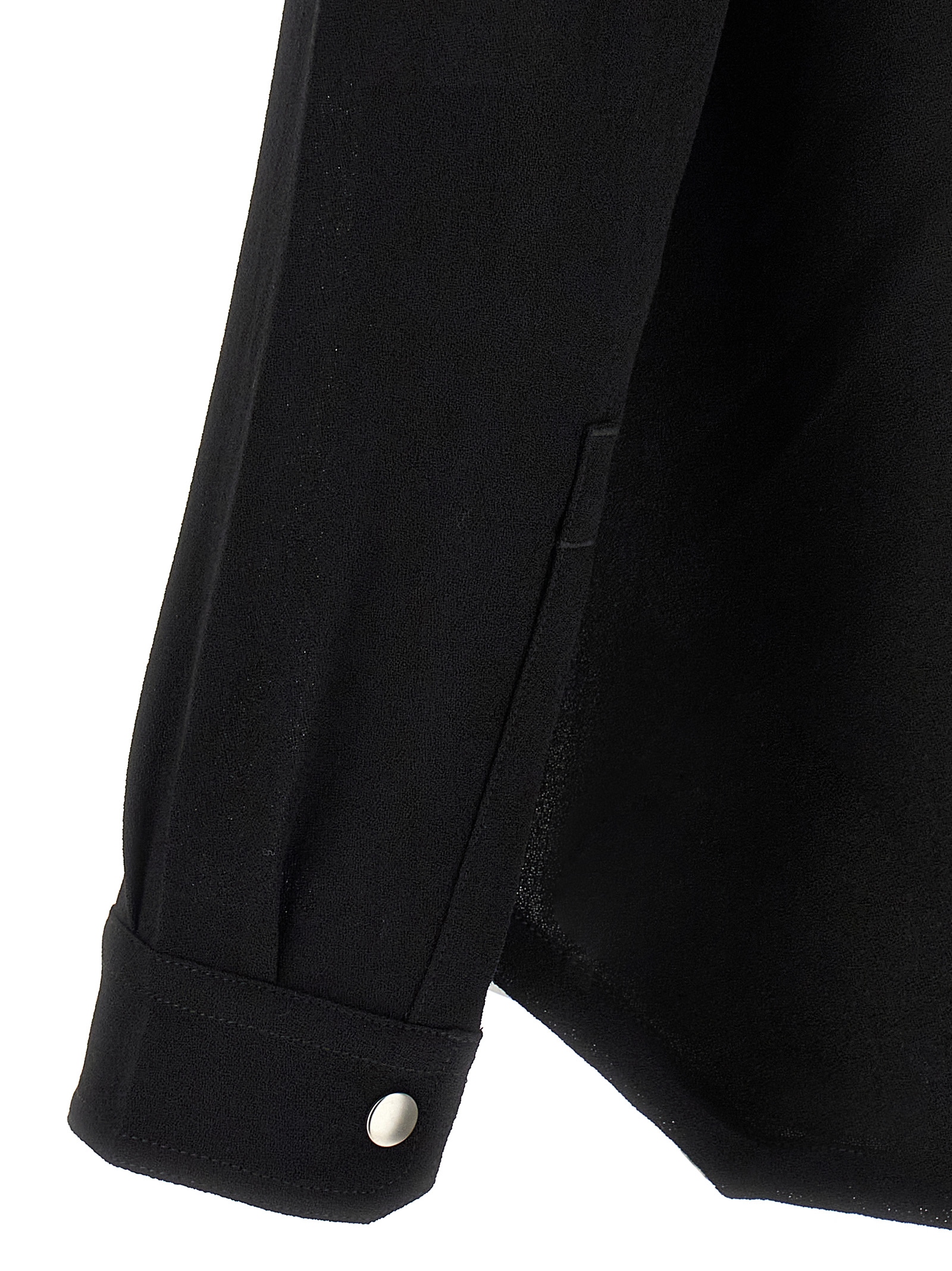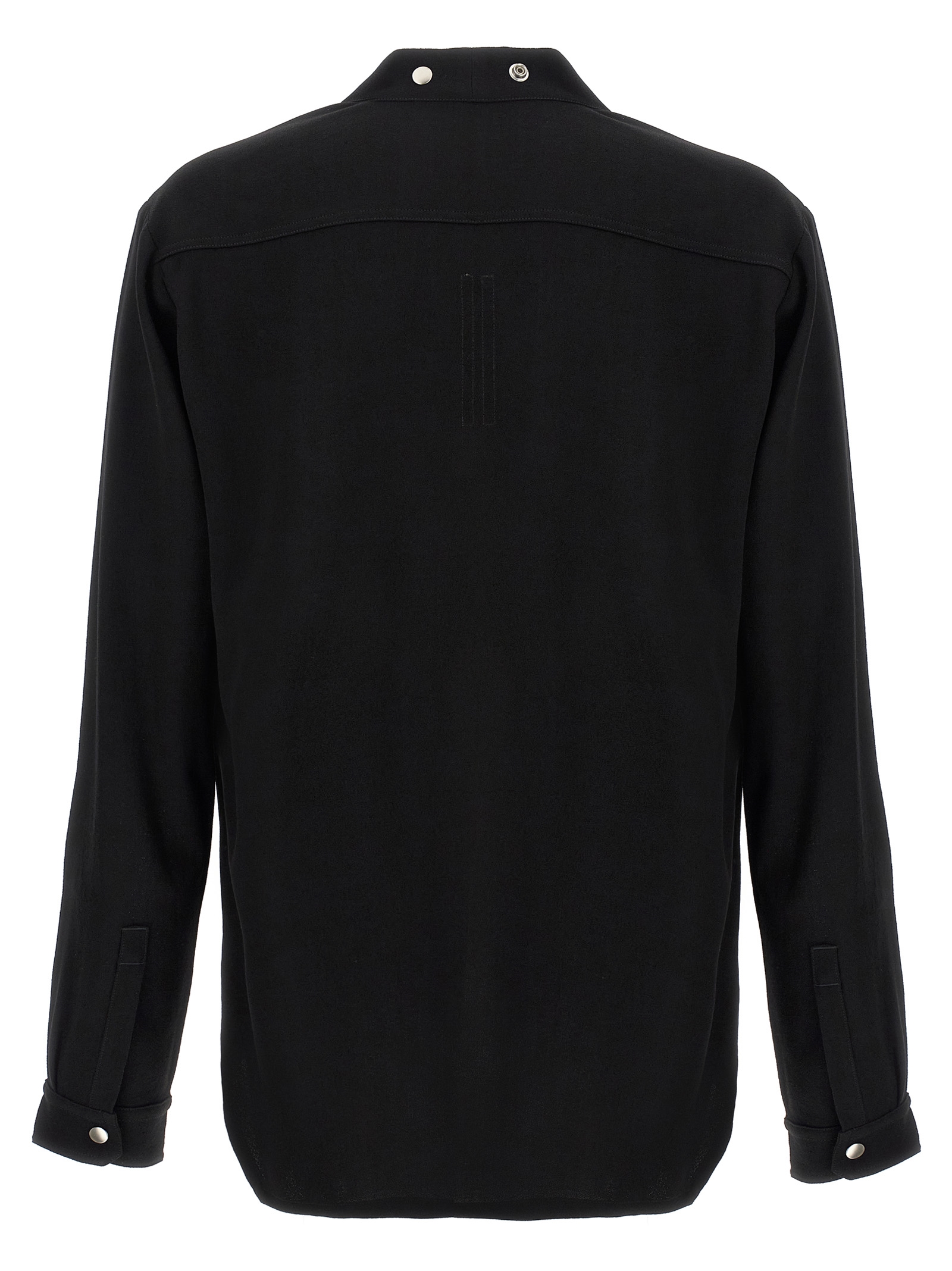 ‘Larry Fogpocket’ medium weight wool shirt woven with high twist frizzy yarns, front snap button closure, V-neck, pockets, long cuffed sleeves.