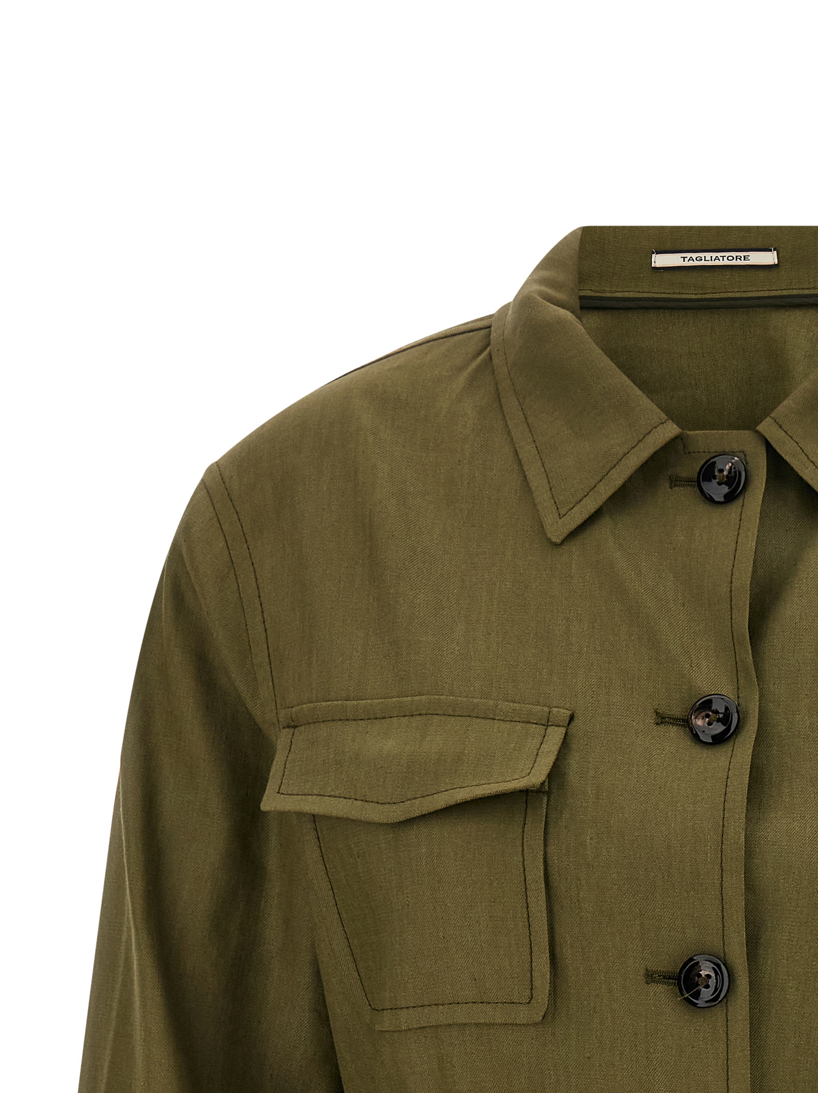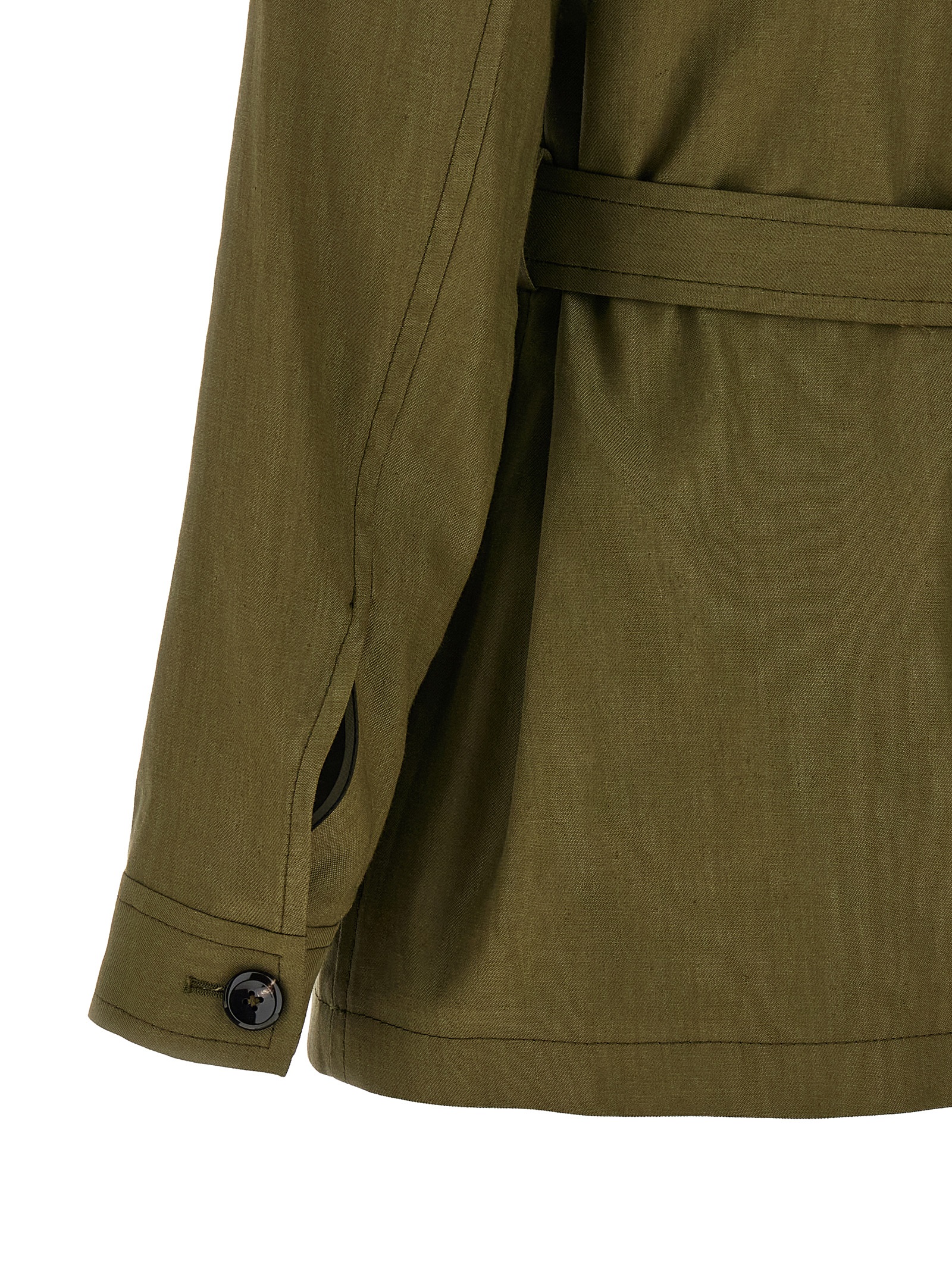 ‘Lauren’ unlined blazer in linen and stretch viscose blend with shirt collar, front horn button closure, pockets, long cuffed sleeves, removable matching belt.