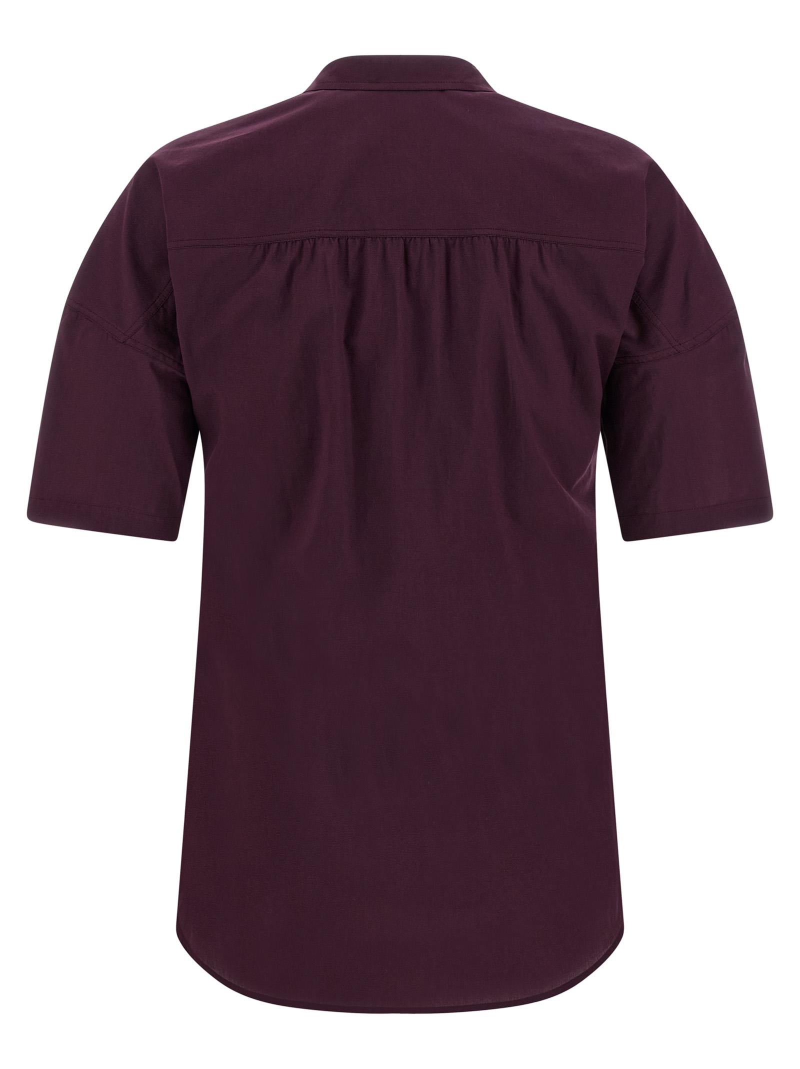 Washed cotton muslin shirt, lavallière collar, front button closure, short sleeves with dropped shoulders, rounded hem.