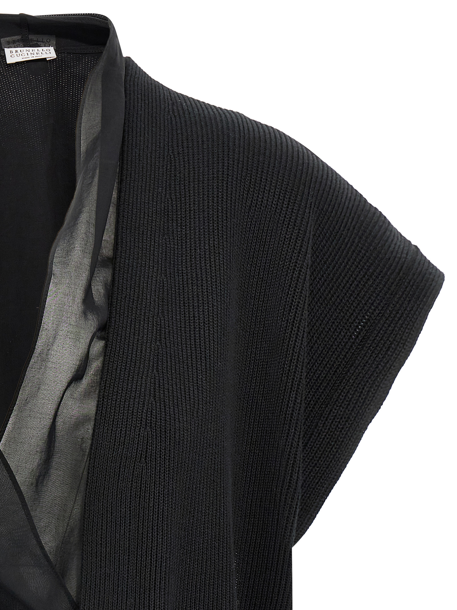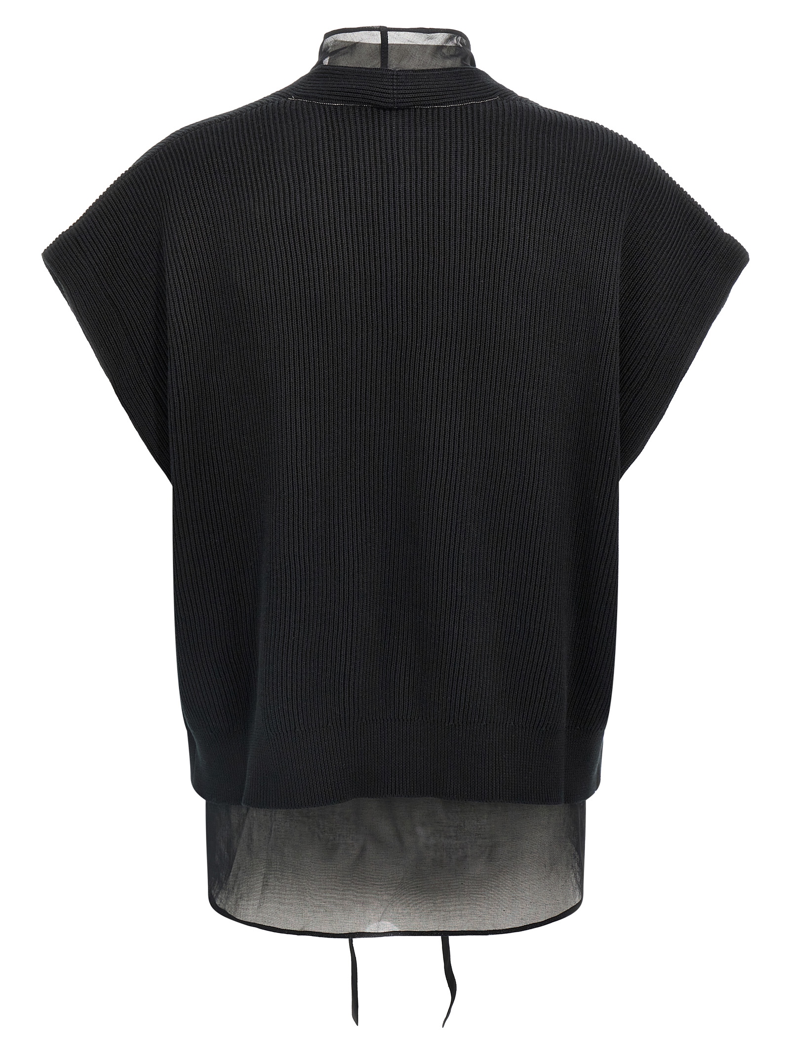 Layered English rib knit cardigan with back jewel detail and cotton organza vest with removable front drawstring closure, dropped shoulder.