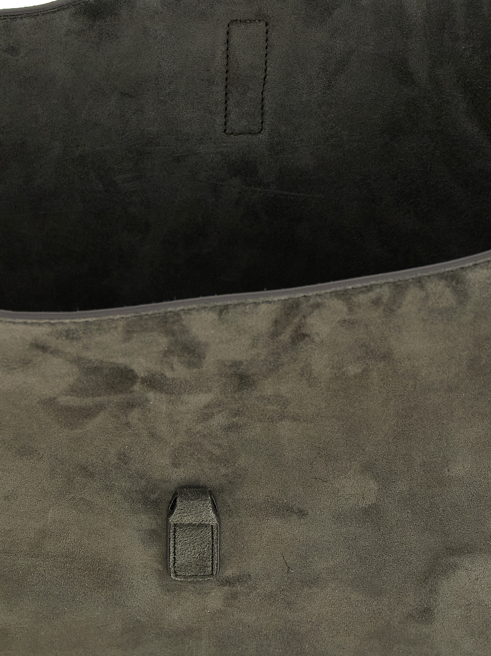 Small ‘Le 5 à 7’ suede shoulder bag, cotton lining, adjustable handle, Cassandre metallic logo closure with antique effect interlocking, removable clutch.