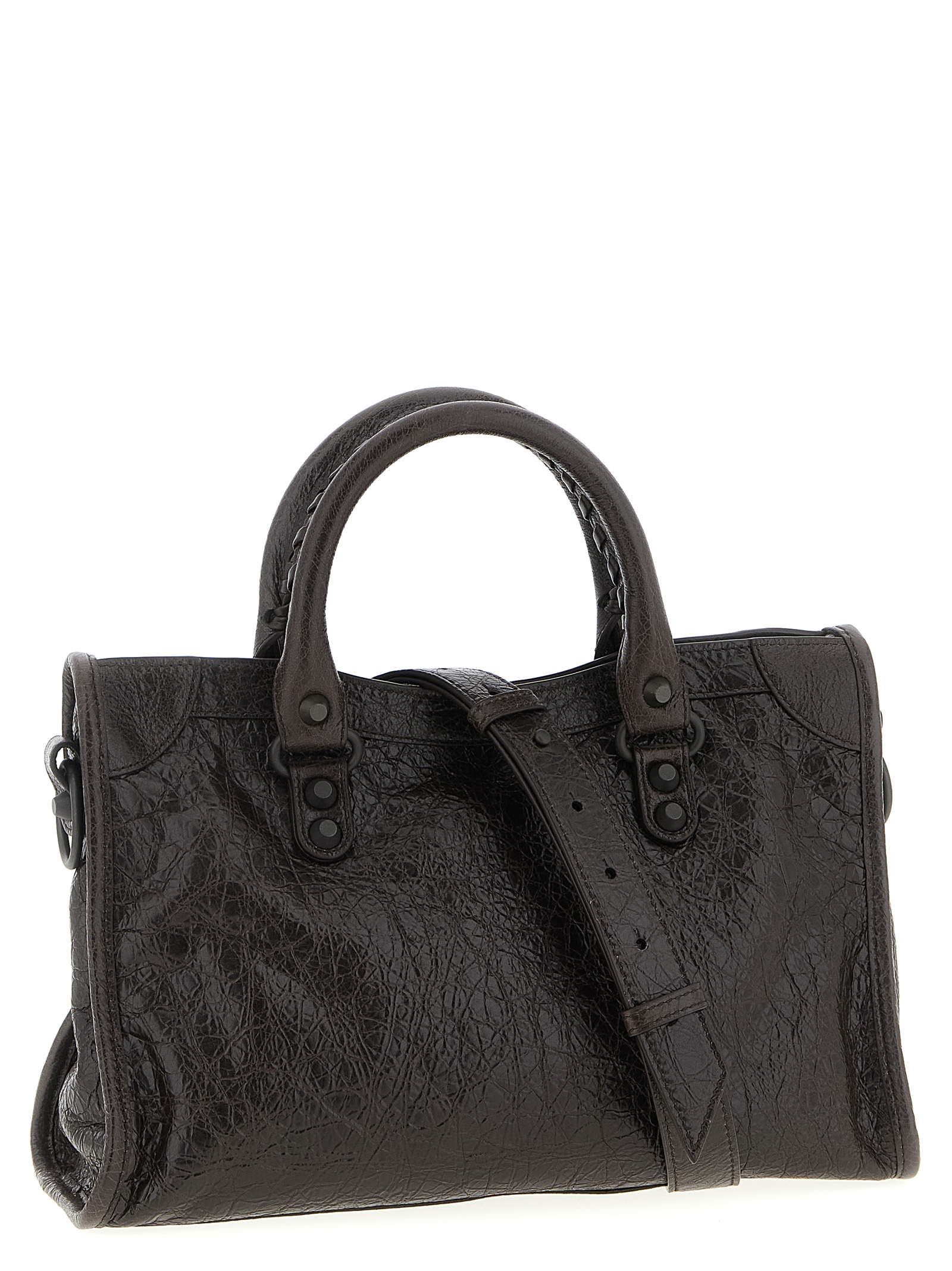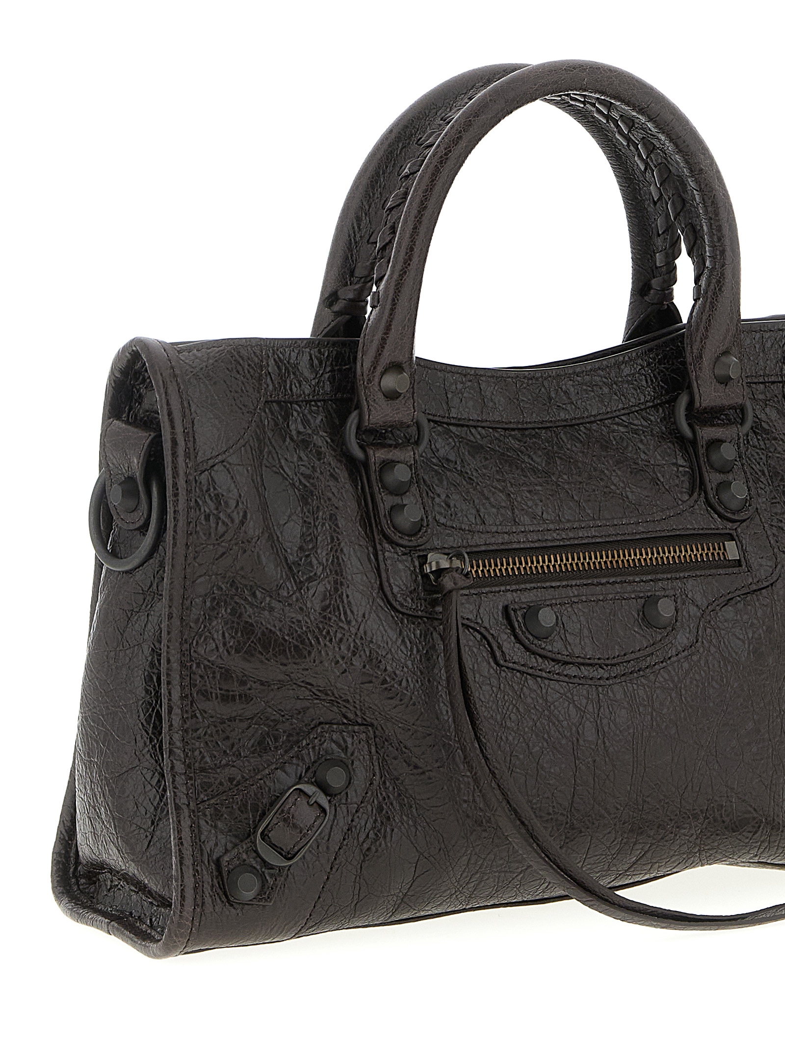 Arena Storico ‘Le City Bag S’ lambskin handbag with double fixed handle, top zip closure, brass finish studs, front zip pocket, adjustable and removable shoulder strap.
