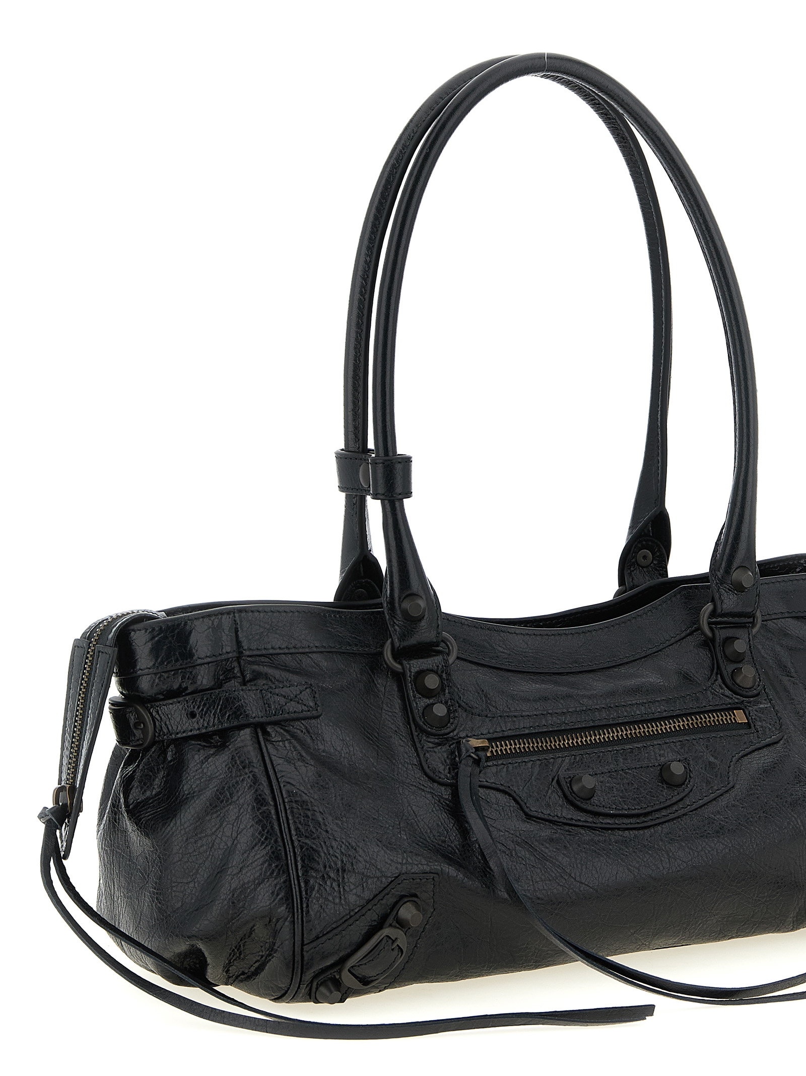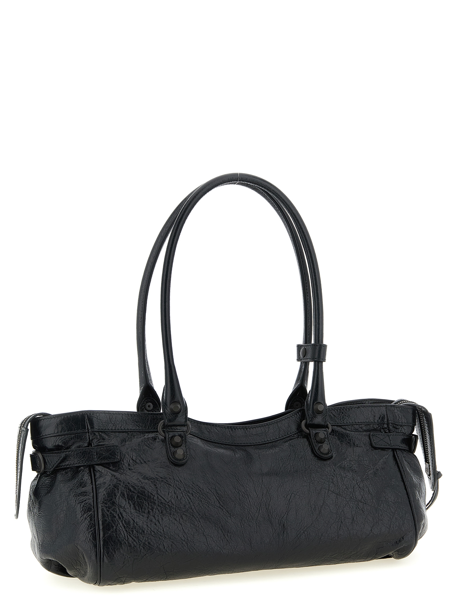Arena ‘Le City East-West’ lambskin shoulder bag, double fixed handle, top zip closure, brass finish studs, adjustable side straps, front zip pocket, cotton canvas lining.
