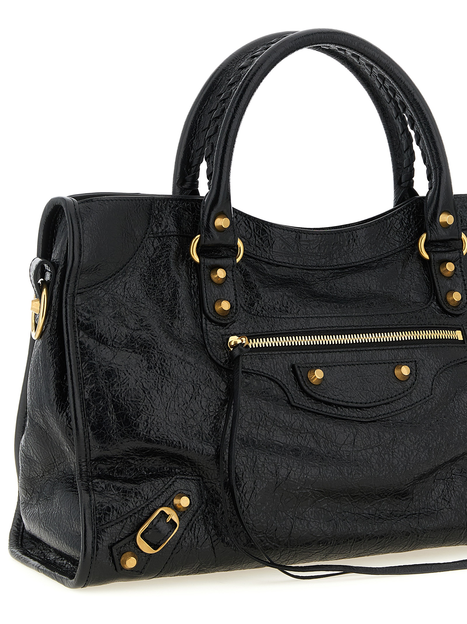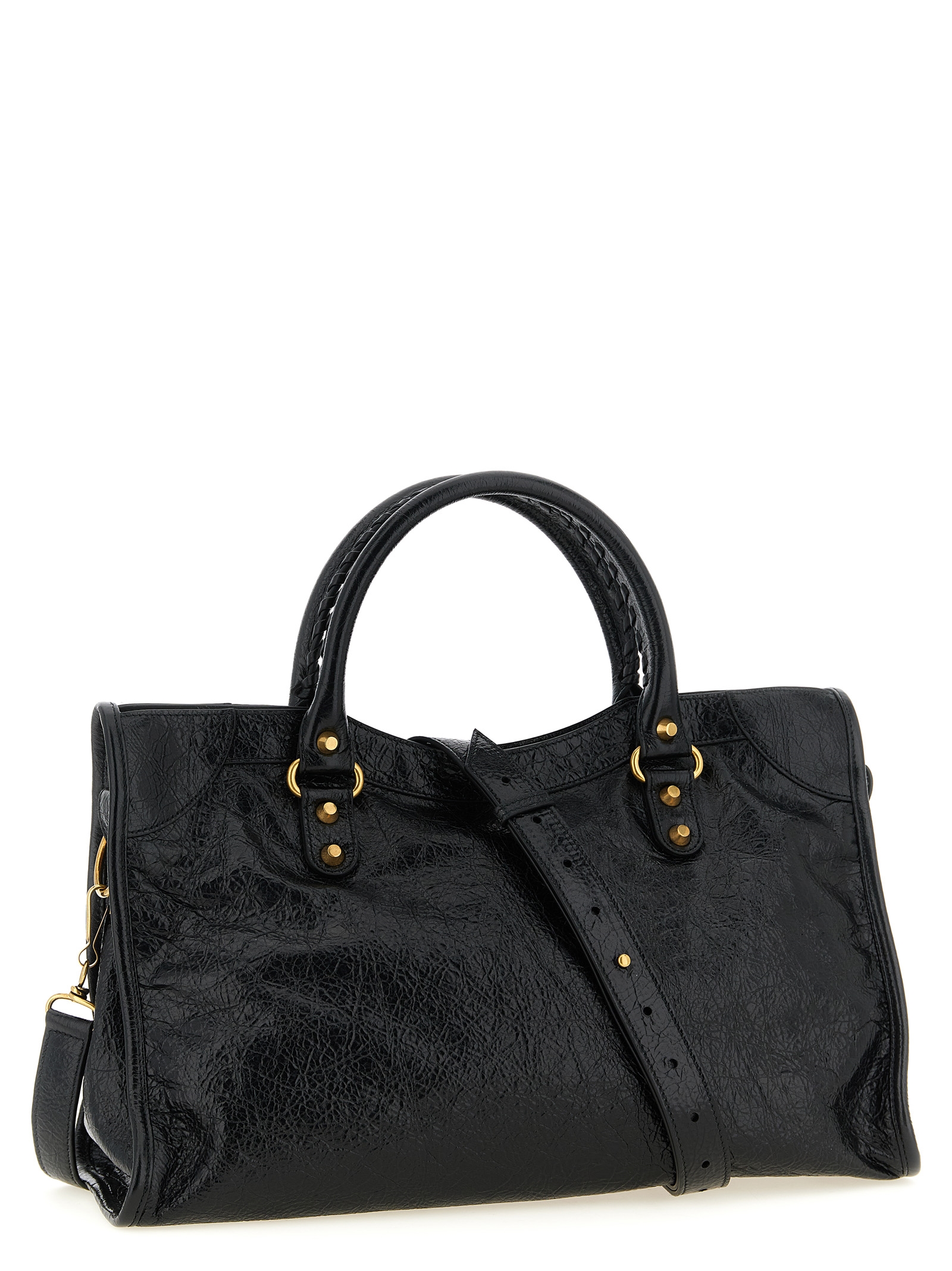 Arena Storico ‘Le City M’ lambskin handbag with antiqued gold studs, double fixed handle, top zip closure, front zip pocket, cotton canvas lining, adjustable and removable shoulder strap.