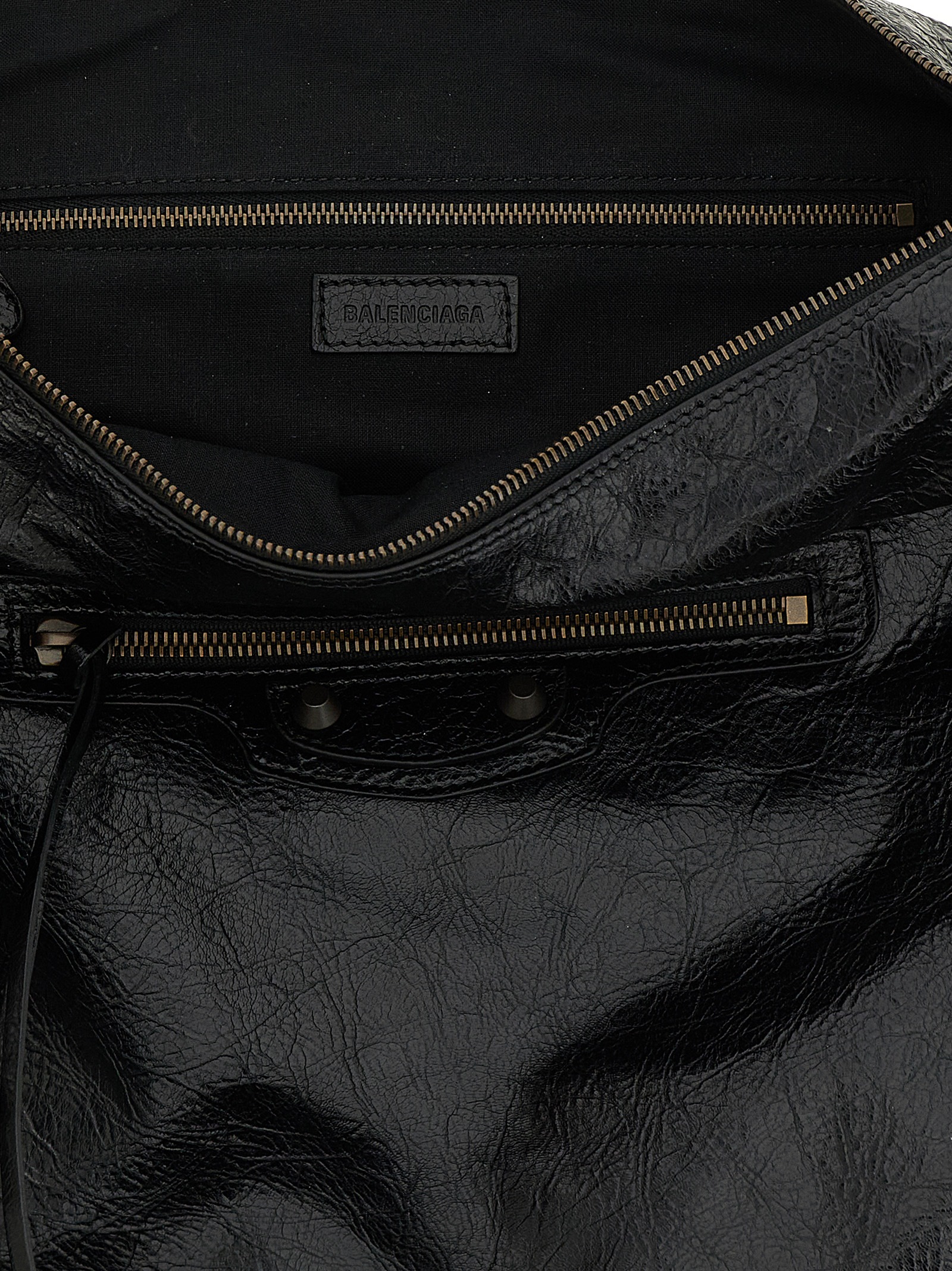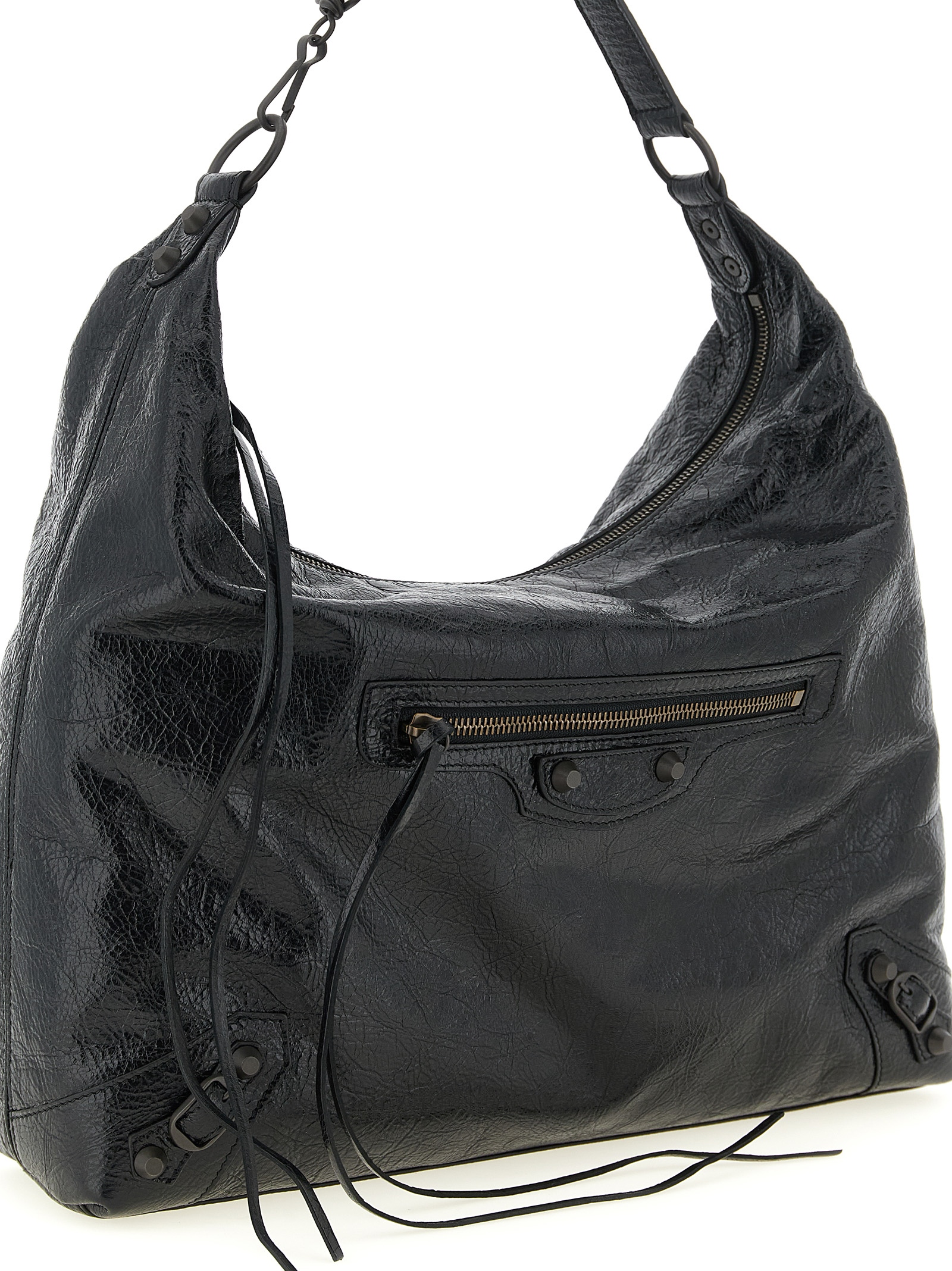 Arena ‘Le City’ medium shoulder bag in Arena lambskin leather with brass metal finish, Hobo model, top zip closure, handle, front zip pocket, removable shoulder strap, cotton canvas lining.
