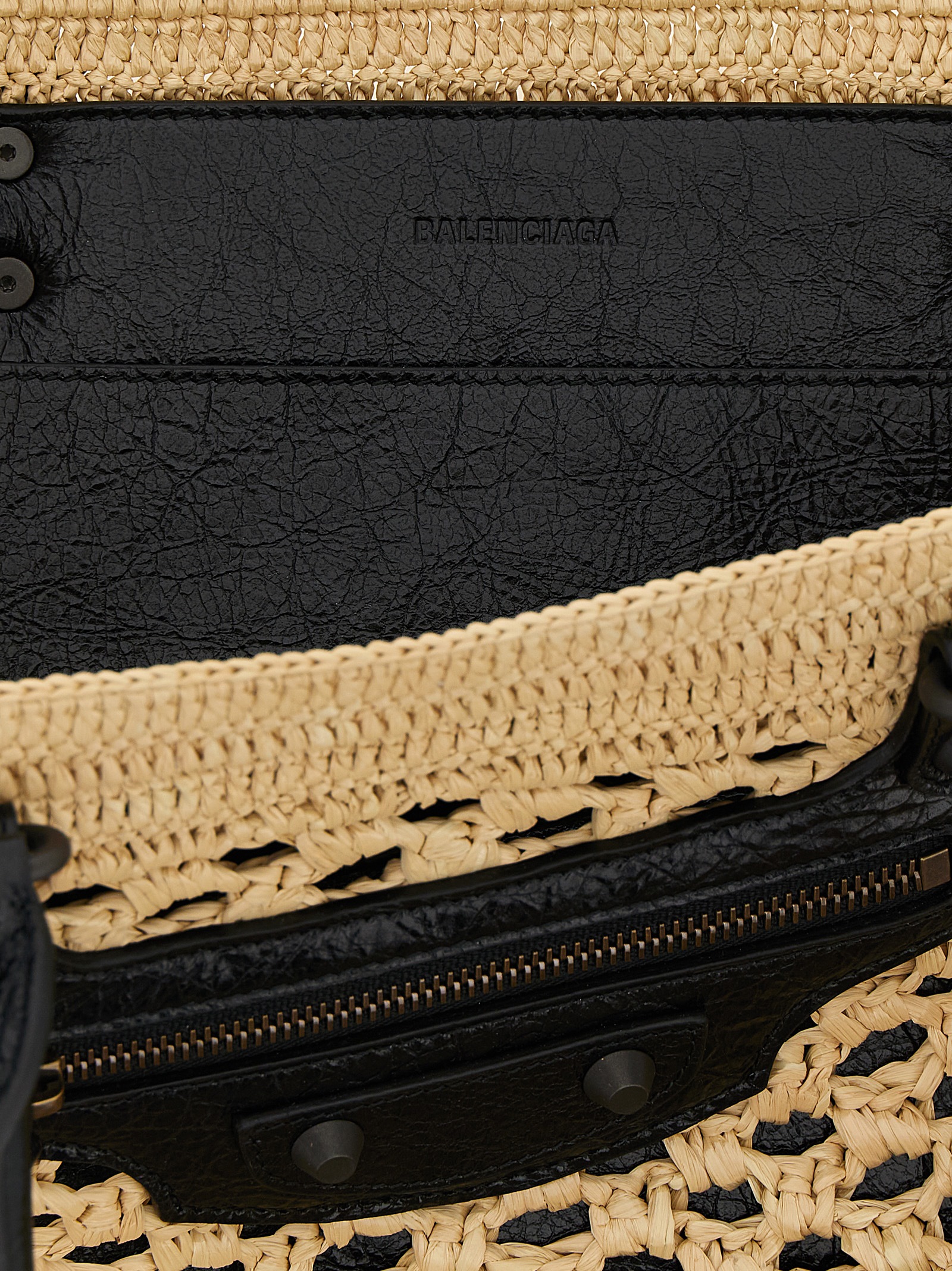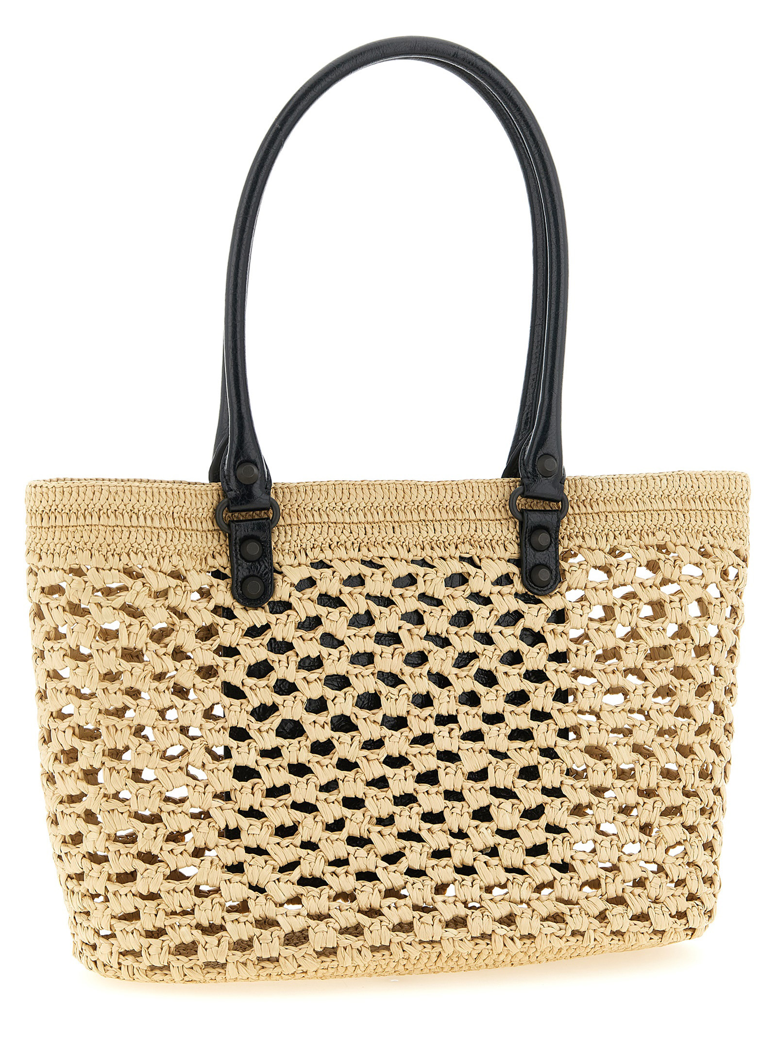 ‘Le City’ shoulder bag in woven raffia effect fabric and Arena lambskin, brass-finish metal stud appliqué, basket model, two fixed tubular handles, front trompe l’oeil pocket, unlined, an inner patch pocket.