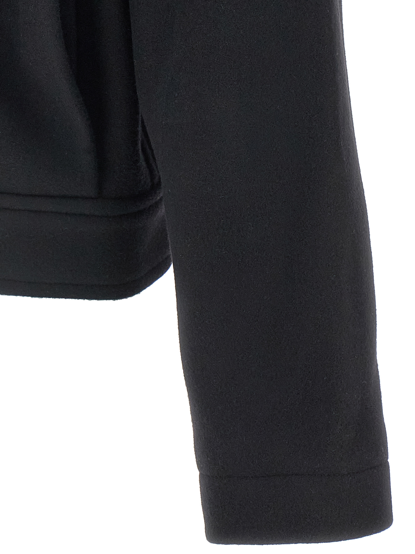 Montgomery-style virgin wool ‘Le Duffle Cabana’ coat with cotton blend lining, round top cut, hood, front toggle closure, pockets, long sleeves with dropped shoulders.