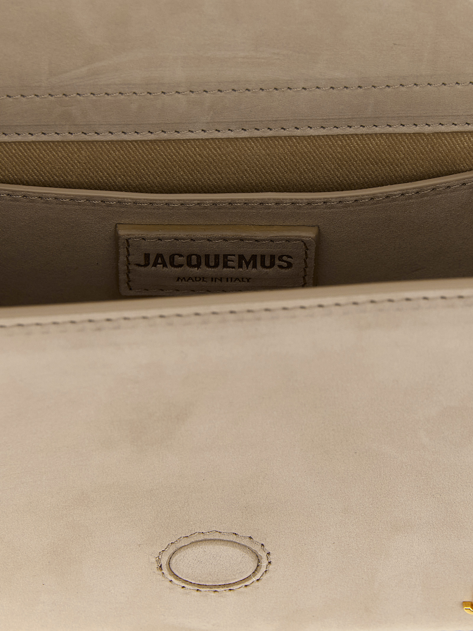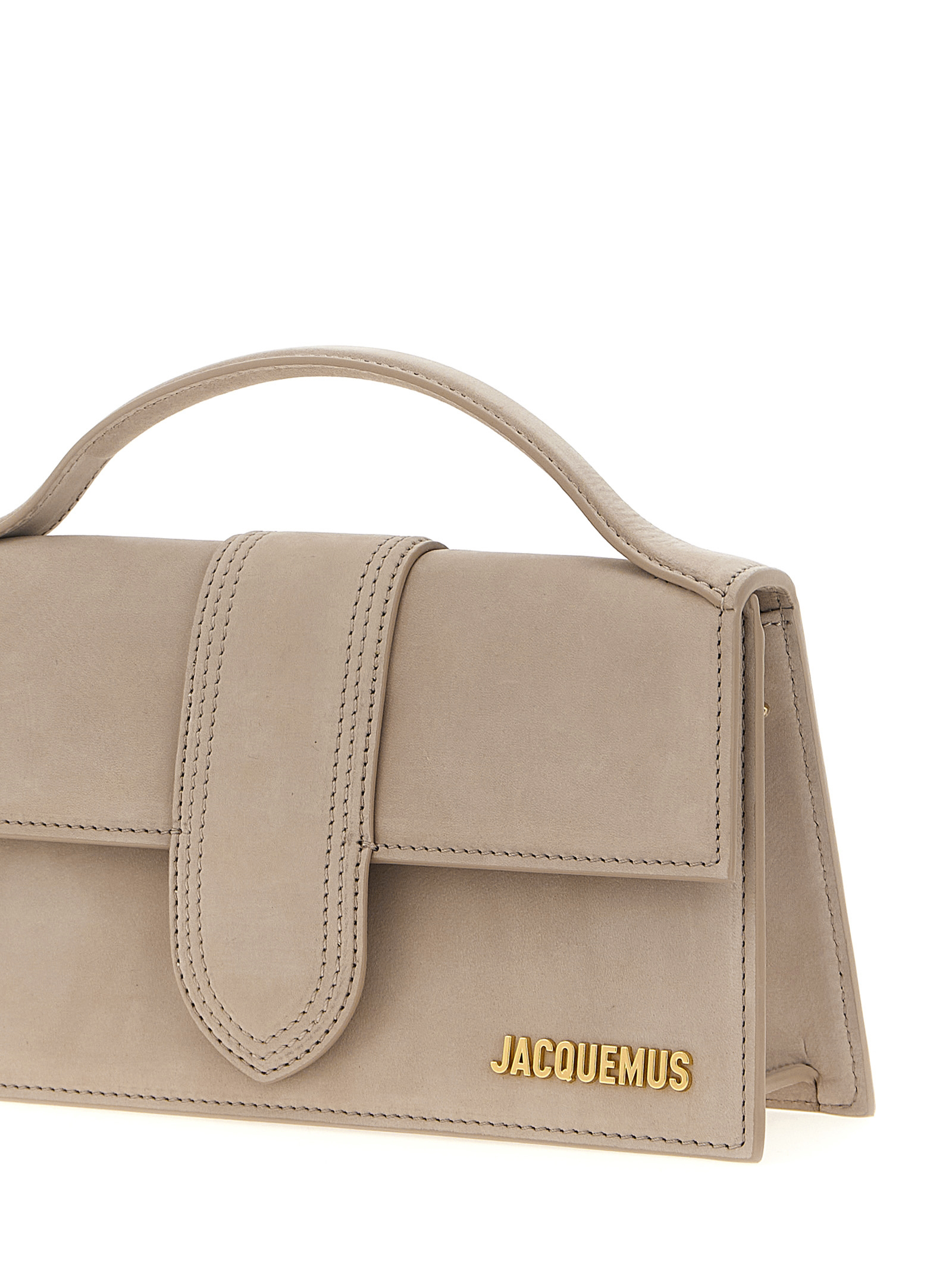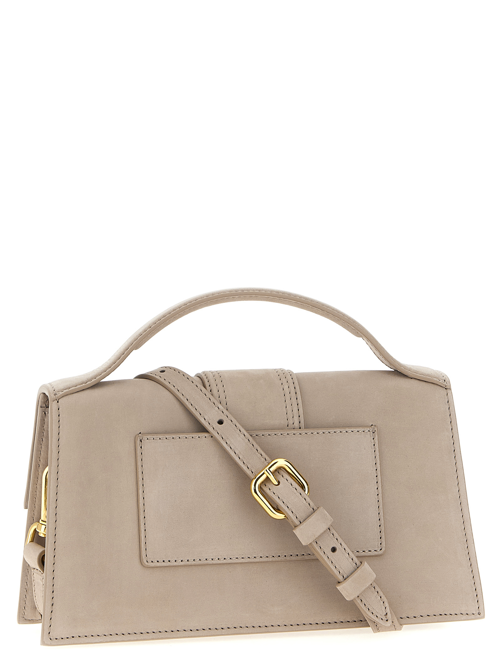 ‘Le Grand Bambino’ suede handbag with magnetic flap closure, front metal logo detail, fixed handle, adjustable and removable shoulder strap.
