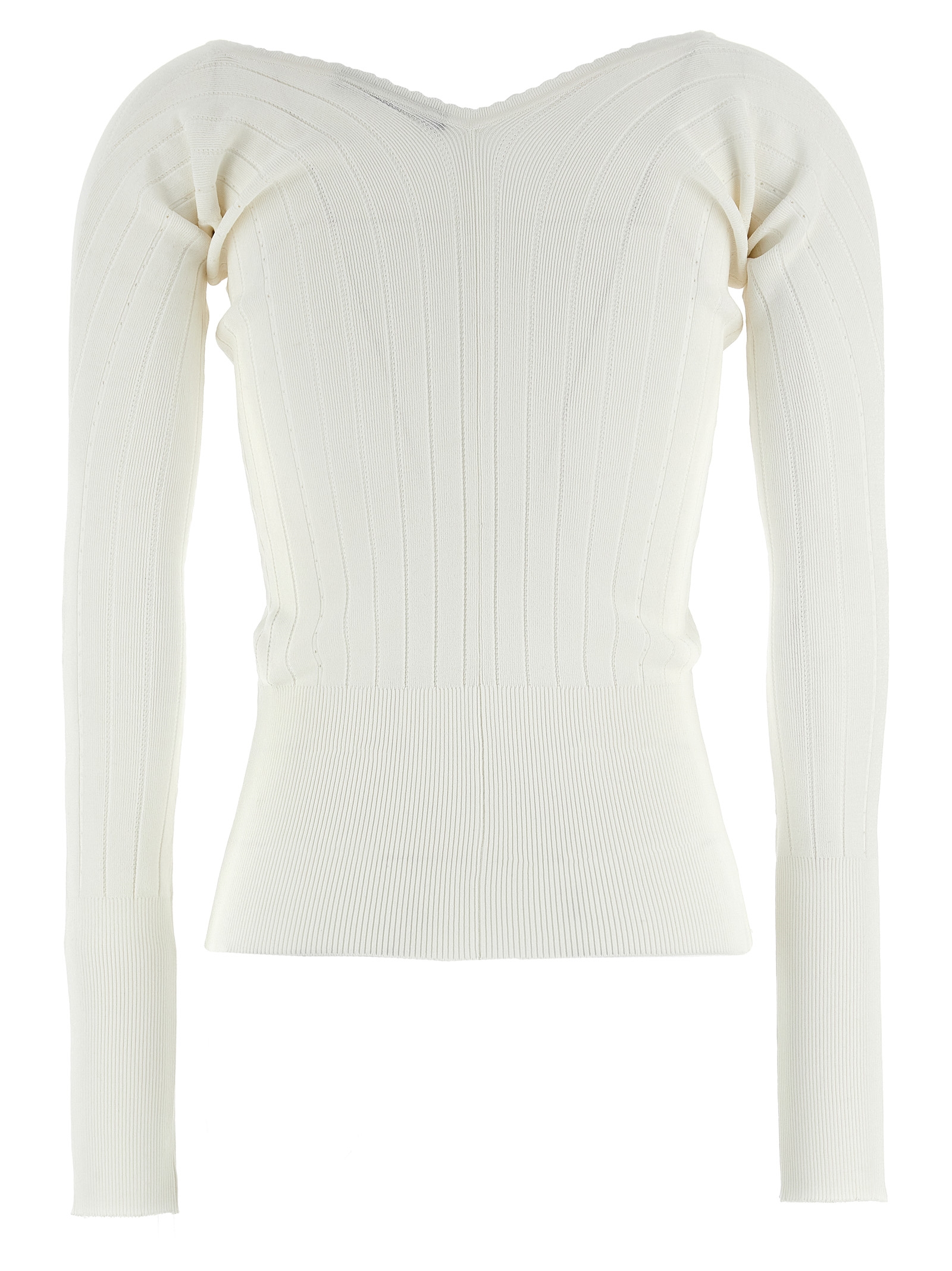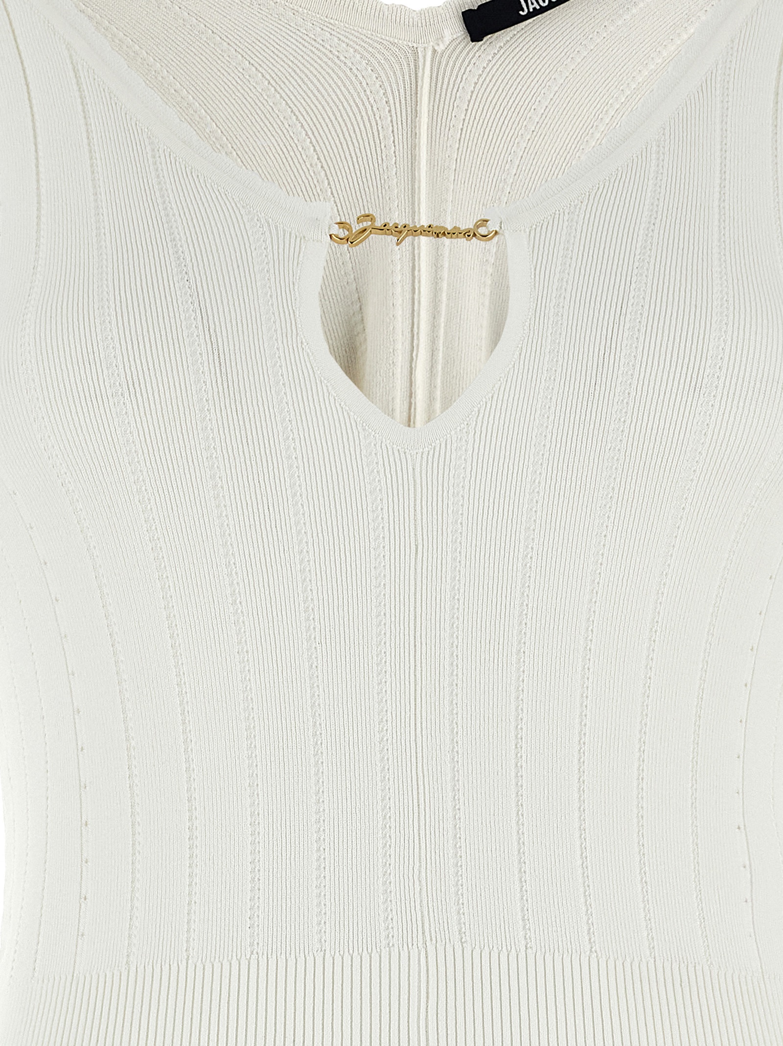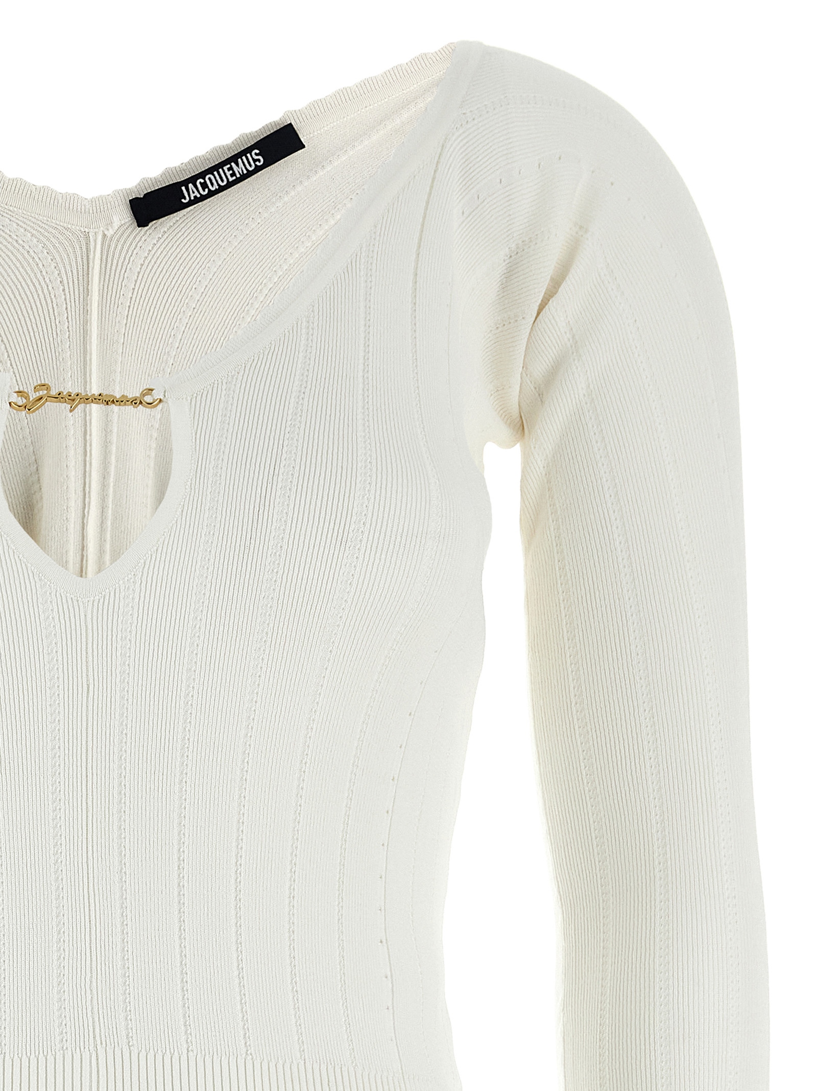 ‘Le haut Pralù’ ribbed stretch viscose top, front cut-out detail with gold metal logo charm, long sleeves.