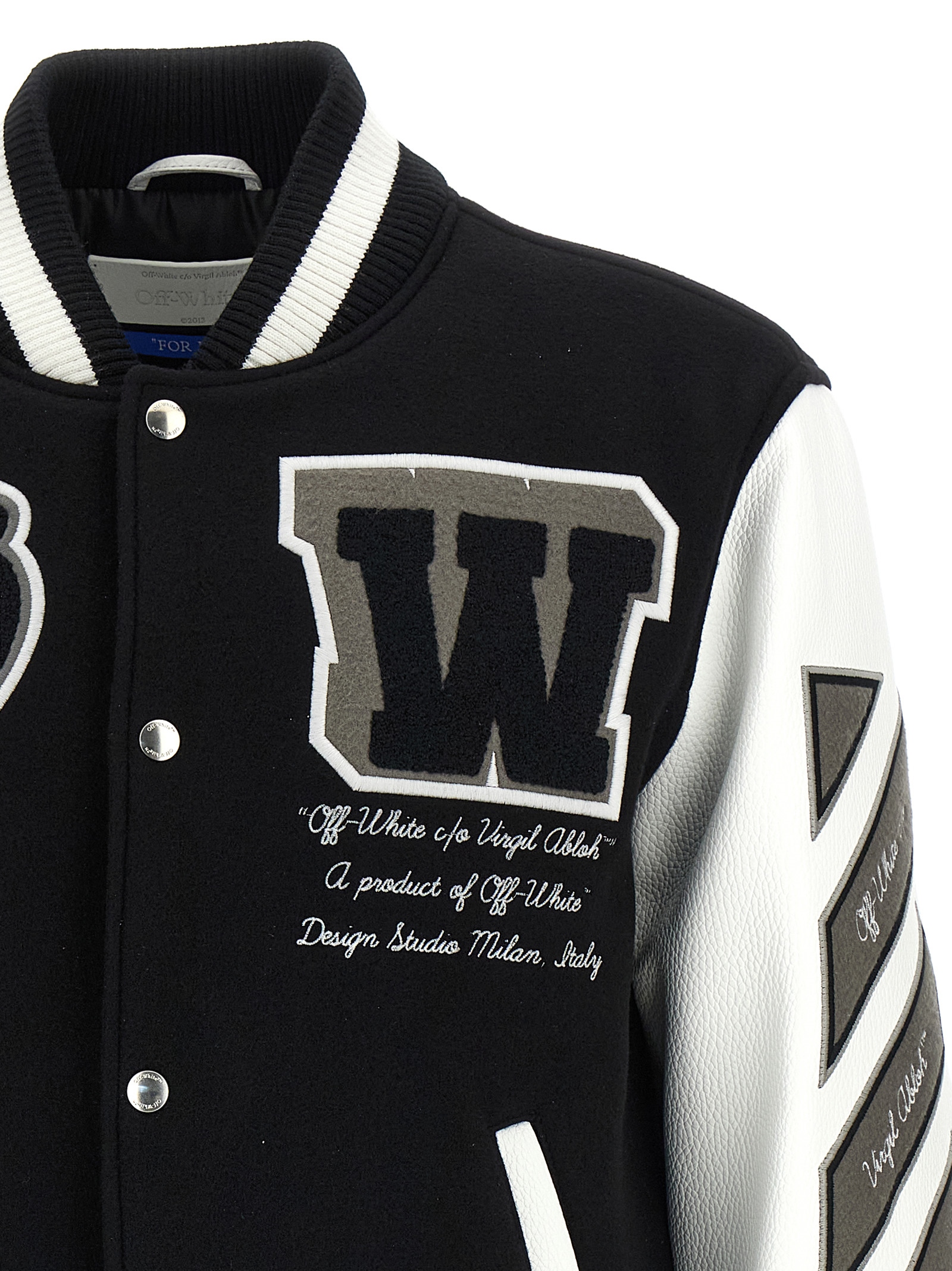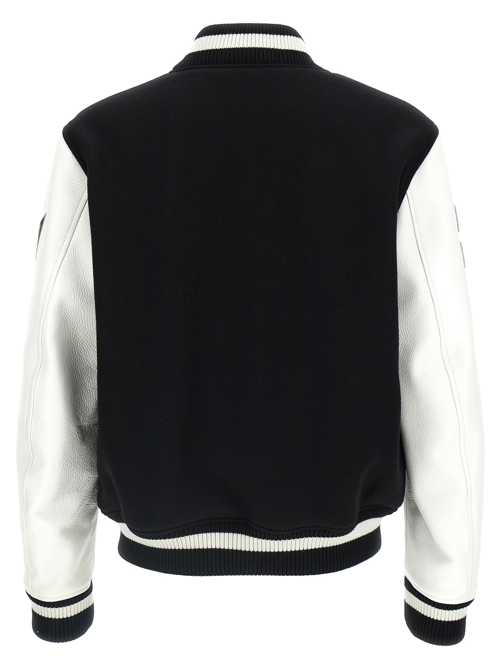 Lea’ wool blend bomber jacket with stretch ribbed knit details, all-over embroidery and patches, varsity model, front snap button closure, pockets, long sleeves in grainy leather with dropped cuffs and shoulder, and band on the bottom of the garment.
