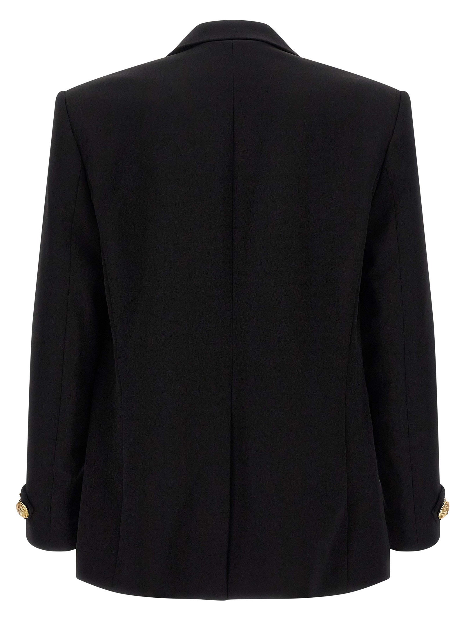 Robe-style blazer in viscose crepe with peak lapels embroidered with pearl leaf pattern embroidery and metal ‘Leone Catena’ buttons on the lapel, pockets and cuffs, padded shoulder, long sleeves, flap pockets, back split, satin lining.