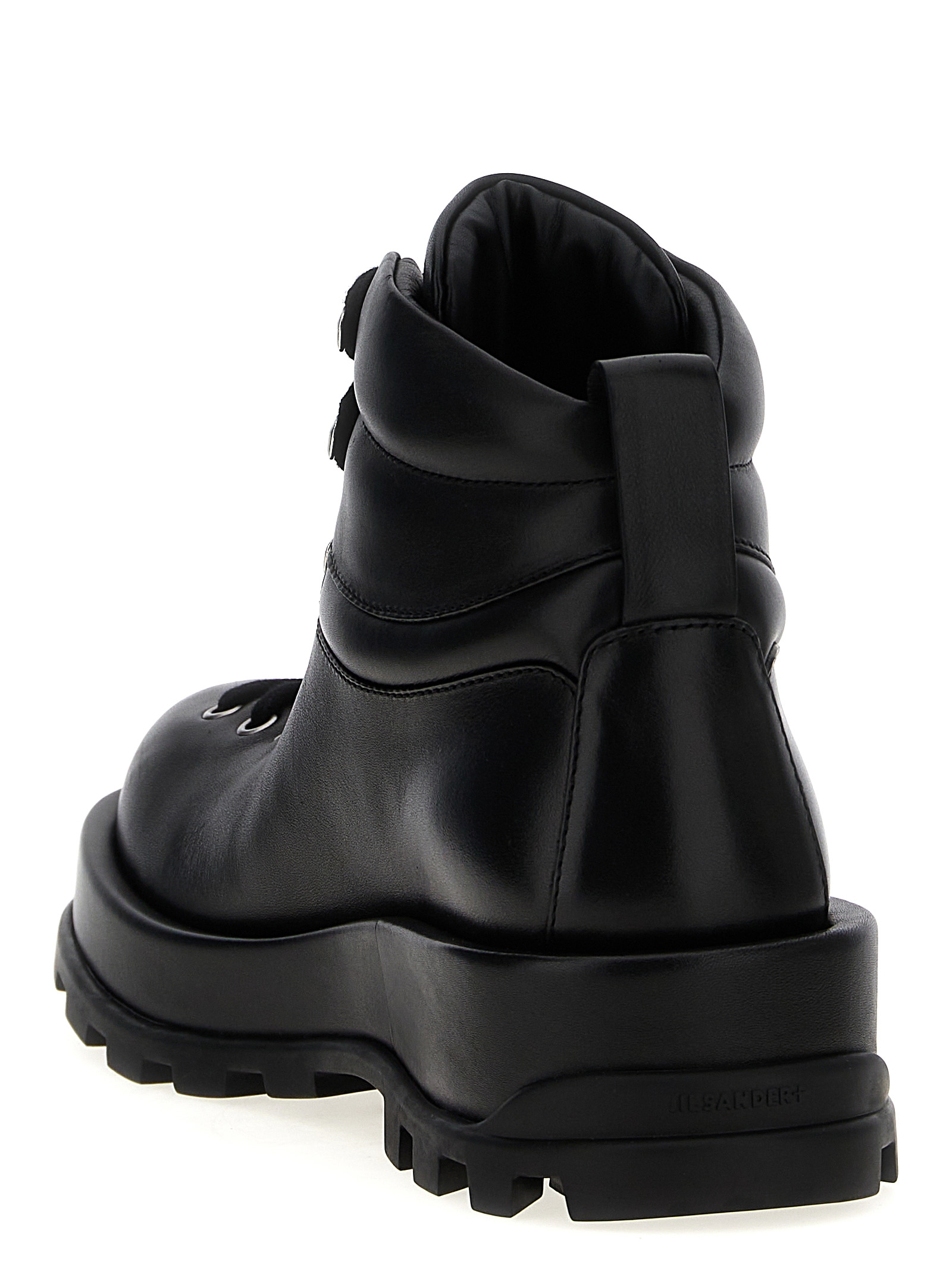 Leather ankle boots with laces and rubber sole.