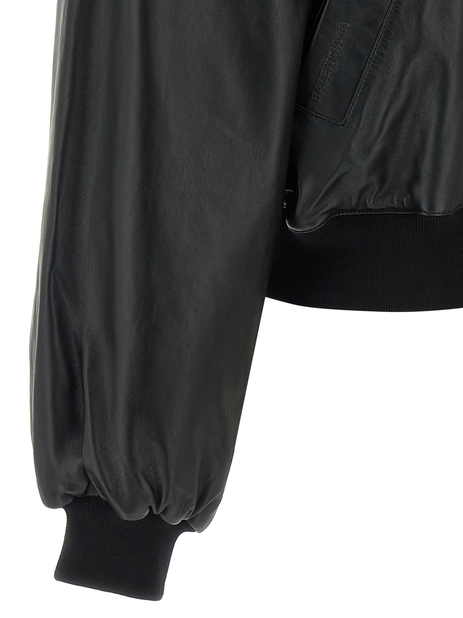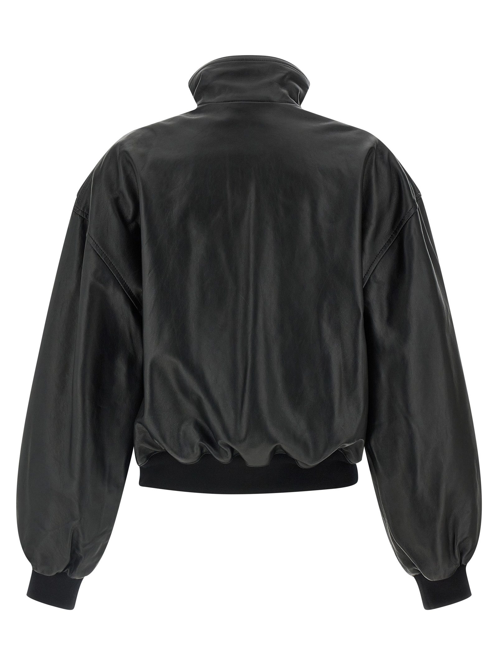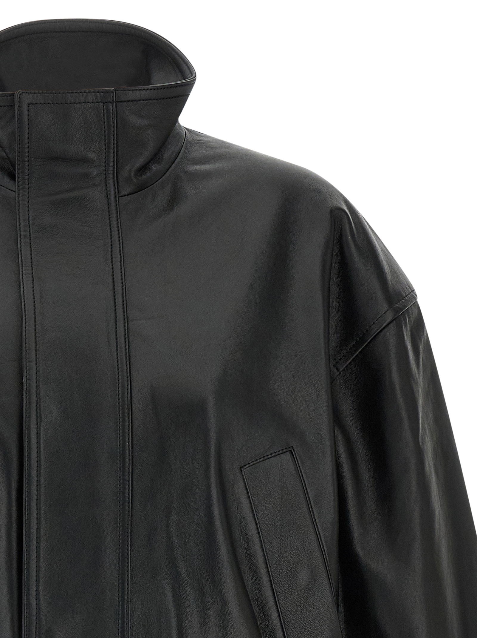 Semi-glossy smooth-grain leather blouson, high neck, front zip and snap button closure, pockets, long wide sleeves with cuffs and dropped shoulder, stretch ribbed knit band on the hem.