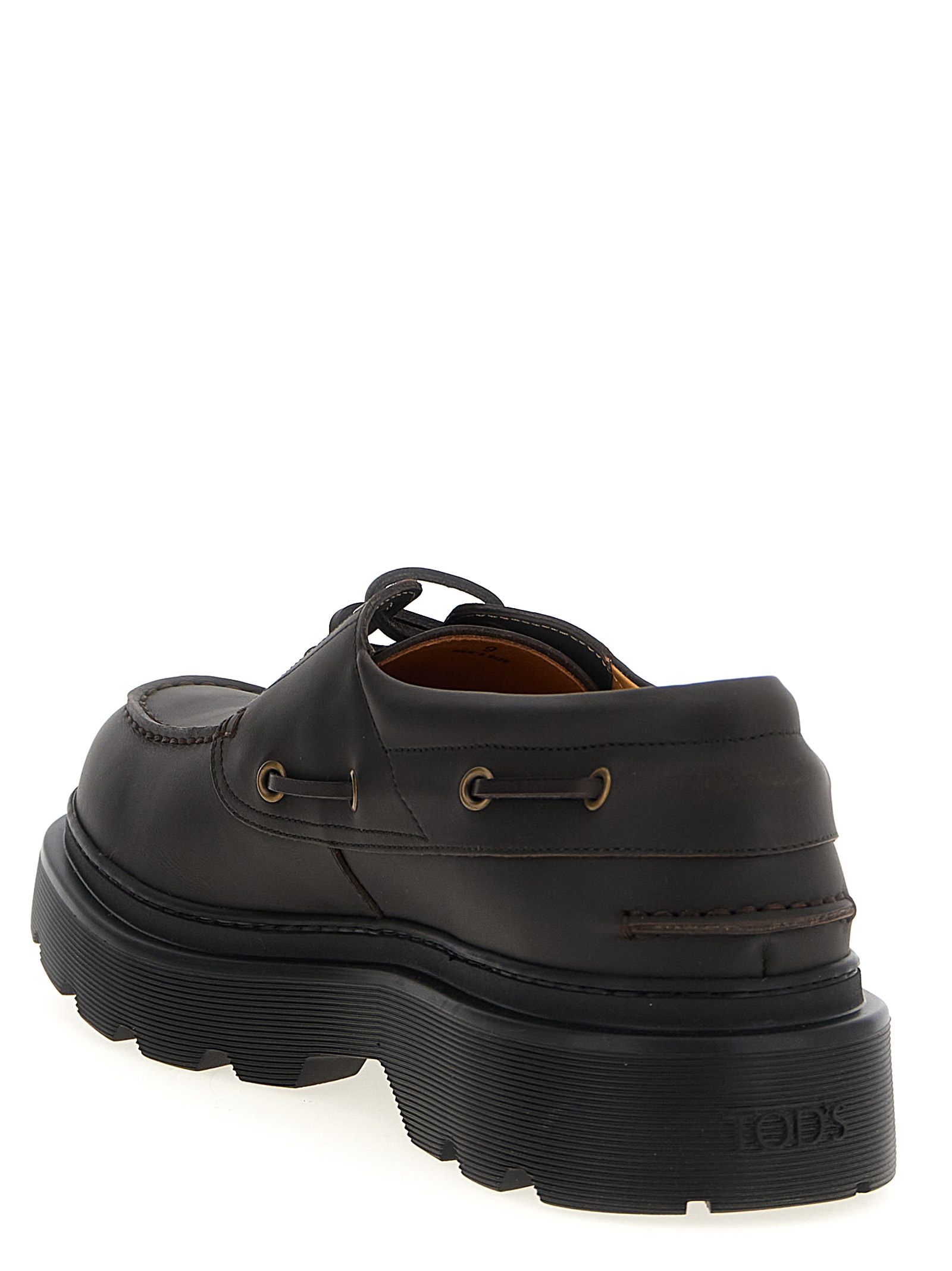 Leather boat shoe, front embossed logo, laces closure, rubber tank sole.