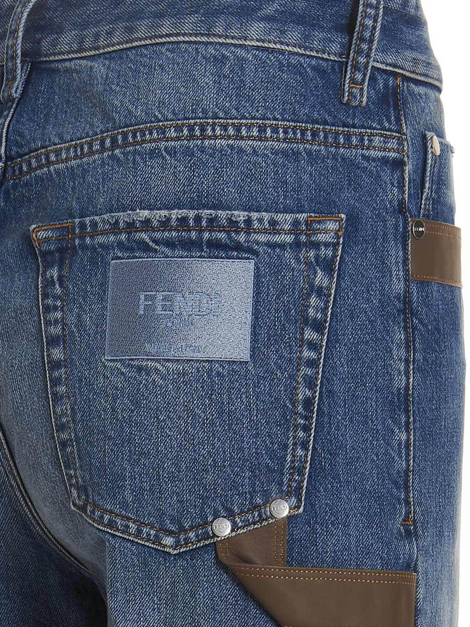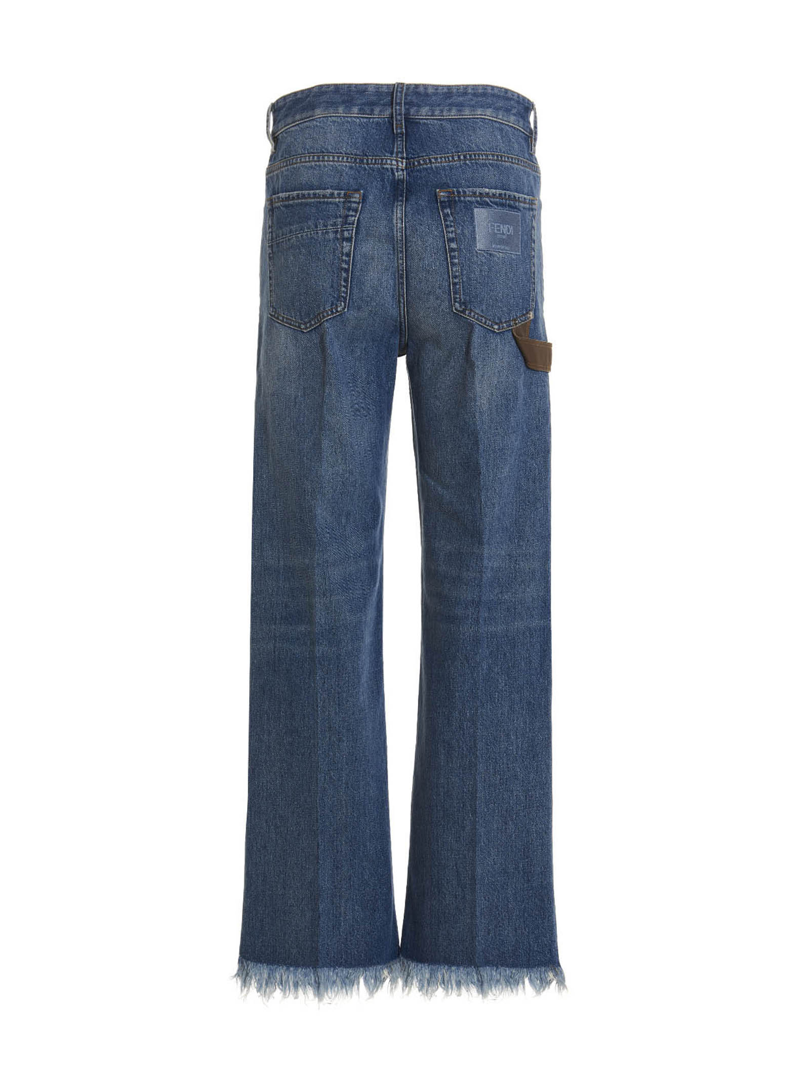 Denim jeans featuring contrast leather detailing, a straight leg, a frayed hem and a zip closure.