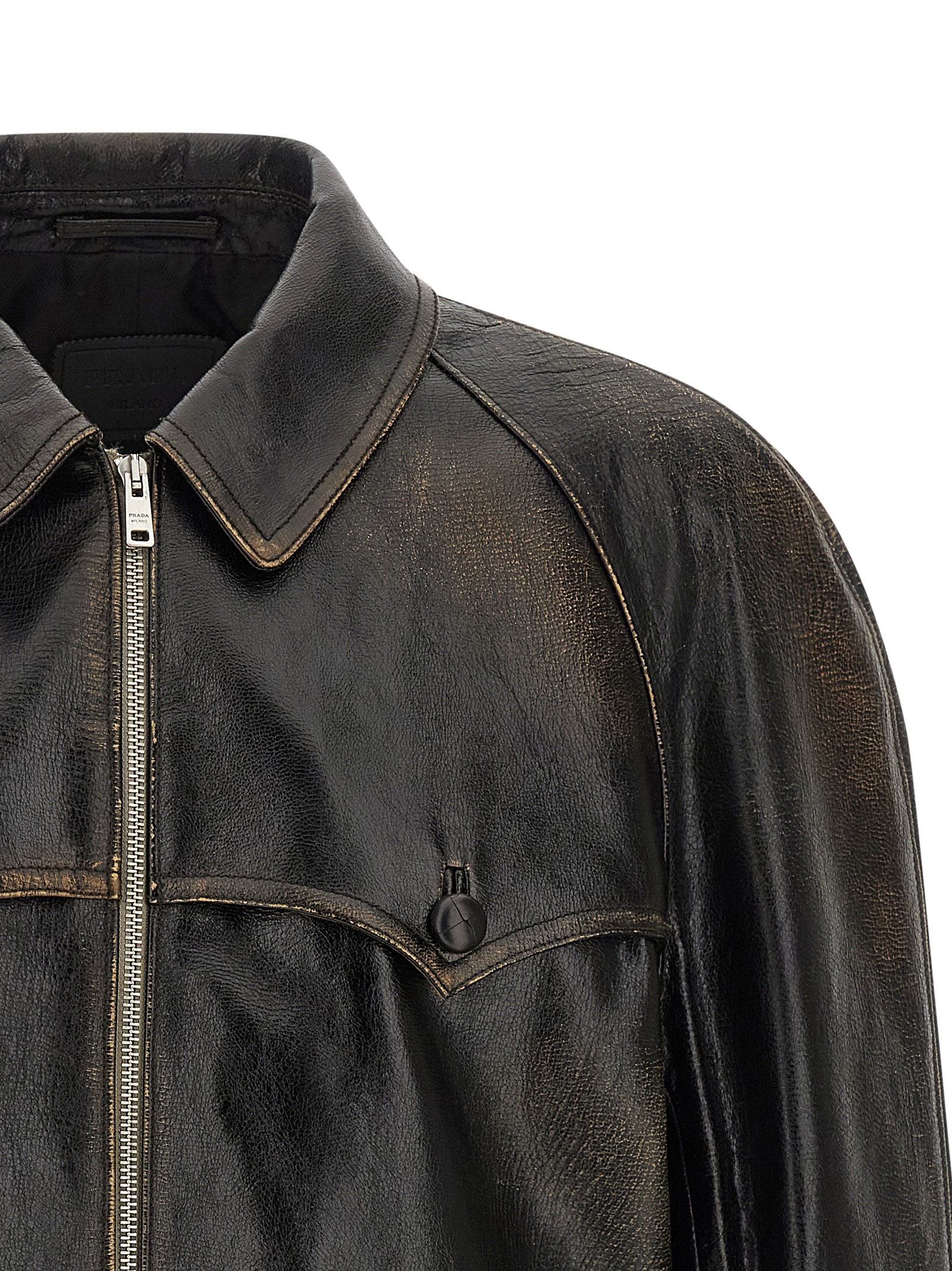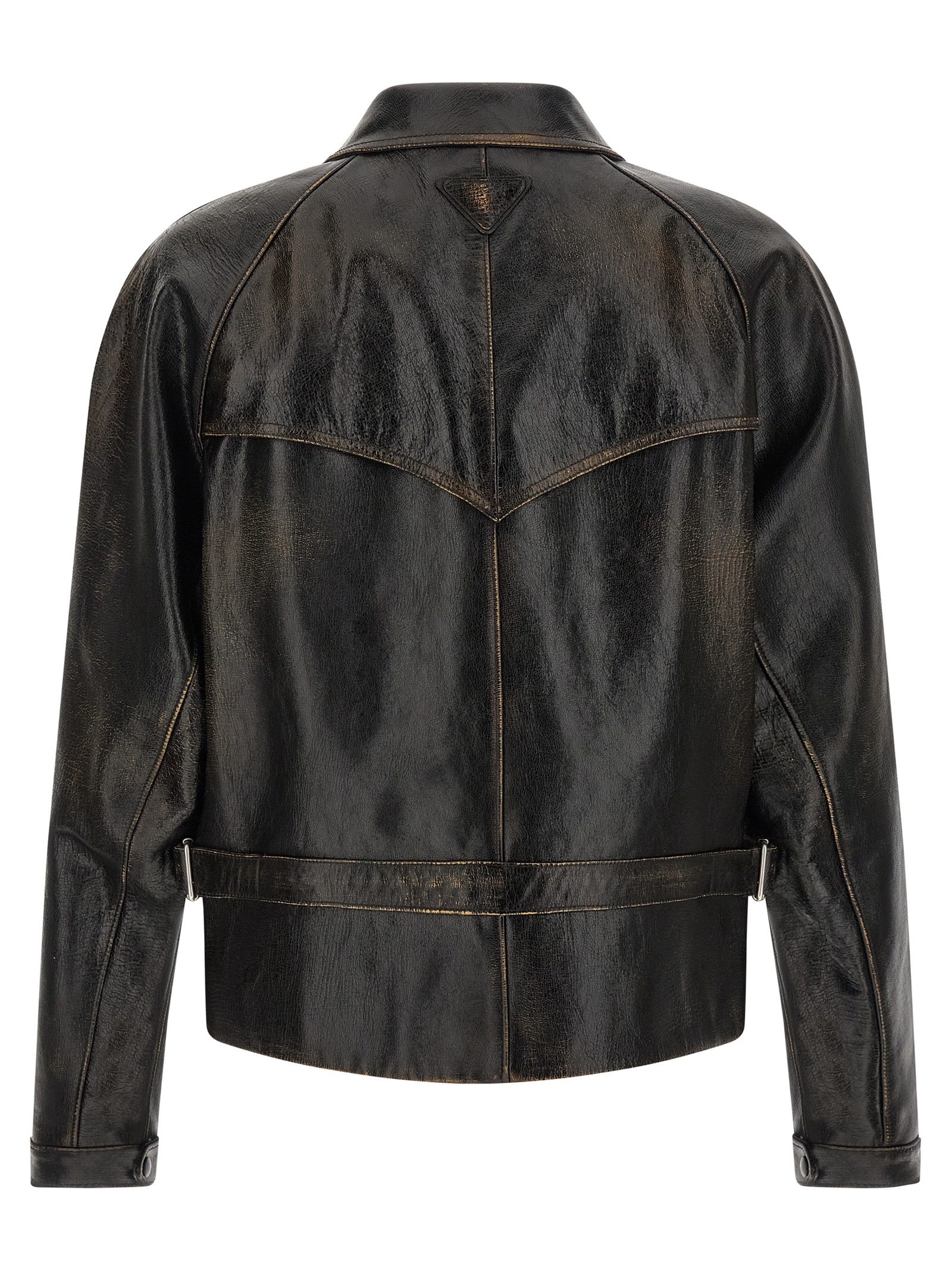 Vintage-effect leather jacket with shirt collar, front zip closure, raglan sleeves, front pockets with flap and button, triangle leather logo on the back, long sleeves with cuffs.