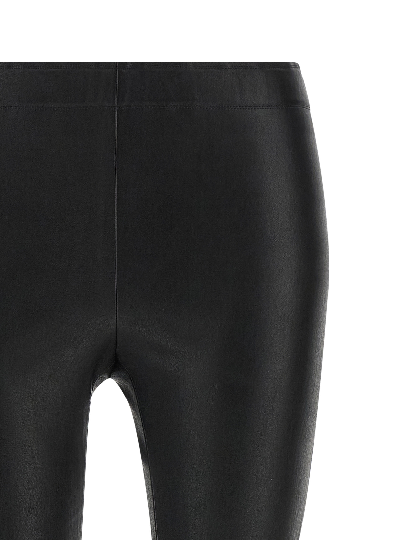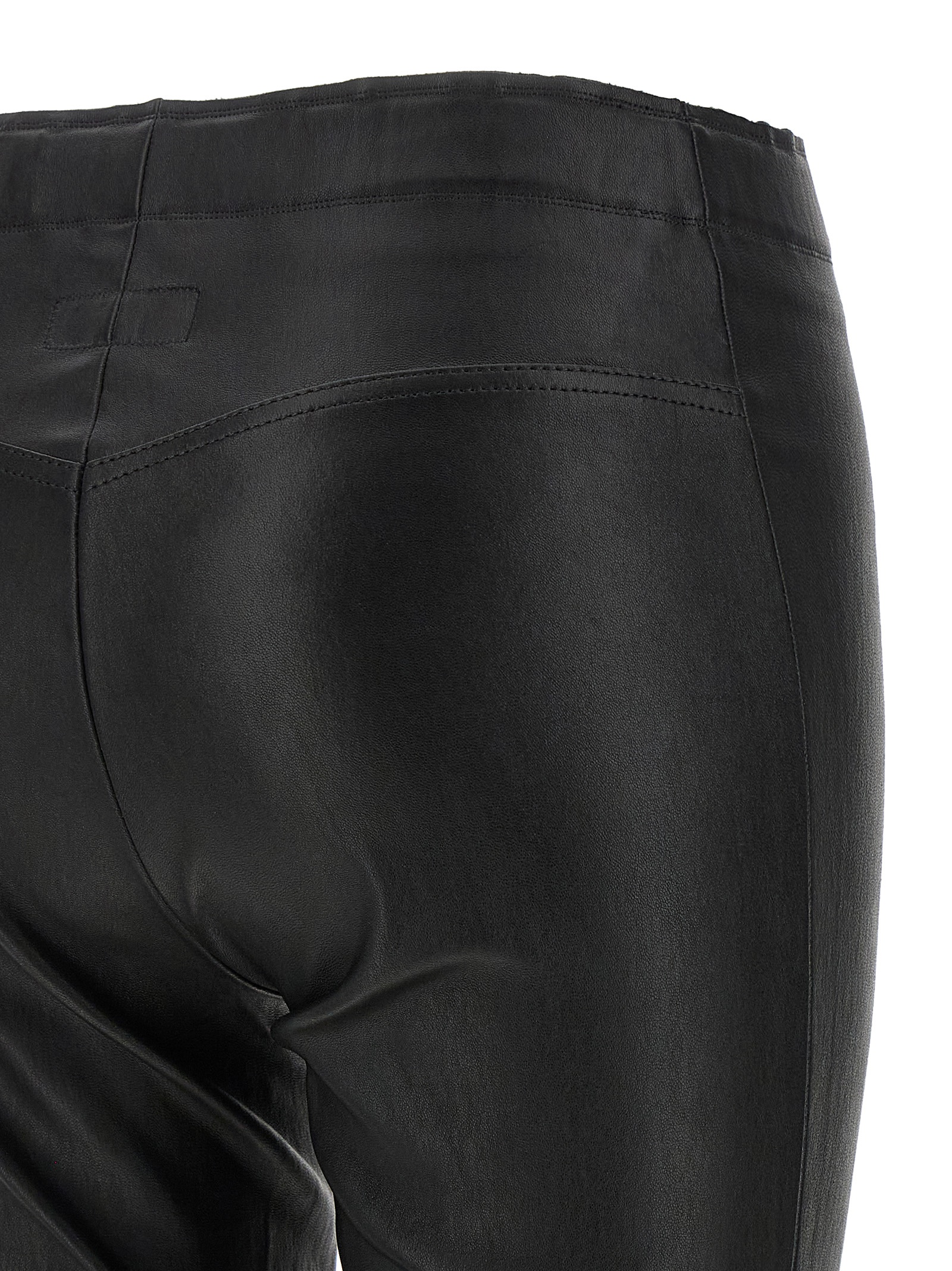 Slim leather trousers, slightly cropped tight leg style, elastic waistband.