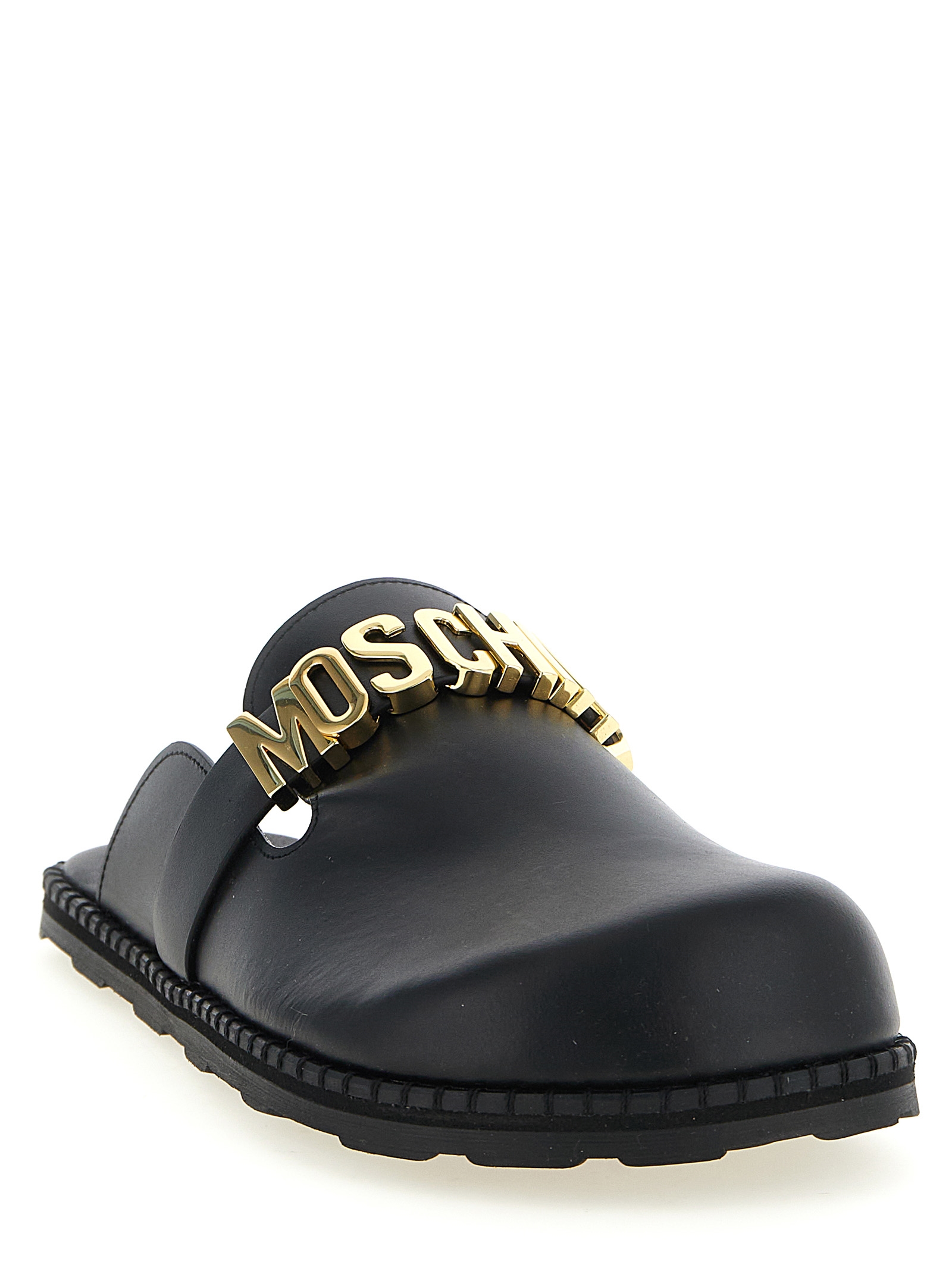Leather sabots, strap with metal lettering logo, micro midsole, TPU sole with polka dot effect.
