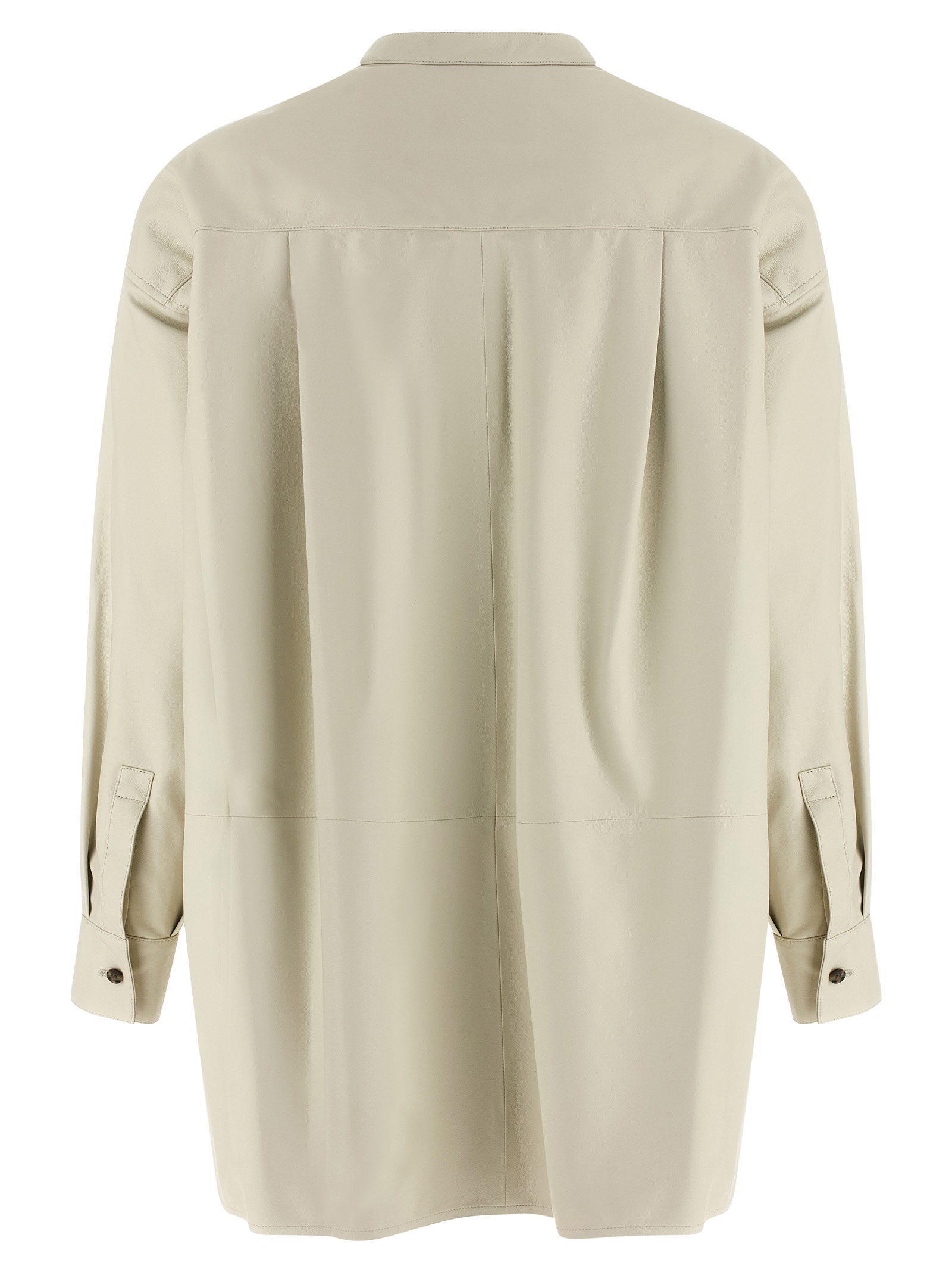 Lightweight, unlined leather shirt with mandarin collar, front button closure, long sleeves with cuffs and buttons, asymmetrical and round hem with side slits, front patch pocket, tone-on-tone stitching.
