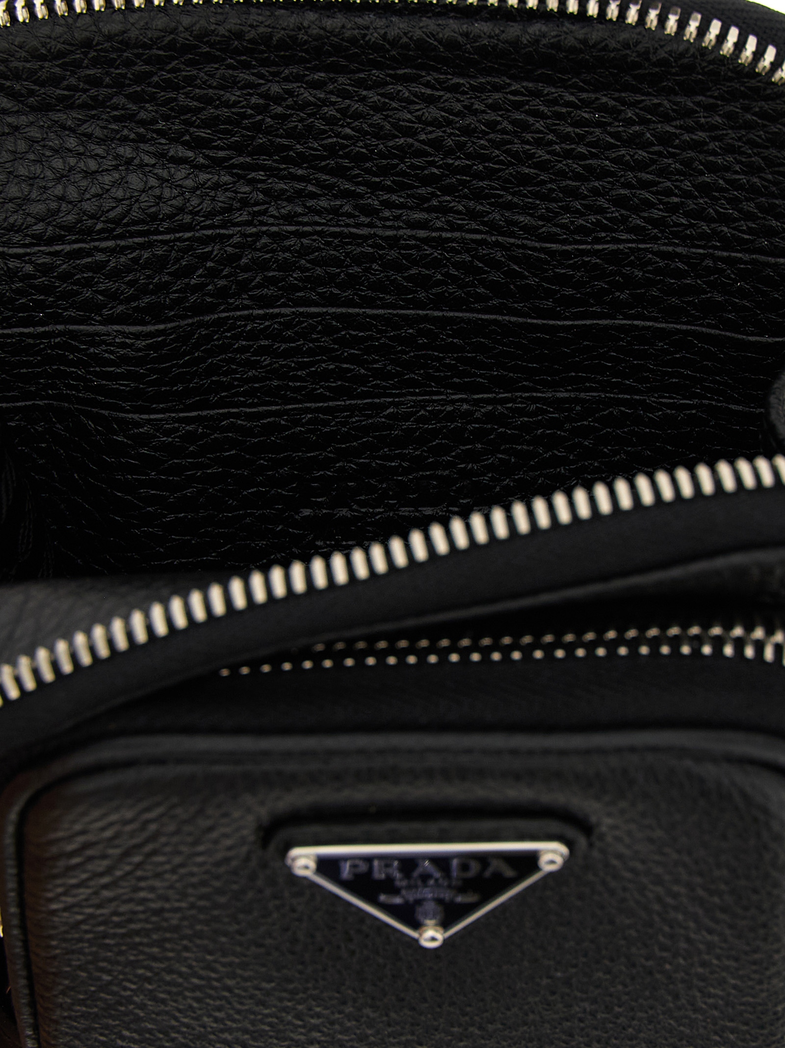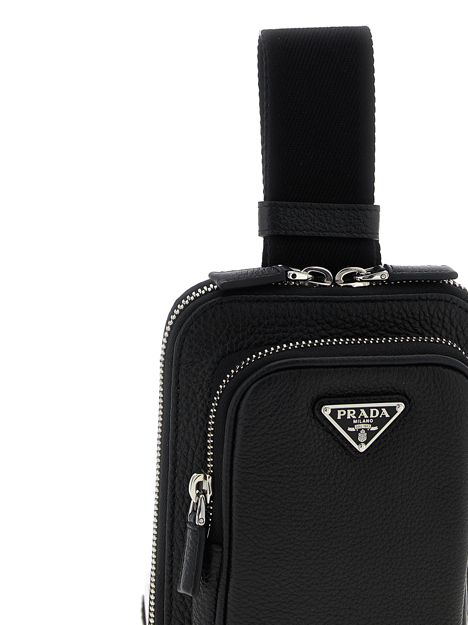 Hammered leather smartphone holder, top zip closure, front zip pocket and triangle logo in enameled metal, adjustable nylon tape shoulder strap.