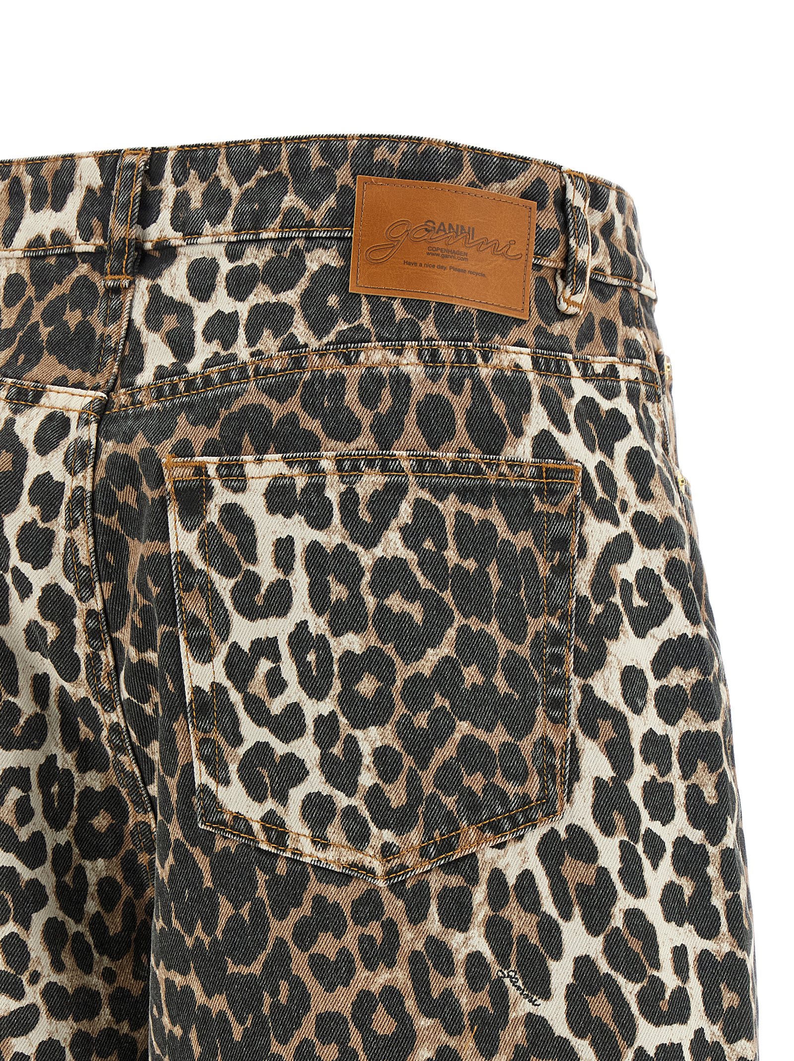 ‘Leopard Printed Stary’ non-stretch denim jeans with GANNI leopard print, mid waist, crop model, barrel leg with curved side stitching, zip and front button closure, five pockets, back logo tag.