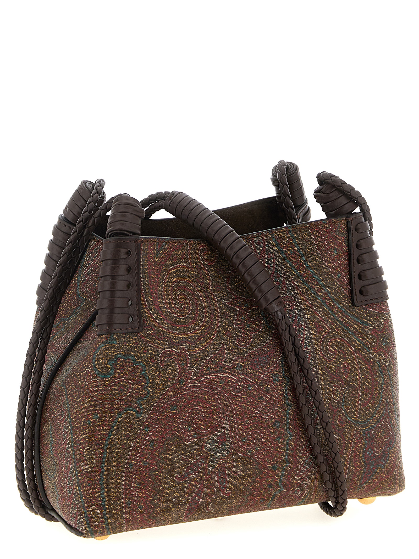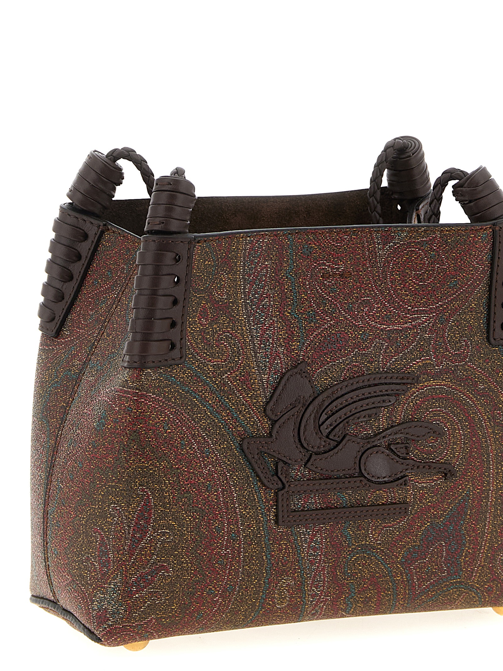 ‘Libra’ mini shoulder bag in matt-grain coated Paisley jacquard cotton fabric with canvas lining, front leather logo patch, snap hook closure, double woven leather handle, suede lining.