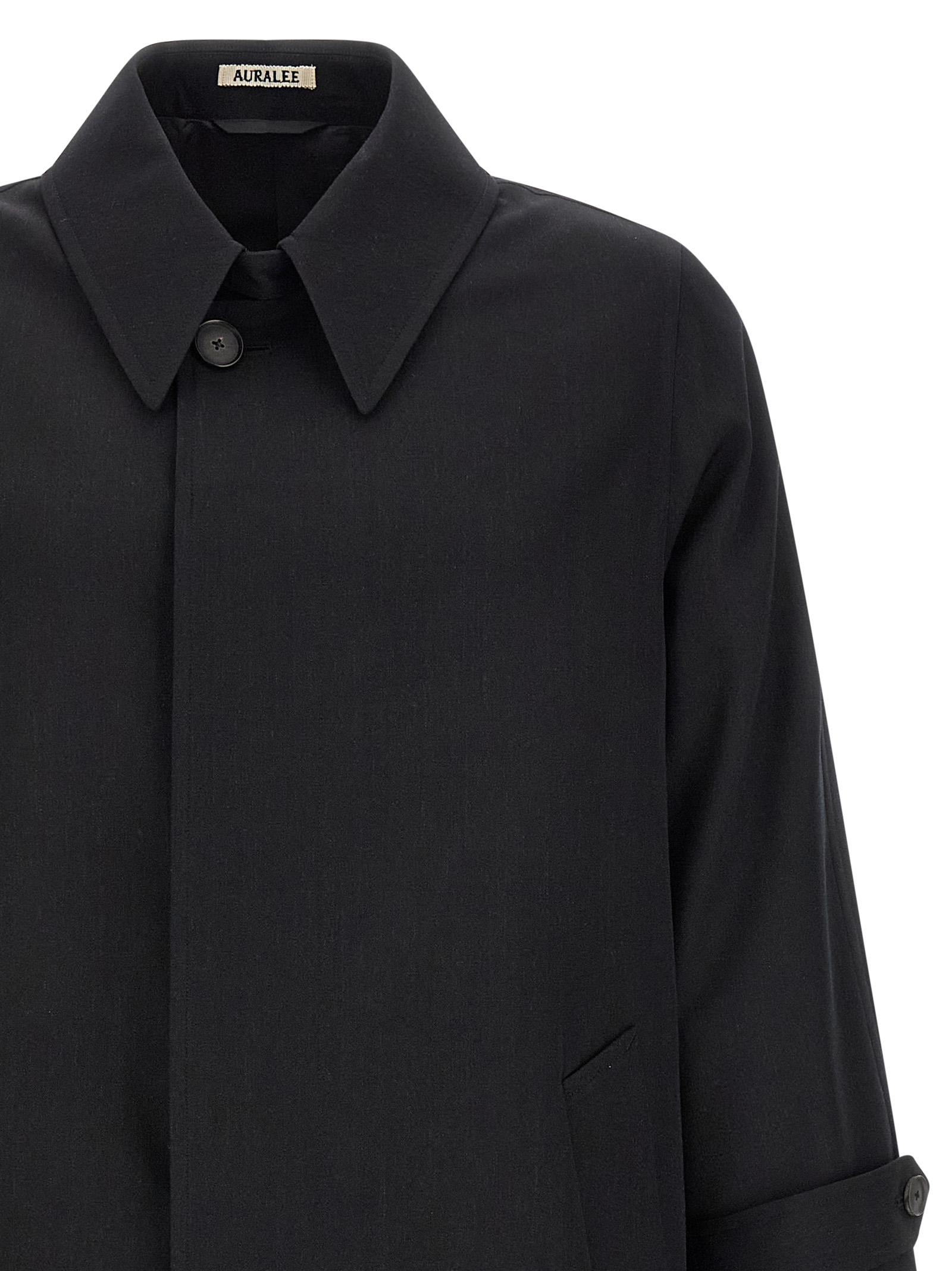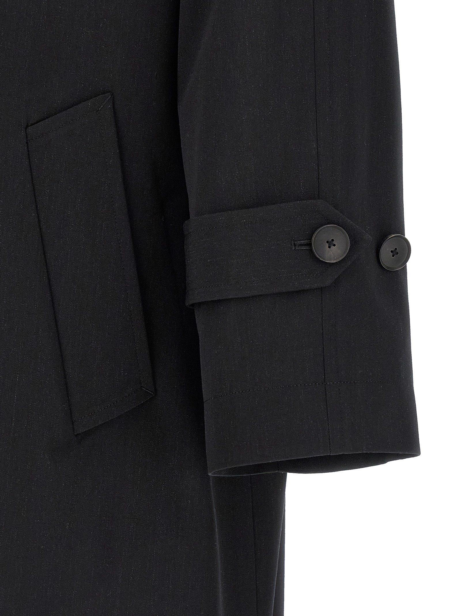 ‘Light wool Gabardine’ trench coat in lightweight fabric, straight fit with regular fit, shirt collar with chin strap with button, front closure with concealed buttons, vertical pockets, back split, long sleeves with strap and button.