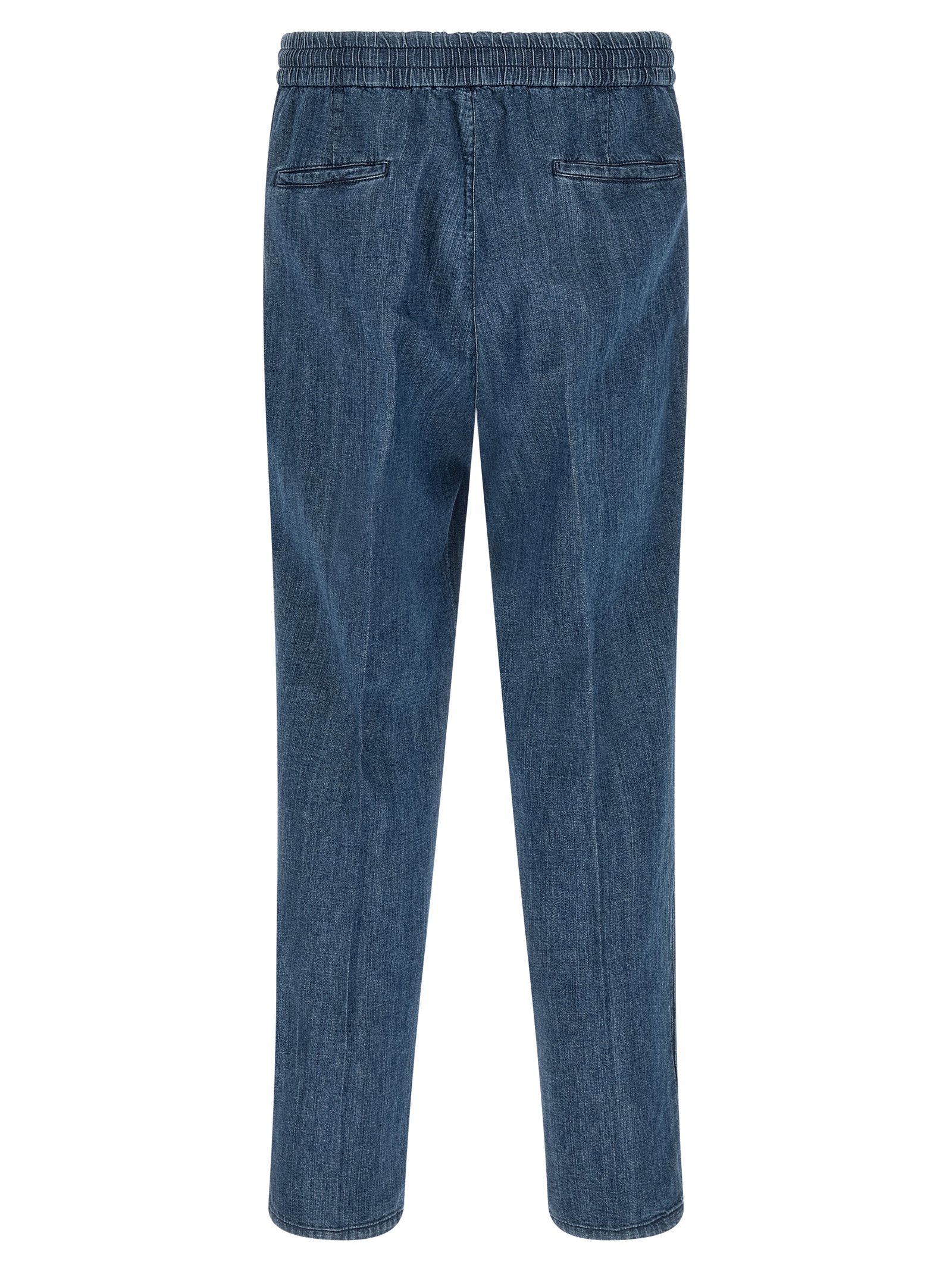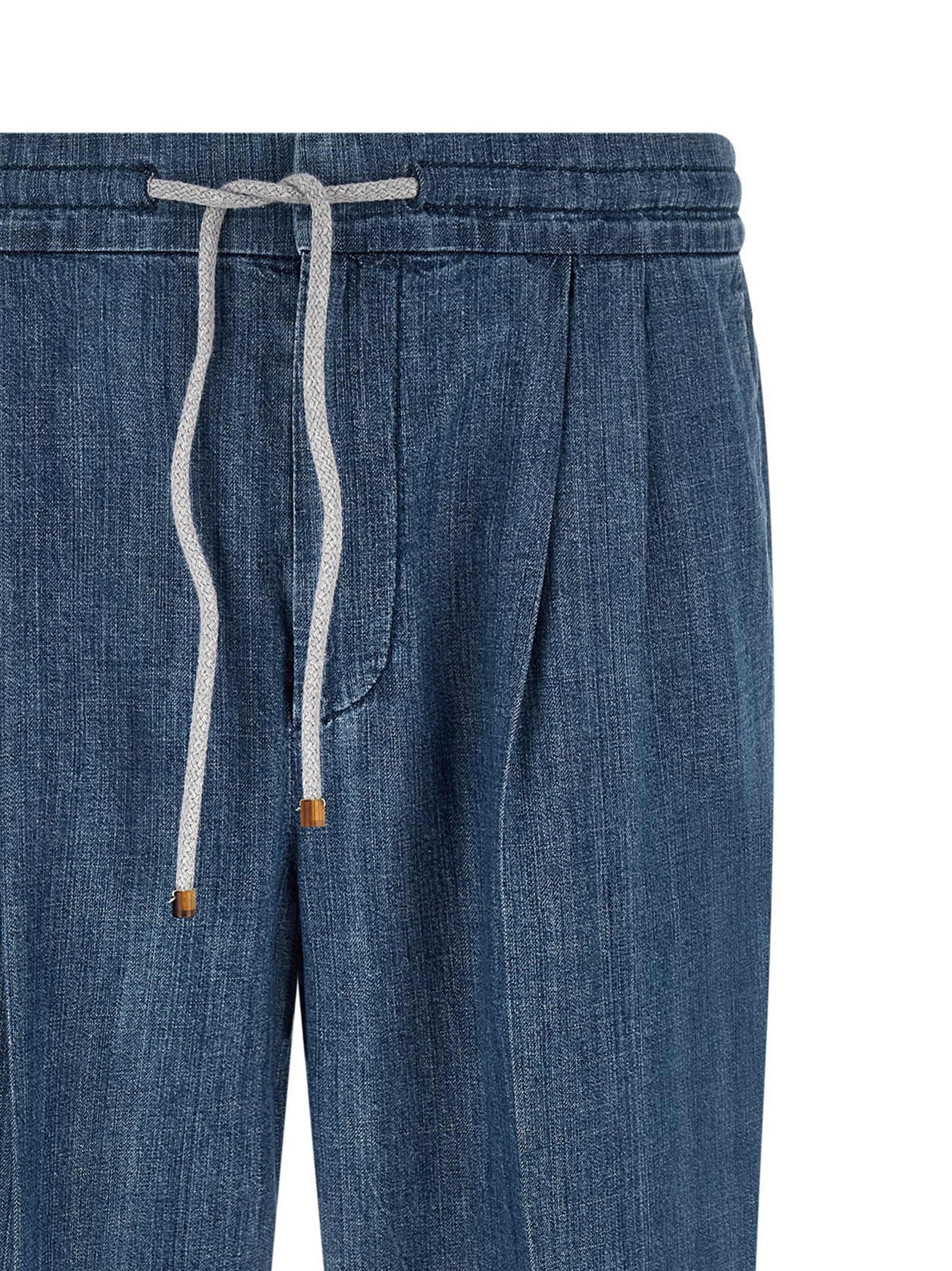 Light pure cotton denim jeans with fluid silhouette, soft volume fit on the pelvis, slightly lowered waist and close leg line, double pleats, stretched pleat, drawstring elastic waistband, zip and hook closure, front American pockets, back welt pockets.