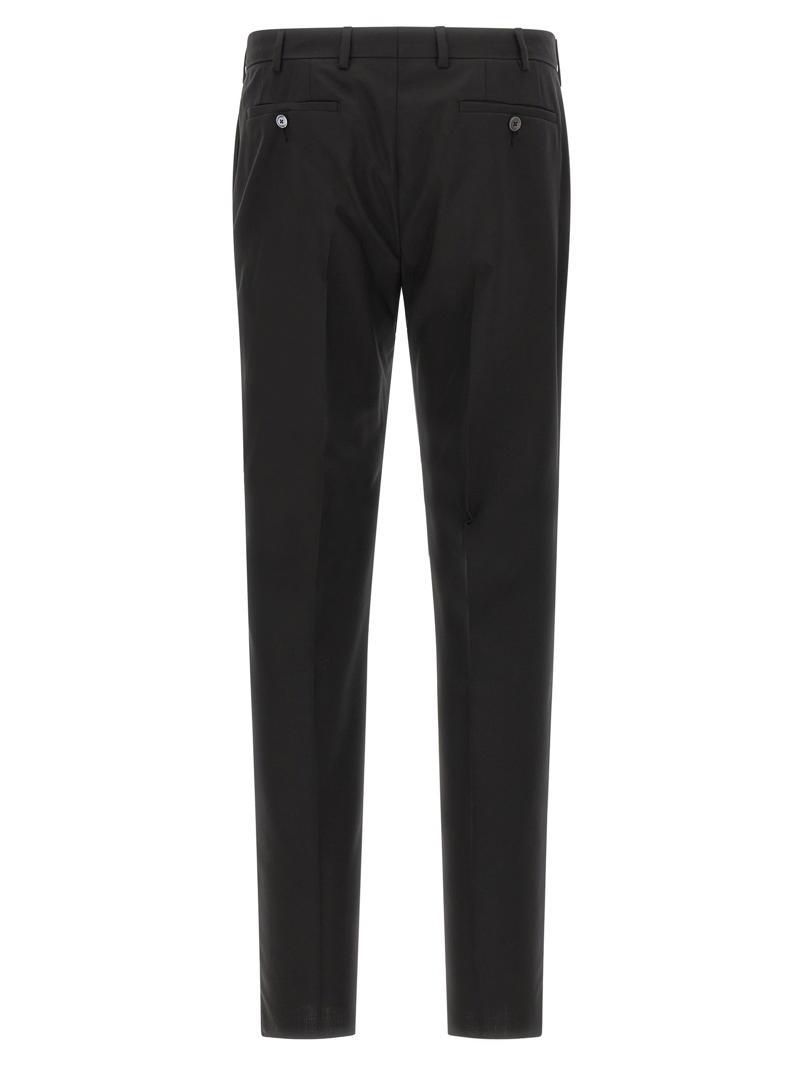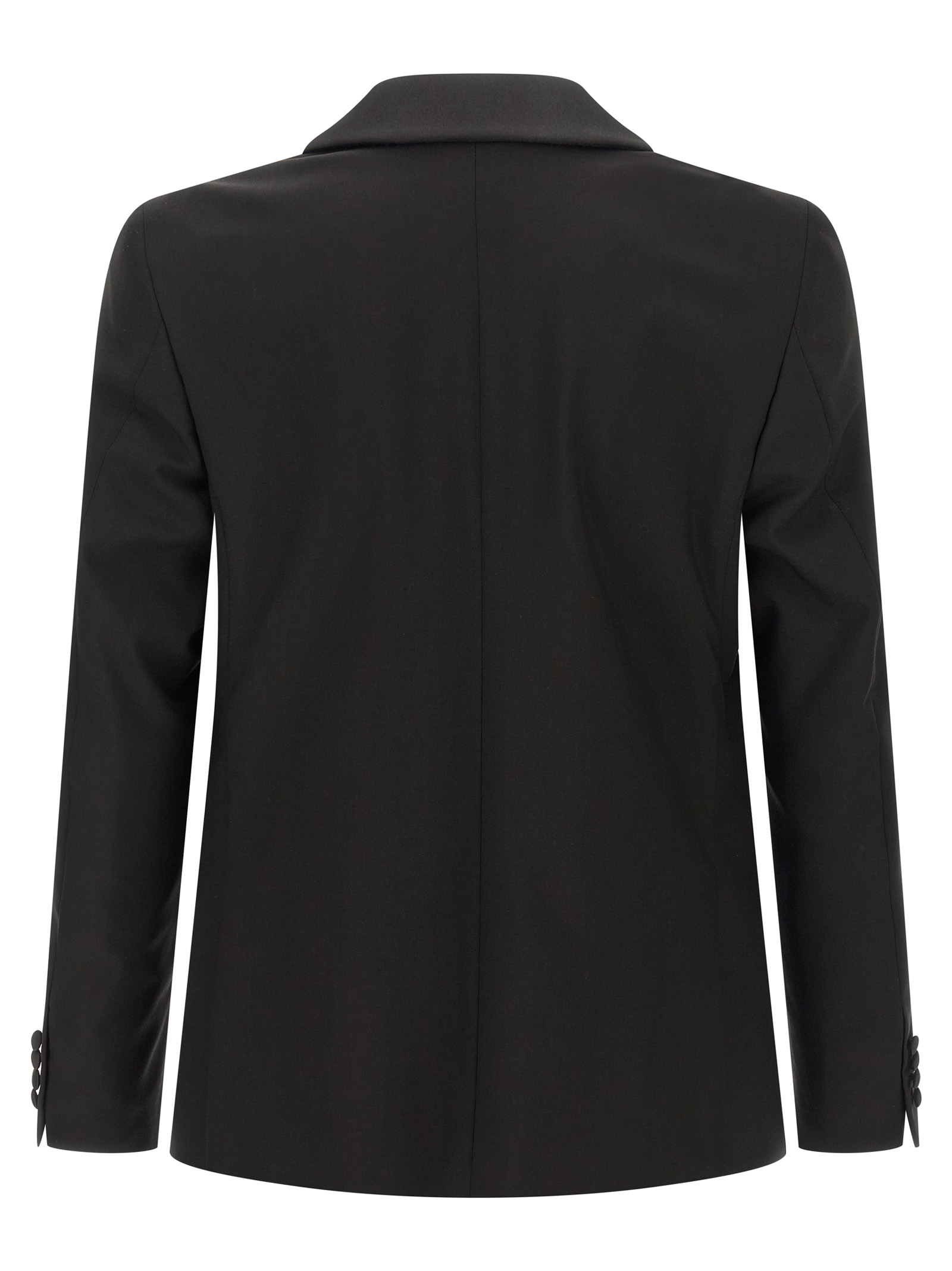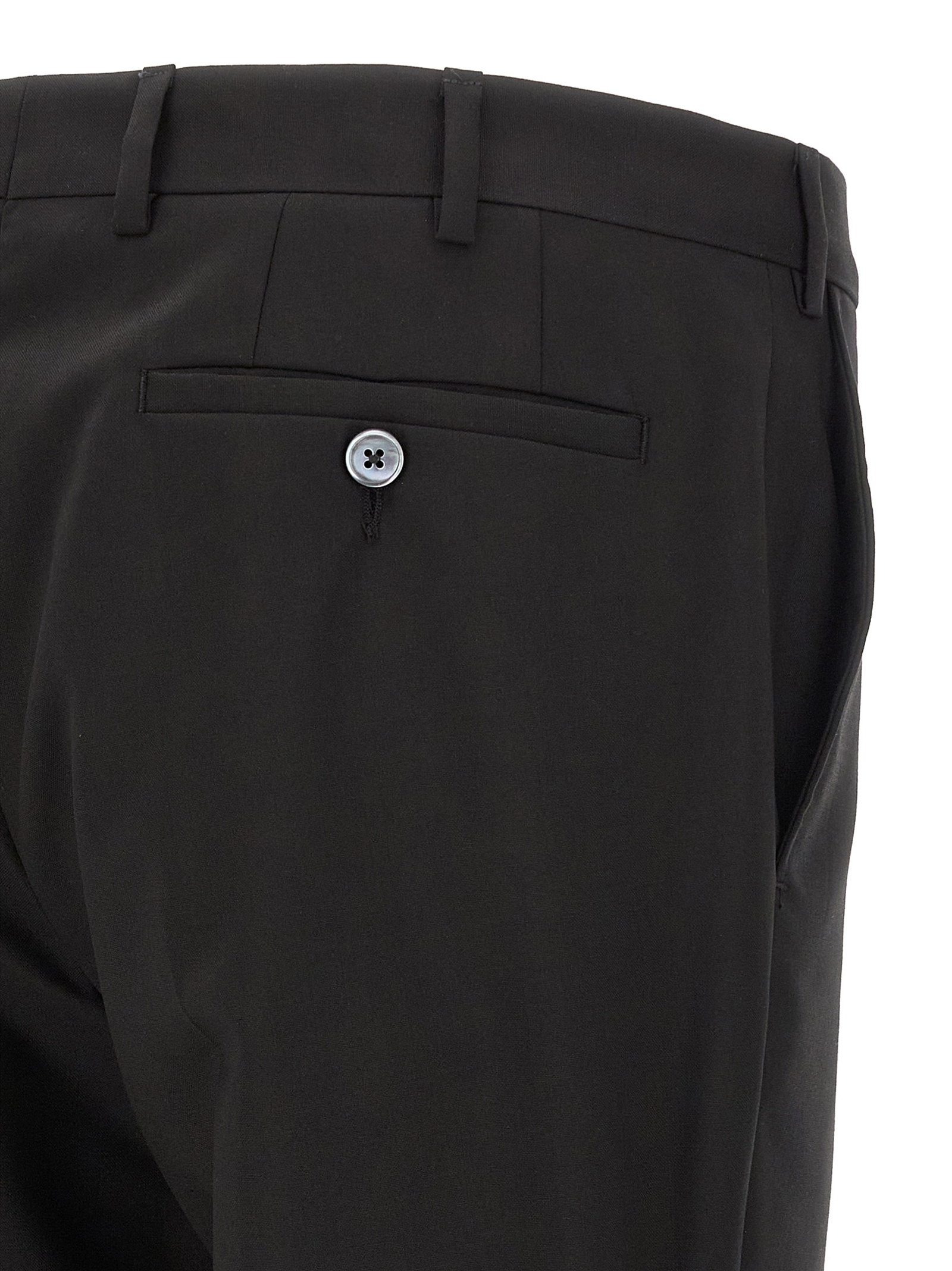 ‘linea Cerimonia’ wool dress consisting of single-breasted blazer with single button closure, tonal satin details, shawl collar, breast pocket, patch pockets, viscose lining, two inner pockets, buttonhole cuffs, back slits and trousers with stretched pleat, front pockets americane”, back welt pockets, front zip and button closure, viscose lining.