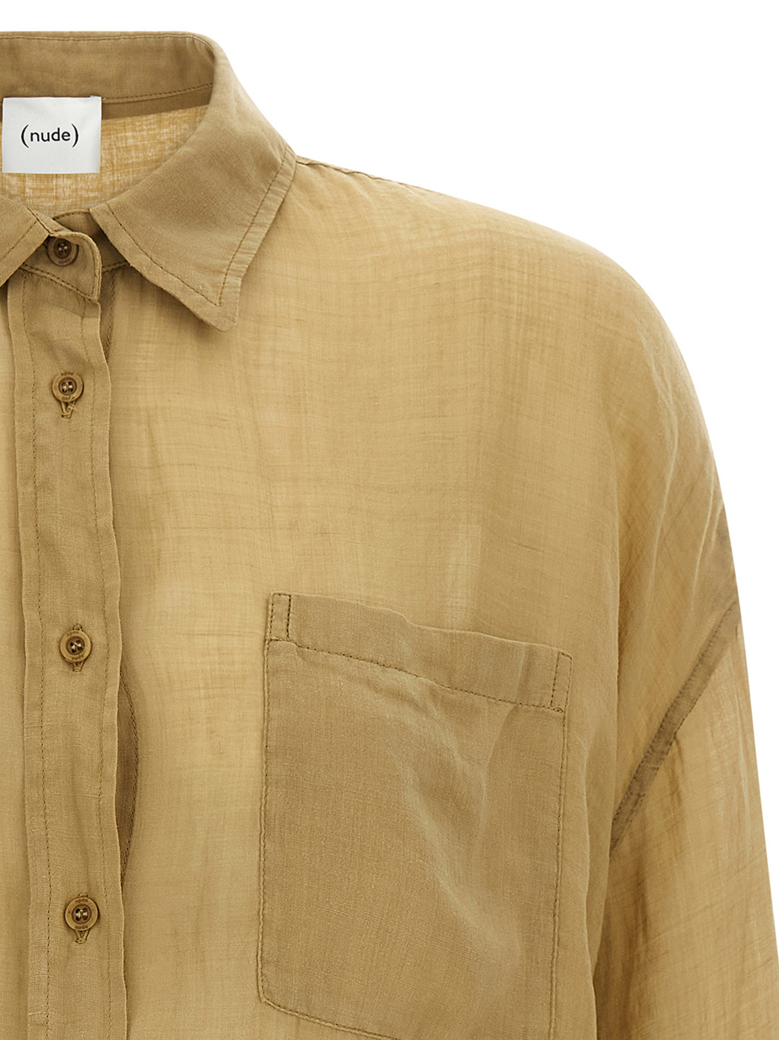 Linen blend shirt with lower part coated with laminated paint, slightly crop model, breast pocket, front button closure, long sleeves with cuffs and dropped shoulders, drawstring on the hem.