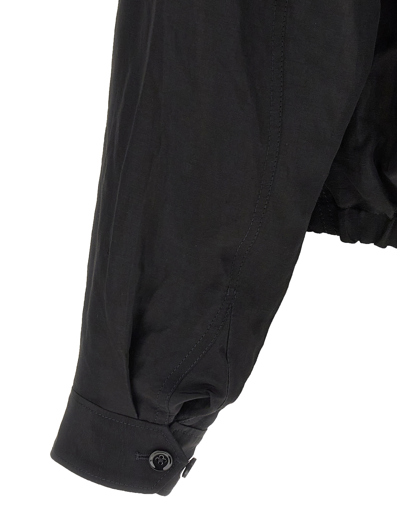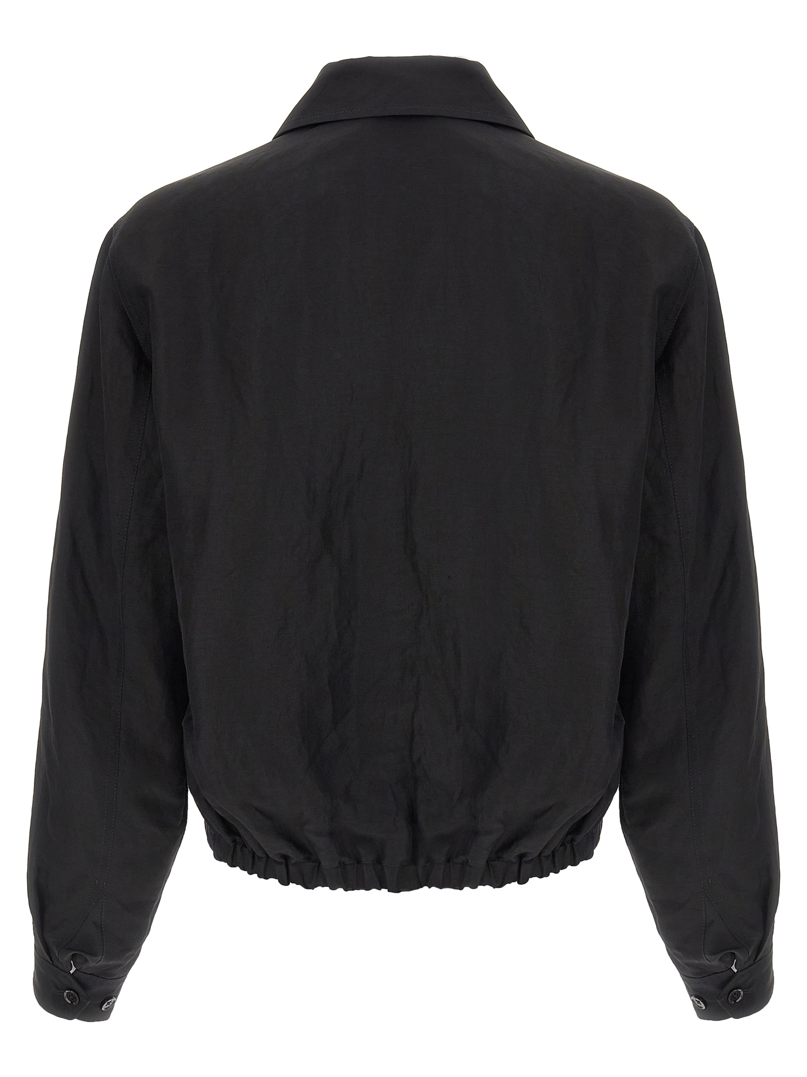 Breathable and durable linen blend jacket, cotton lining, shirt collar with button to turn it into a high neck, front zip closure, pockets, long sleeves with cuffs and slightly dropped shoulder, back elastic on the hem.