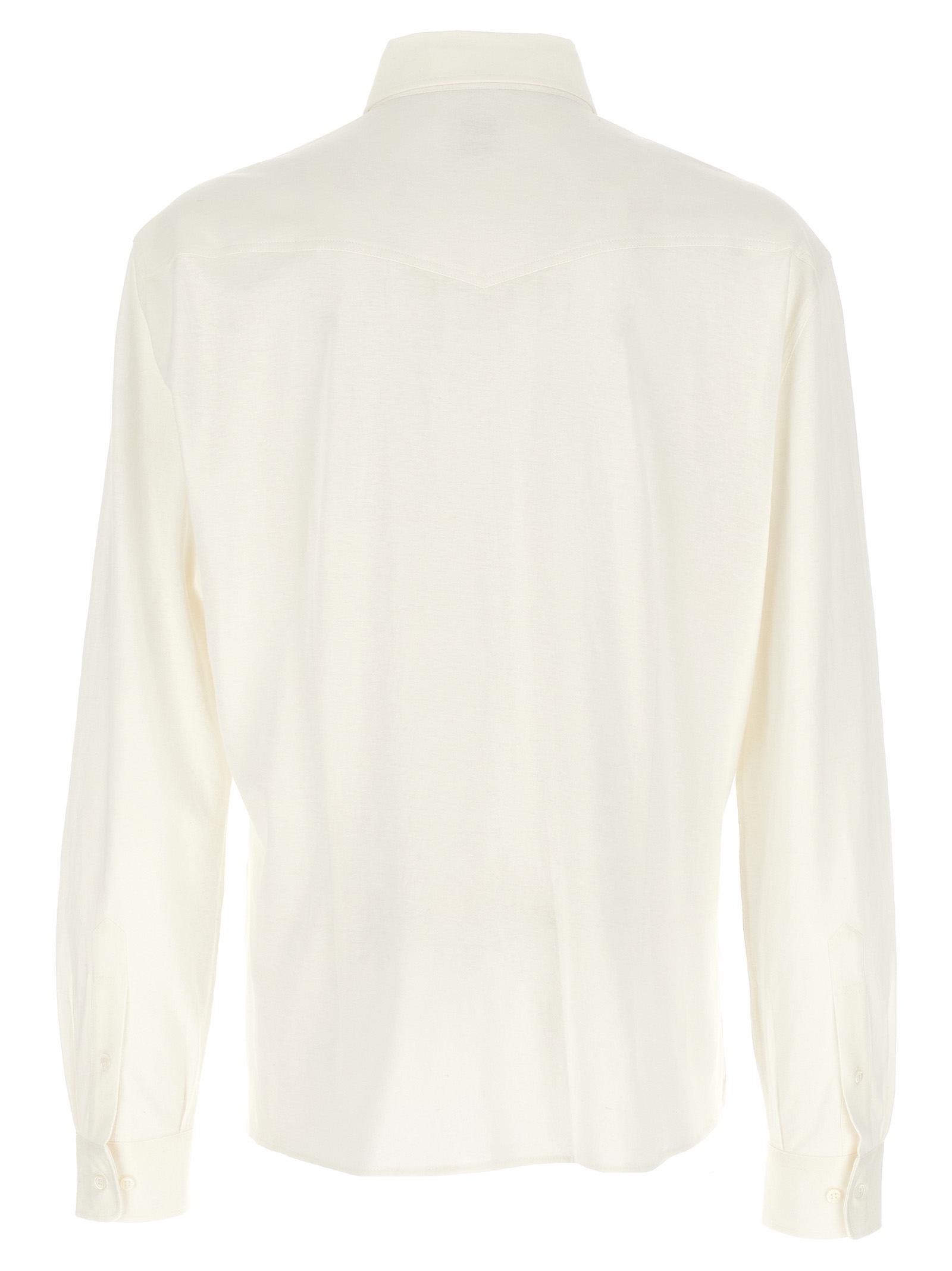 Linen and cotton blend shirt with front snap button closure, pockets, long cuffed sleeves.