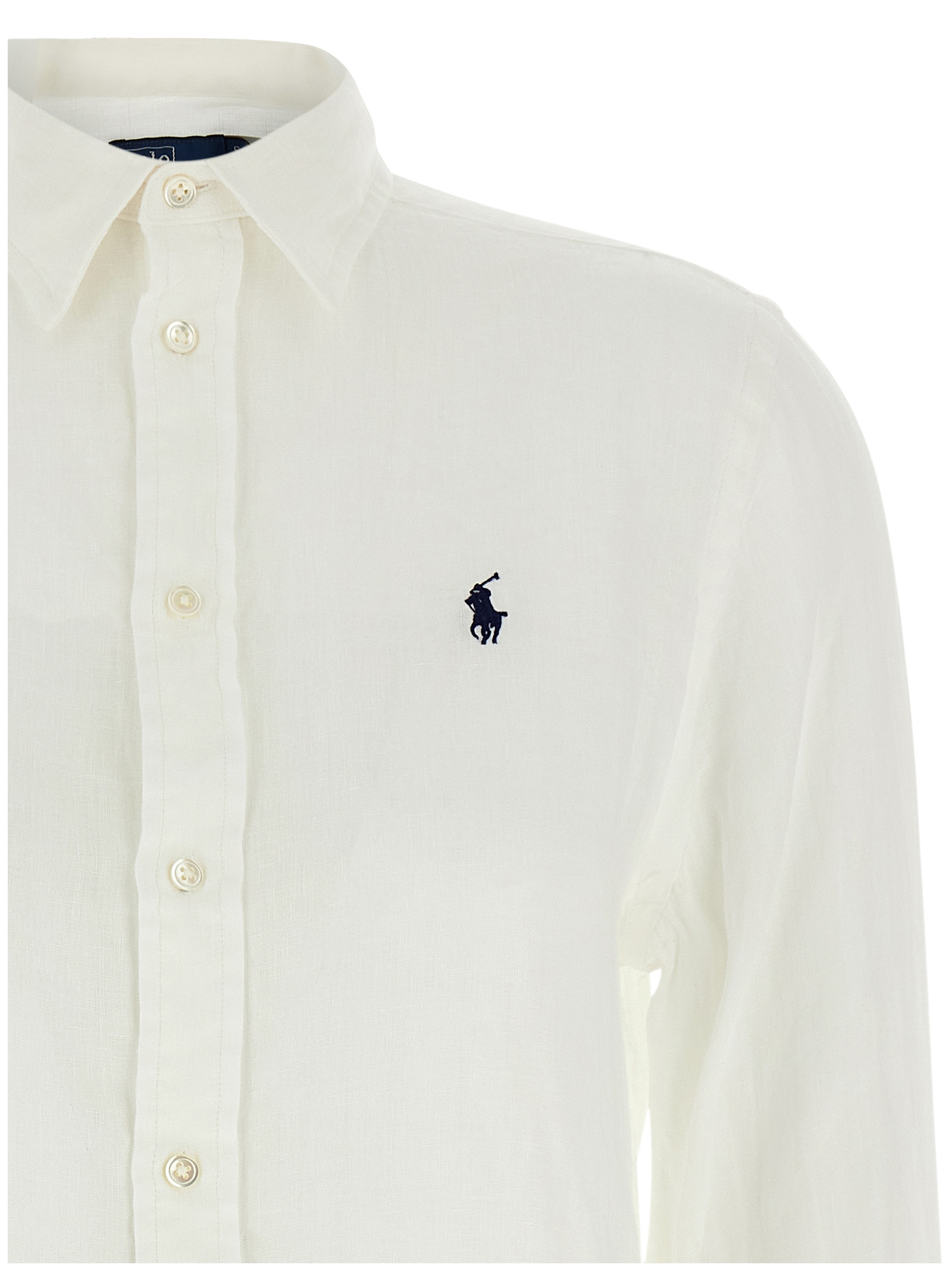 Linen shirt, front logo embroidery, button closure, long cuffed sleeves.