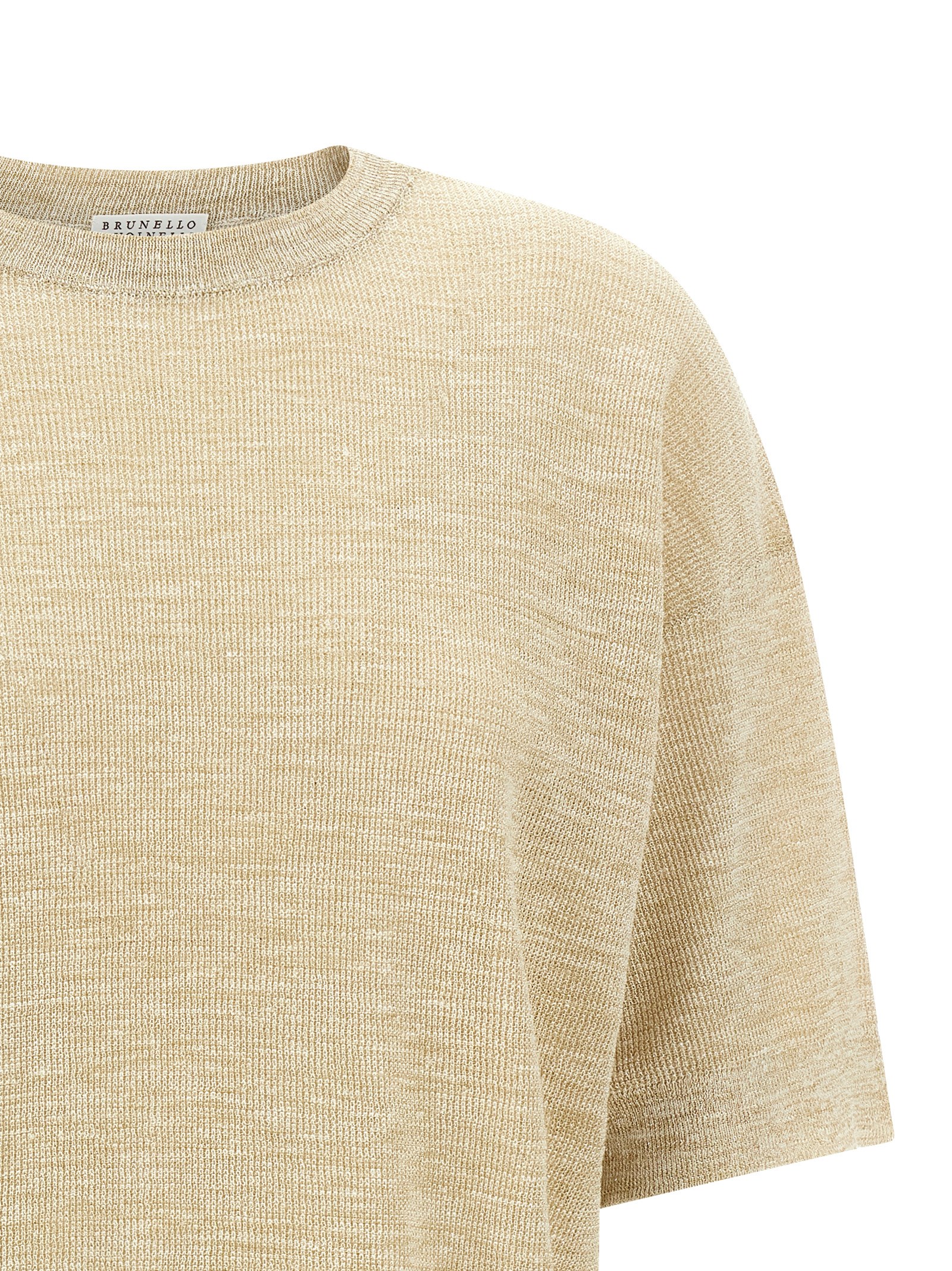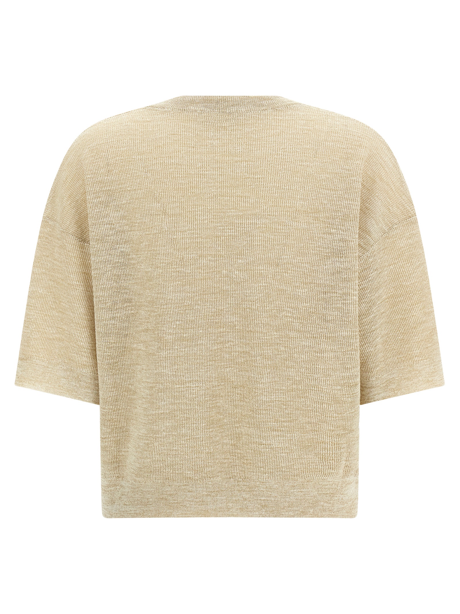 Linen blend knit T-shirt, weave tightly knitted, crew neck, straight design with dropped shoulder, short and wide sleeves.