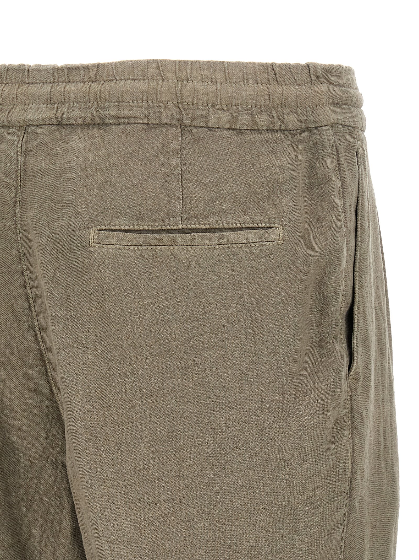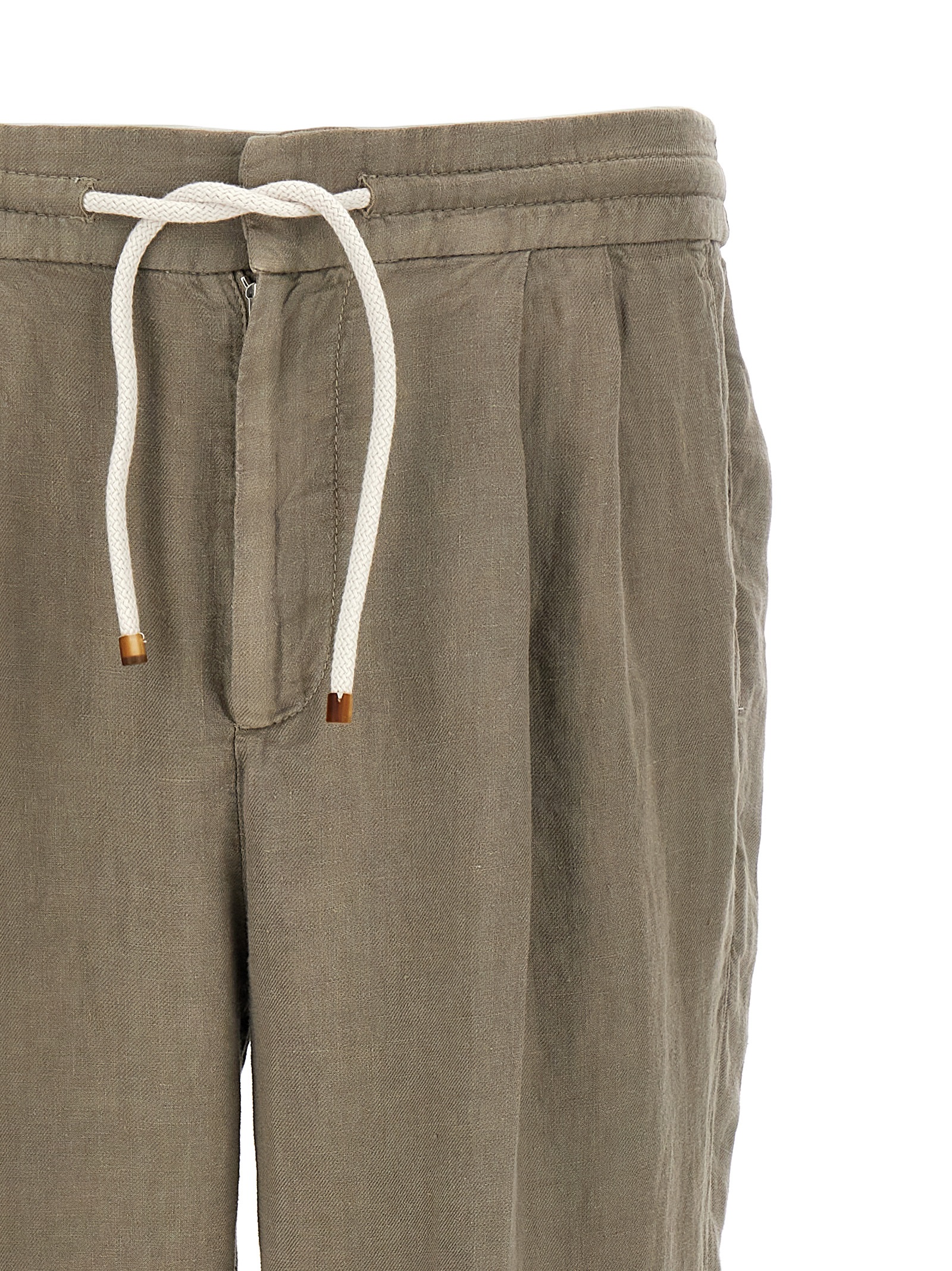 Garment-dyed linen pants, pinces, straight leg with stretched crease, hook and button zip closure, adjustable drawstring elastic at the waist, pockets.