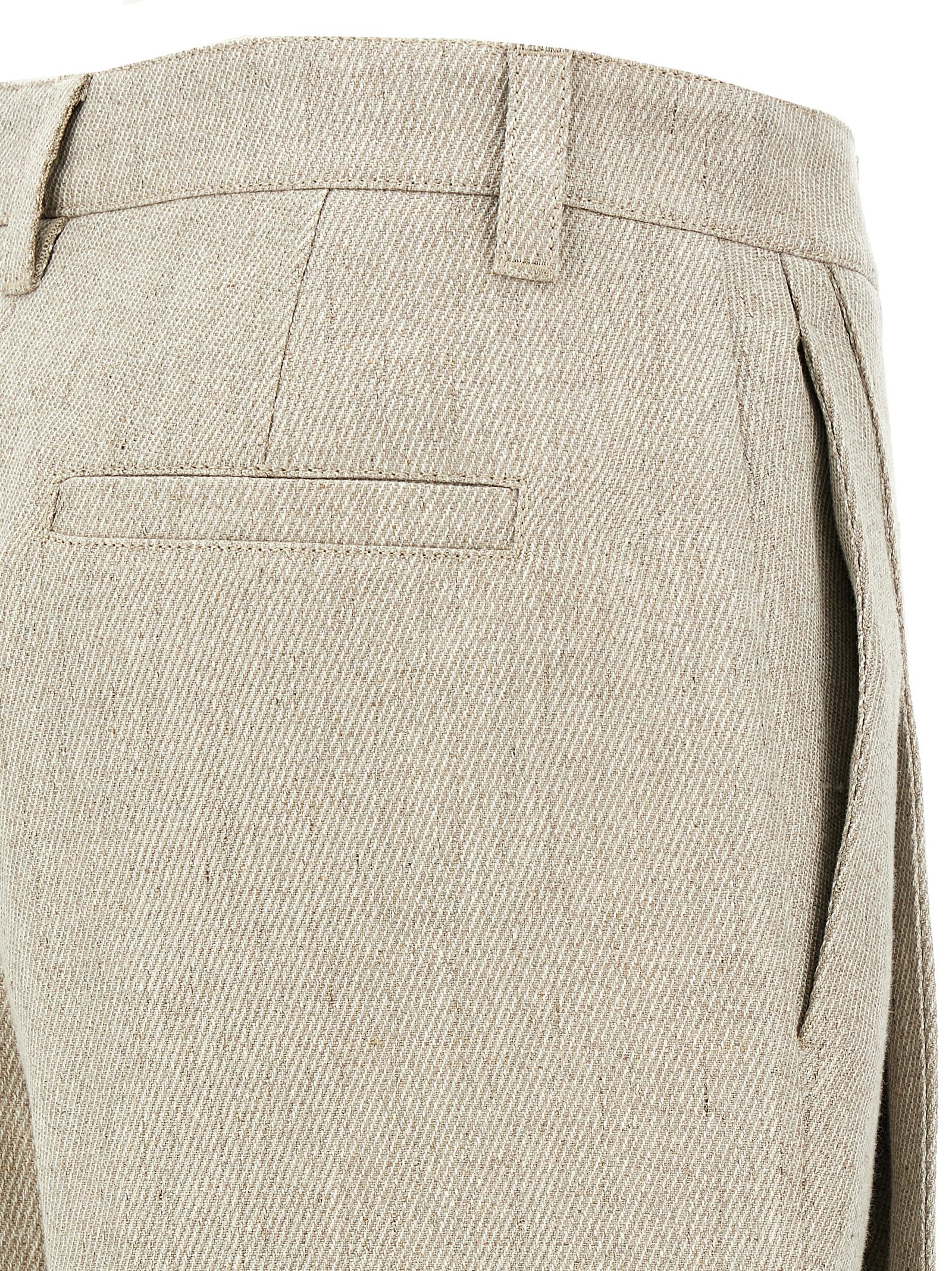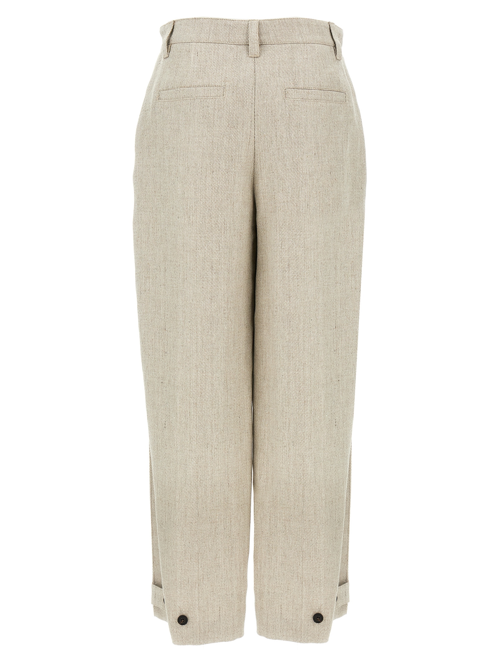 Linen cover trousers, slouchy model with full-leg pincer, front zip and button closure, adjustable leg bottom, pockets.